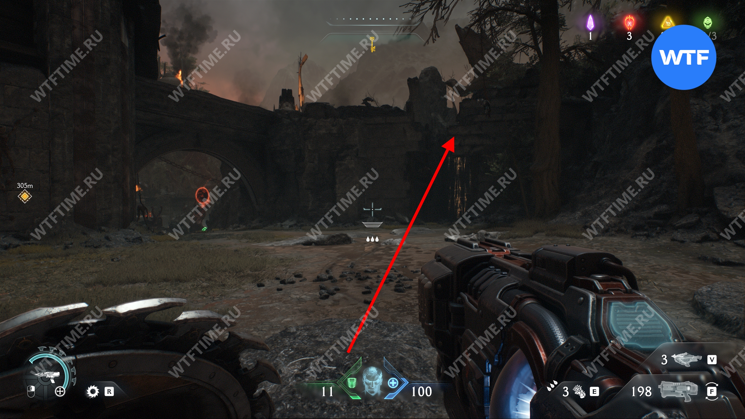 От Святилища посмотрите в сторону желтого квестового маркера и увидите, что перед высокой башней тропа расходится в разные стороны. Идите налево, зачистите область от врагов и разломайте артиллерийскую пушку, стоящую прямо посреди этой области. На её месте появятся 8 золота, которые вы сможете забрать.