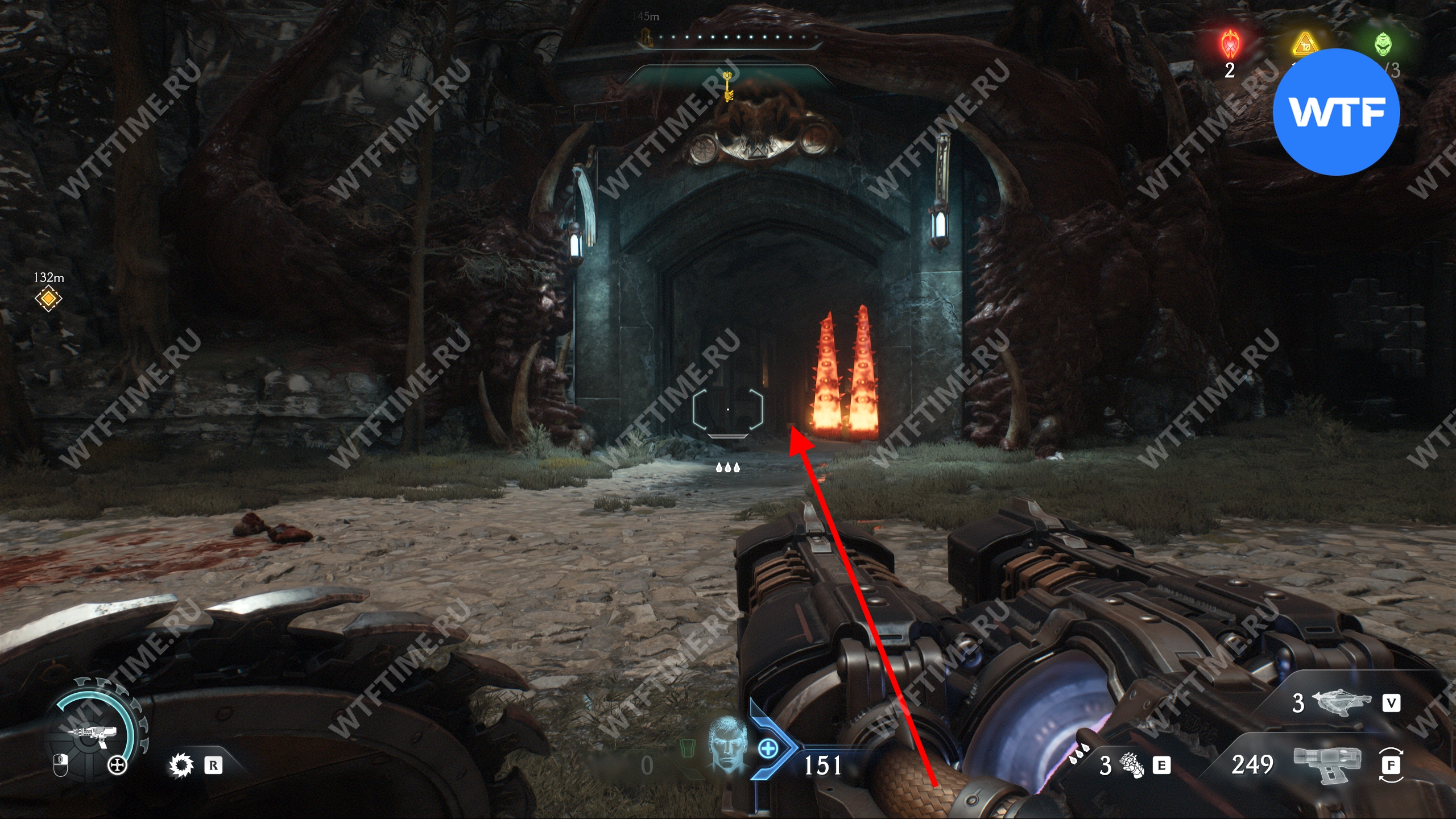 Сломайте металлические шипы, чтобы расчистить проход, и идите в сторону следующего крупного боя с врагом, отмеченного красным на карте. Победив главаря, вы получите демоническую сущность, увеличивающую максимум душ.