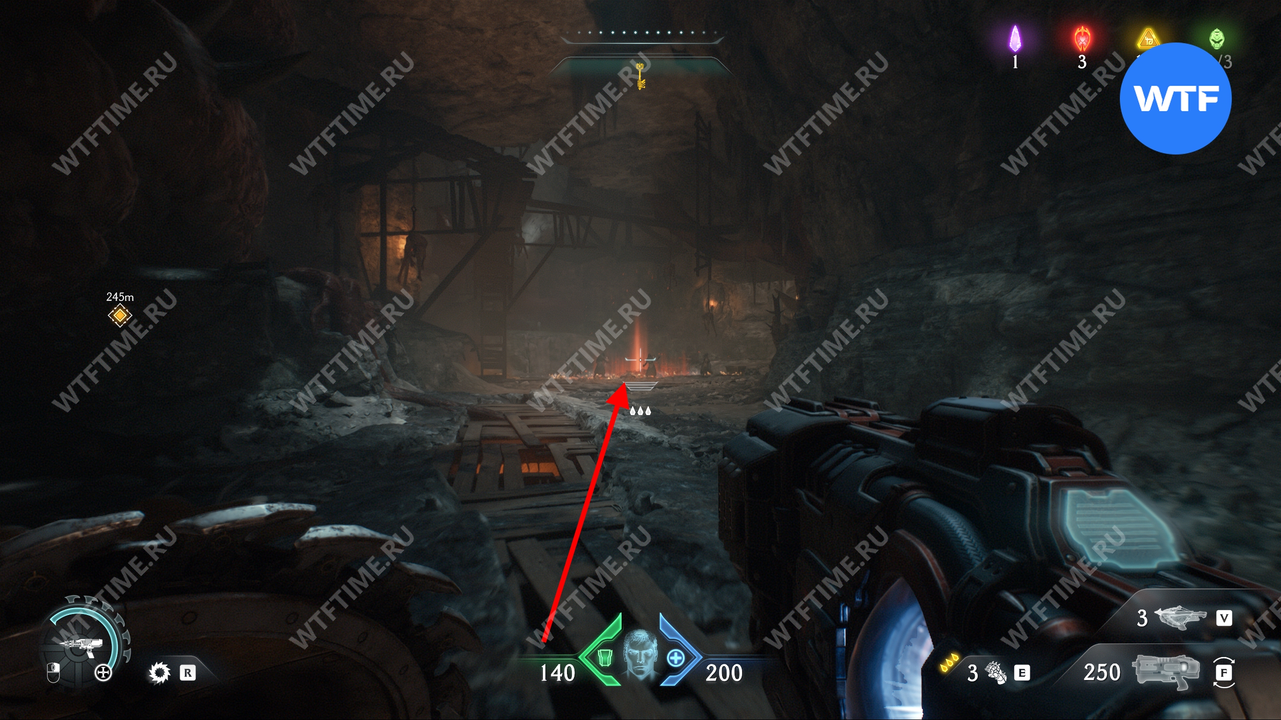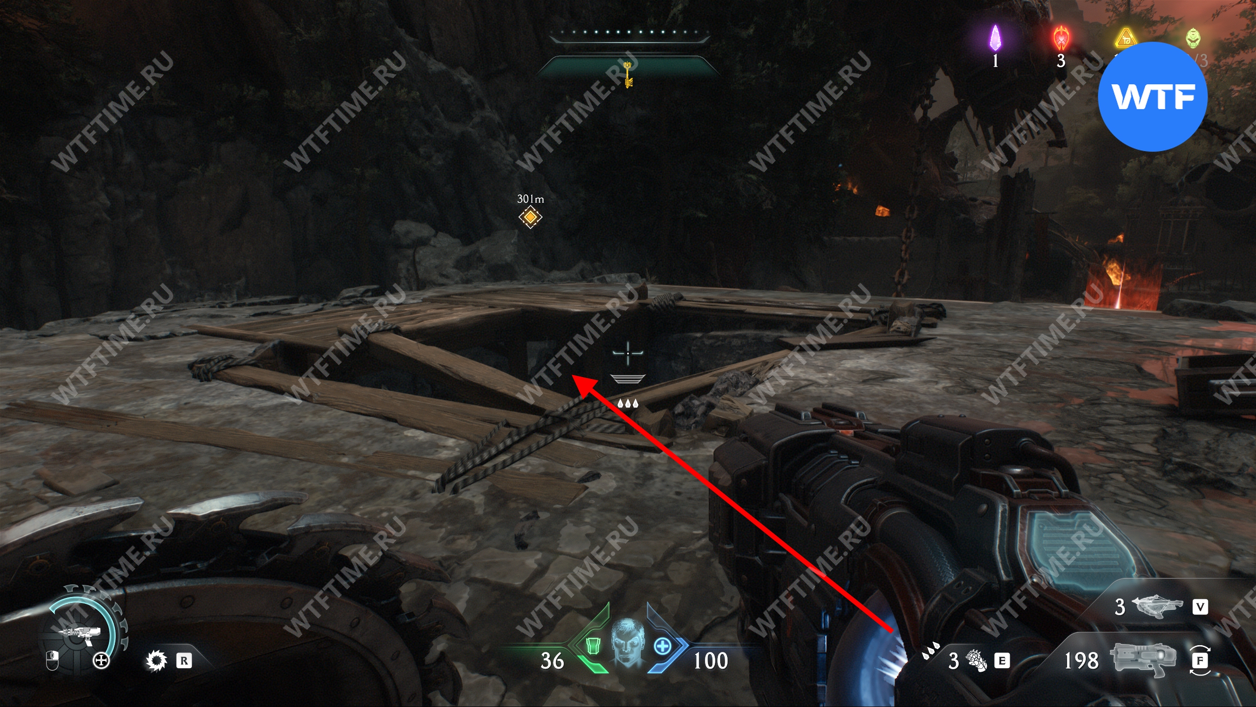 От сундука развернитесь и сделайте пару шагов вперед, чтобы увидеть артиллерийскую пушку. Уничтожьте её при помощи щита, после чего на этом месте появится дыра в земле.