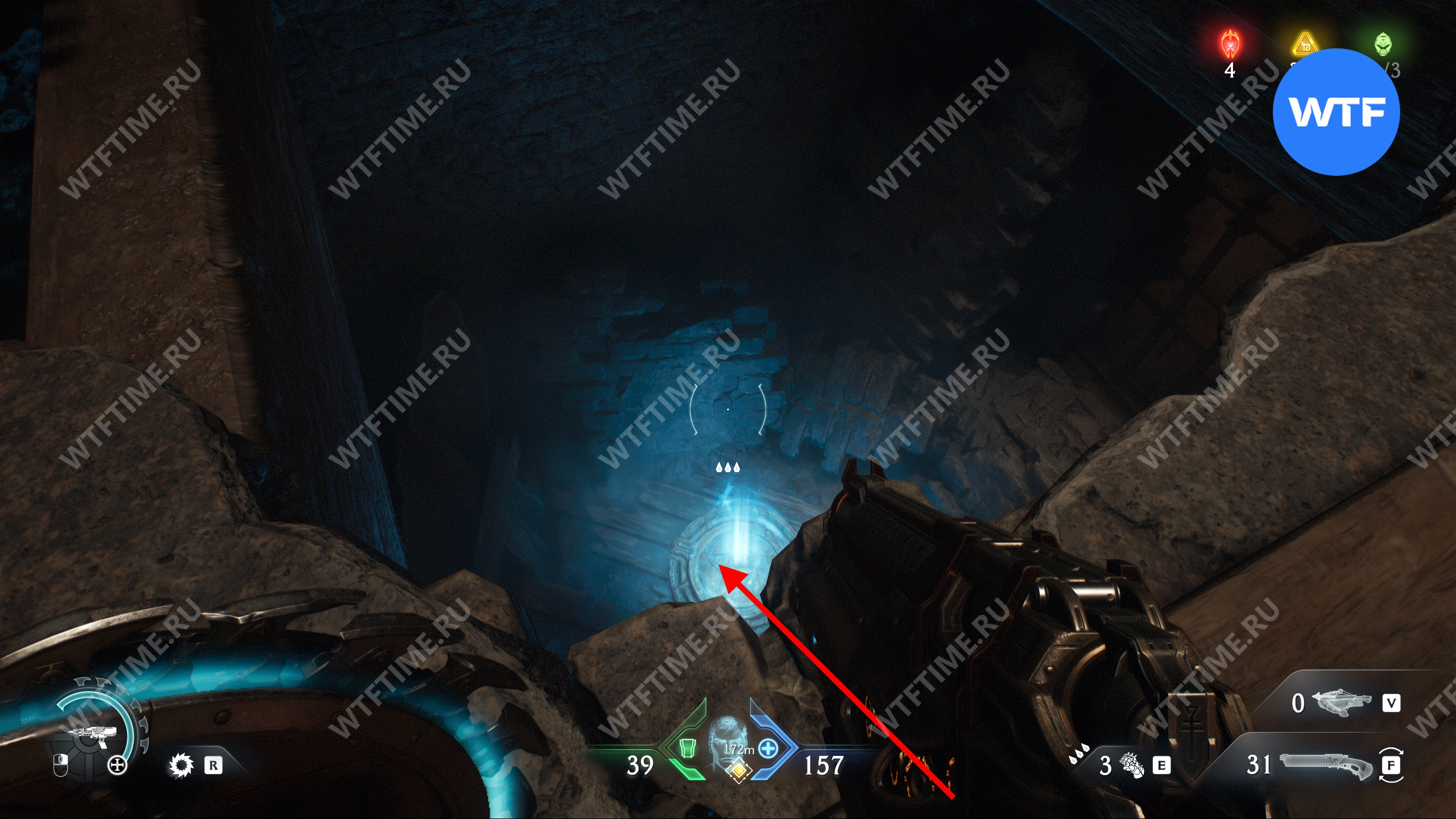 Продолжайте идти вперед, пока не подберете синий череп по сюжету. Не идите пока в ворота перед ним. Вместо этого развернитесь и идите налево, чтобы найти большую дыру в полу.
