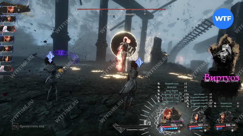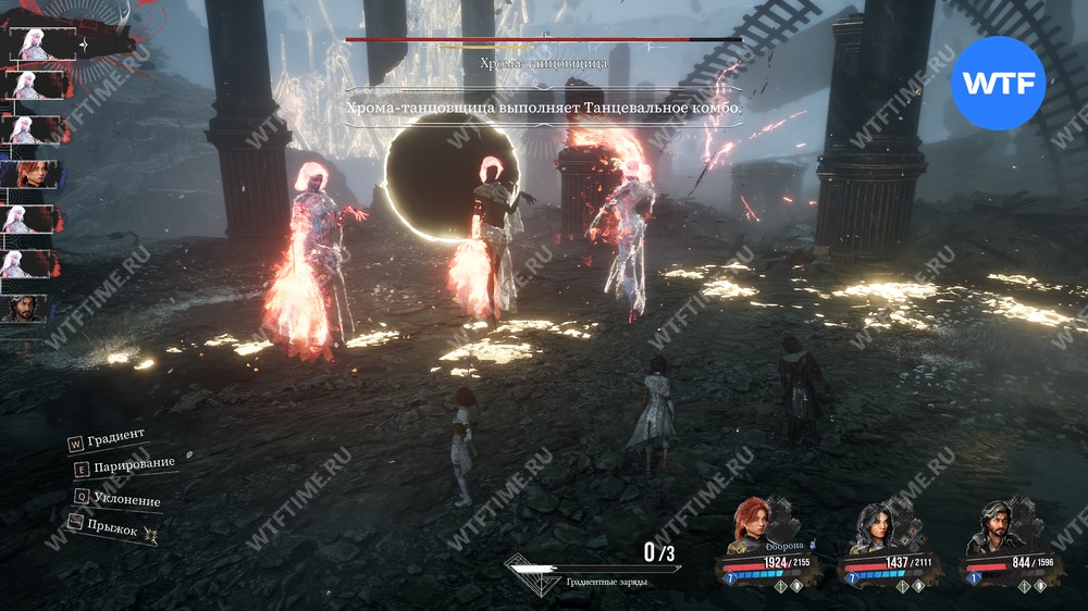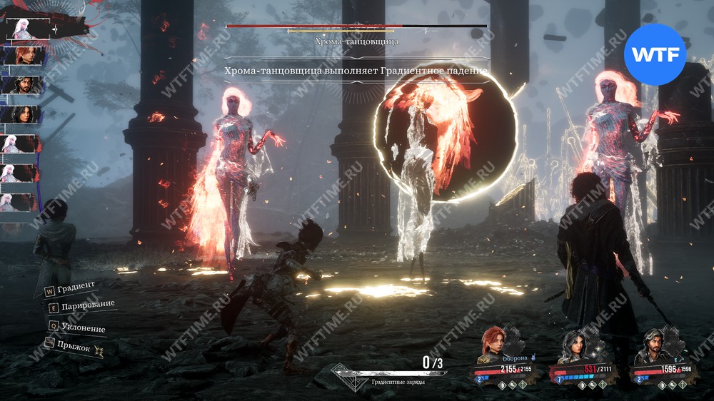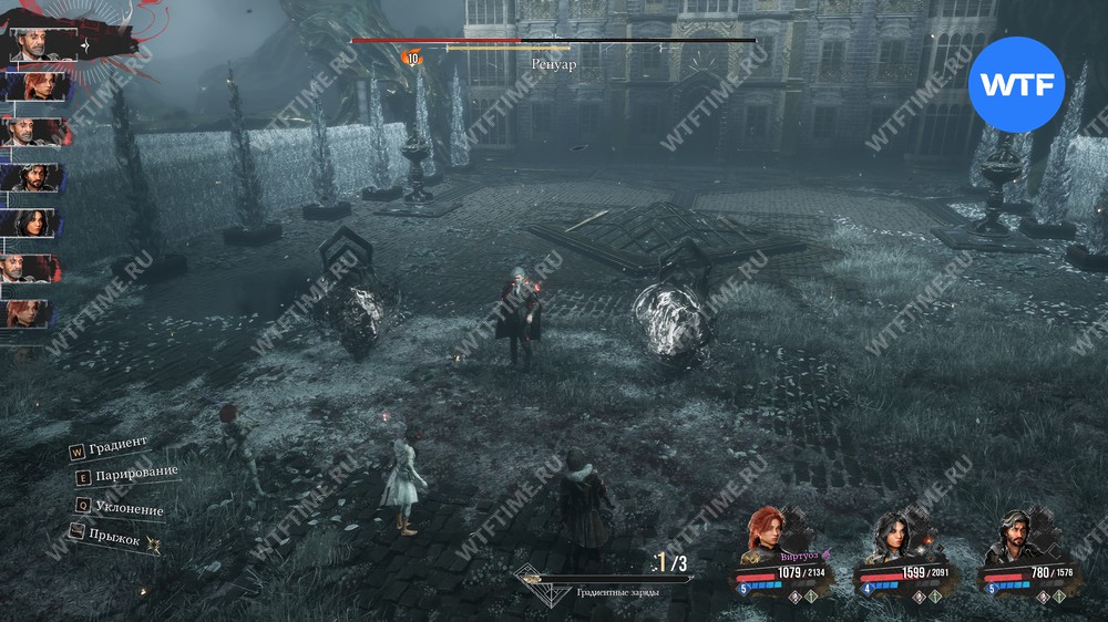 Помимо этого стоит обратить внимание на атаку, при которой Ренуар пытается стереть одного из ваших персонажей. Используйте контр-градиент, когда он собирается ударить по черной сфере, чтобы успеть парировать. Если пропустите удар, вернуть персонажа до конца боя будет нельзя.