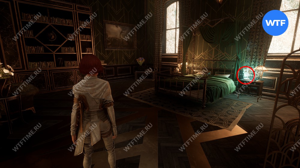Затем пройдите в следующую комнату и заберите журнал «Ренуар» на тумбочке у кровати. После этого спуститесь по лестнице в холл и пройдите через главные двери, чтобы вернуться обратно в Старый Люмьер.