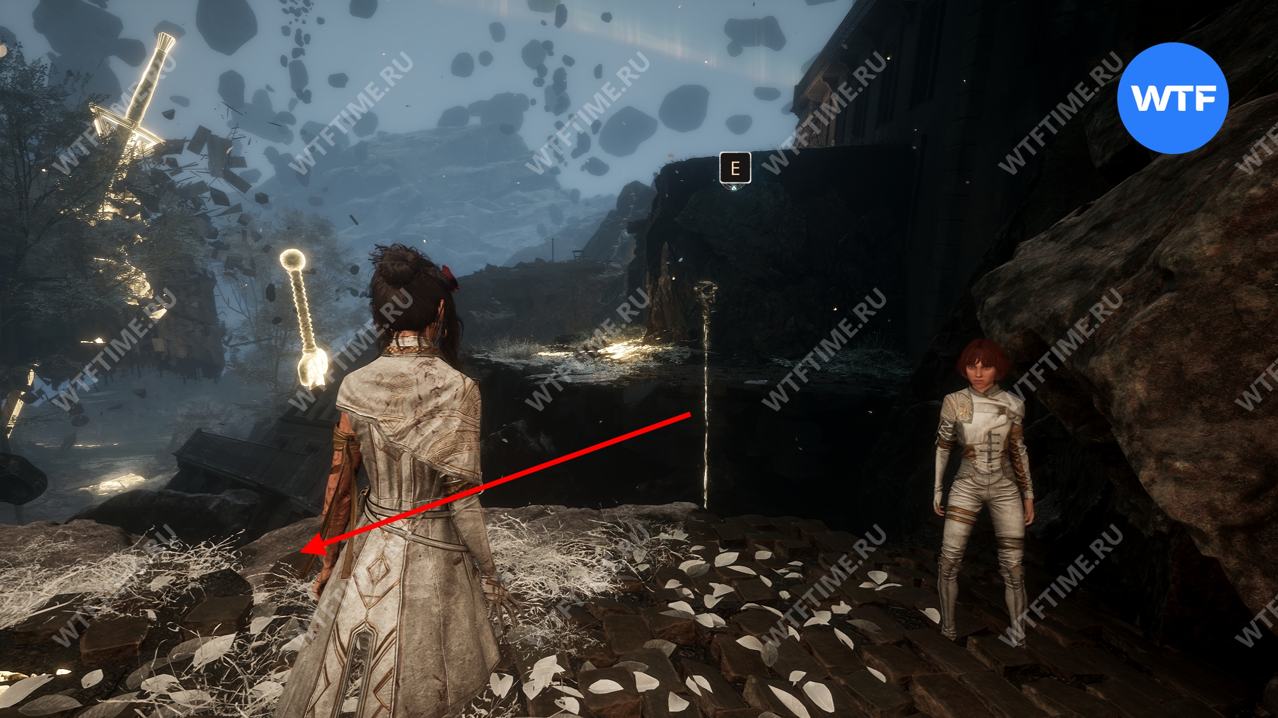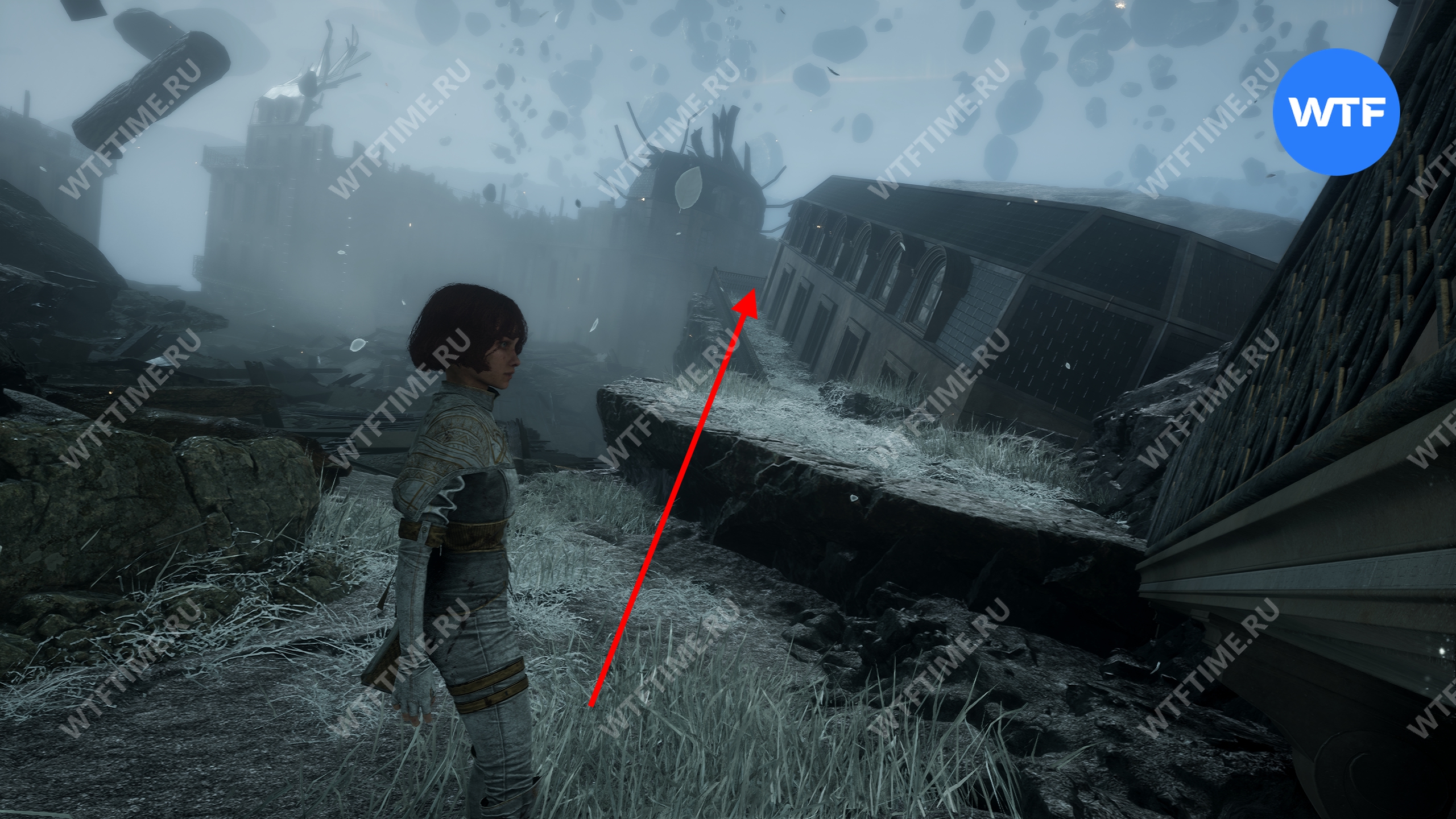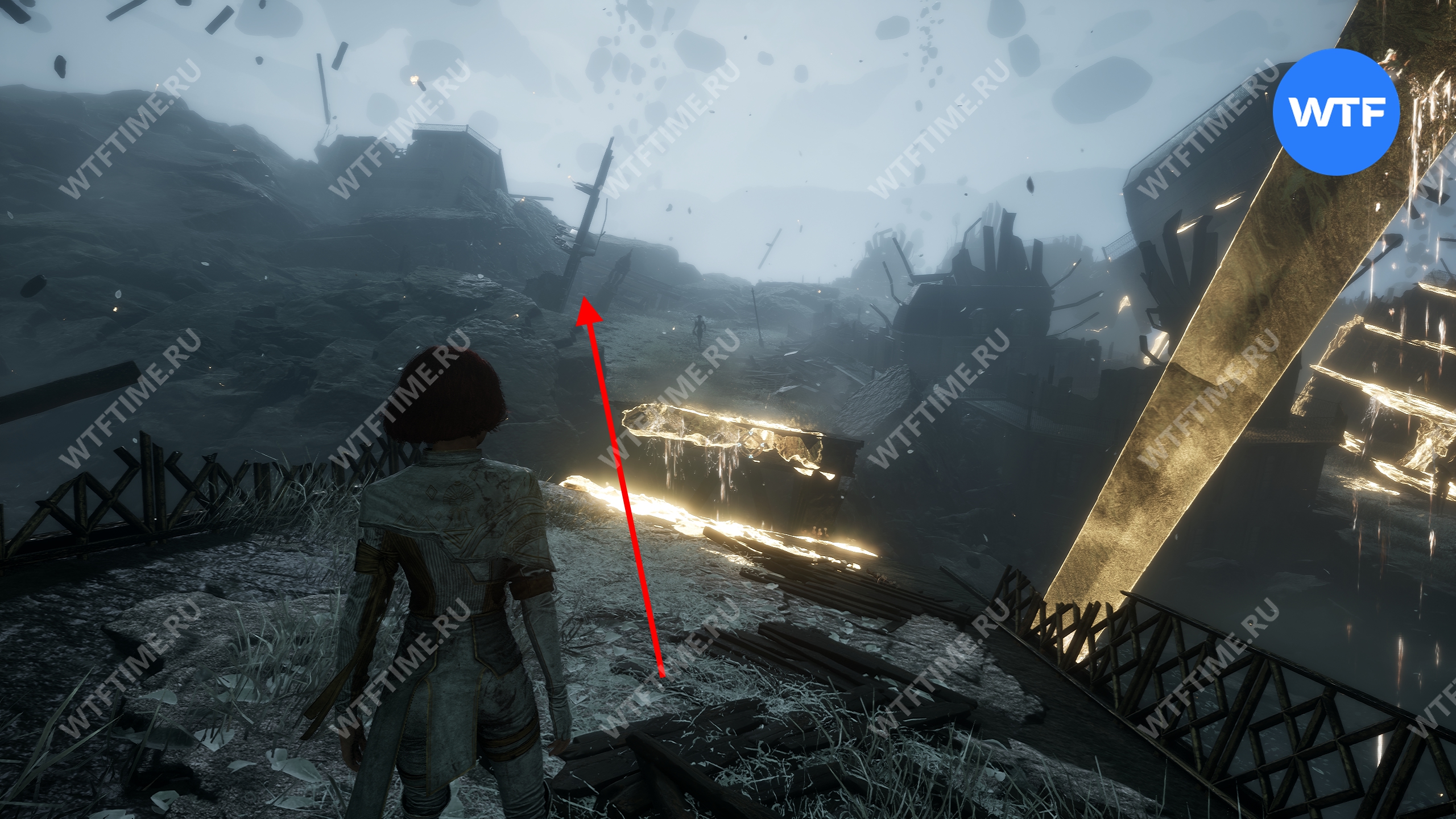 Вернитесь к флагу экспедиции «Правая улица» и от него бегите вперед по сюжетной тропе до упора. Пройдя мимо Тающего мужчины, вы вскоре окажетесь возле стены с опорами, по которым можно подняться наверх.