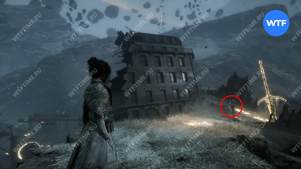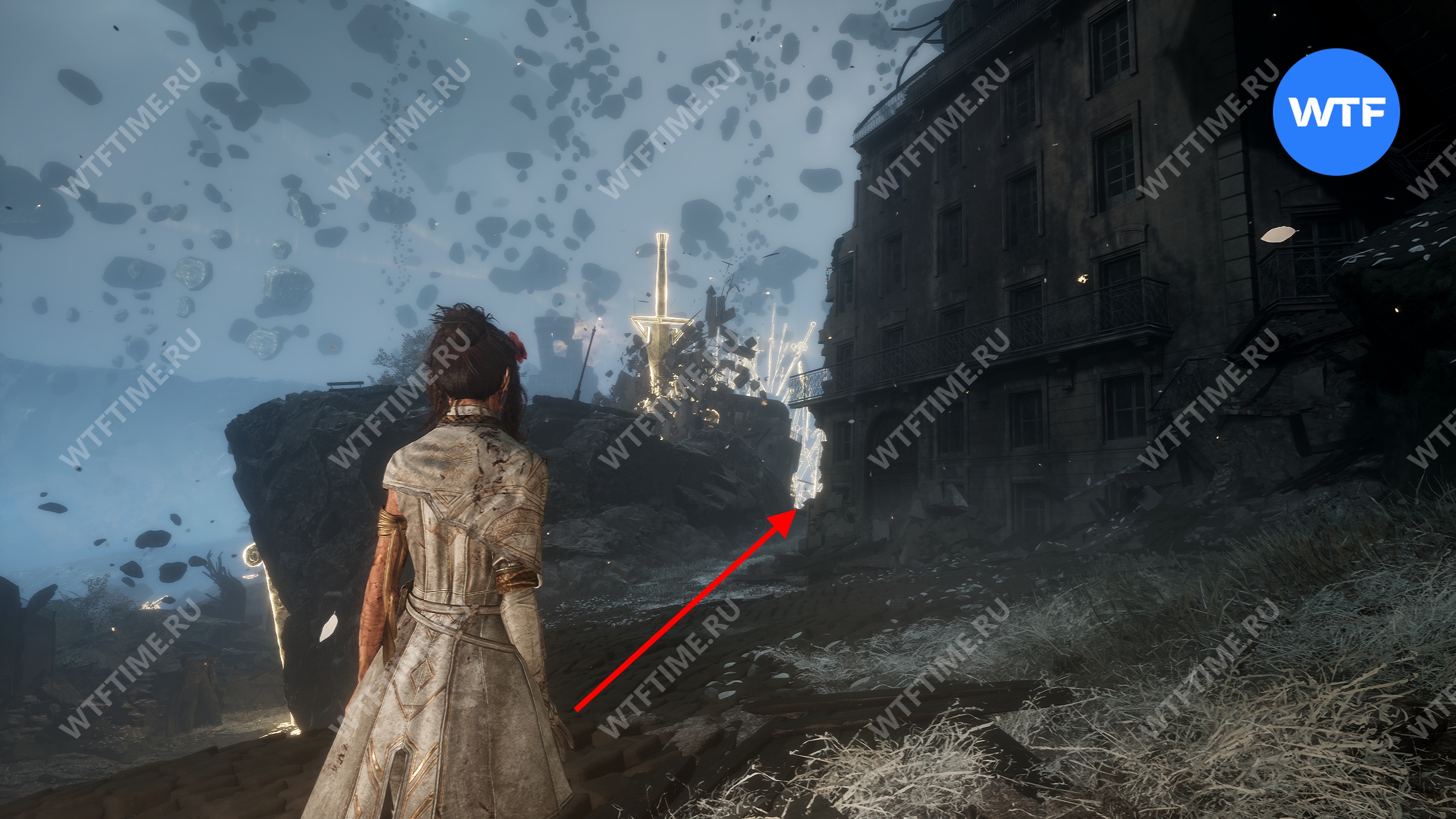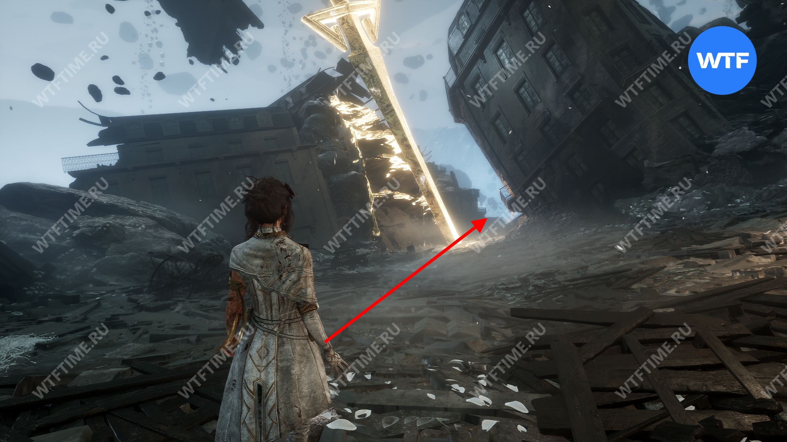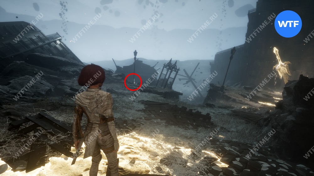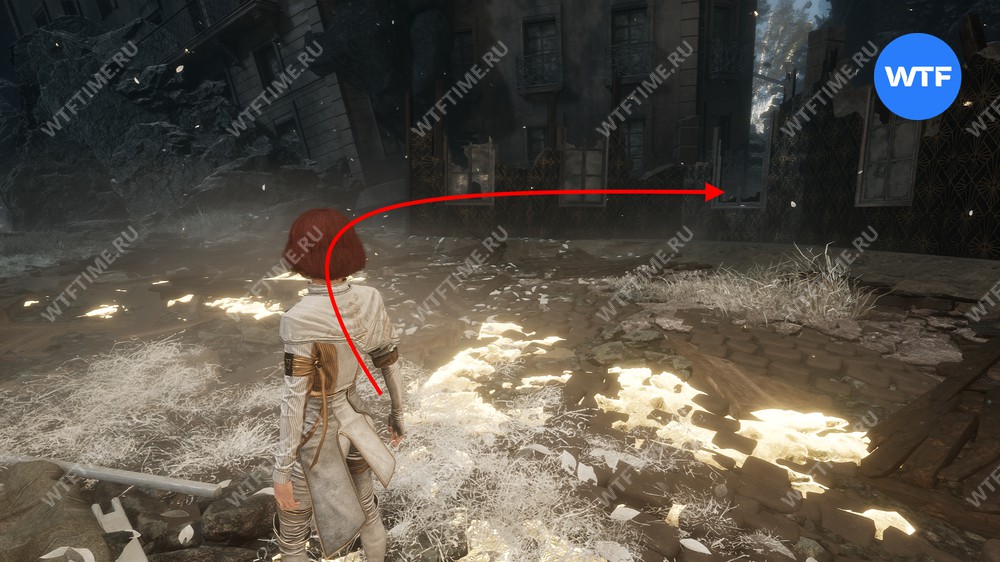 Вернитесь к флагу экспедиции «Правая улица» и от него бегите вперед по сюжетной тропе до упора. Пройдя мимо Тающего мужчины, вы вскоре окажетесь возле стены с опорами, по которым можно подняться наверх.