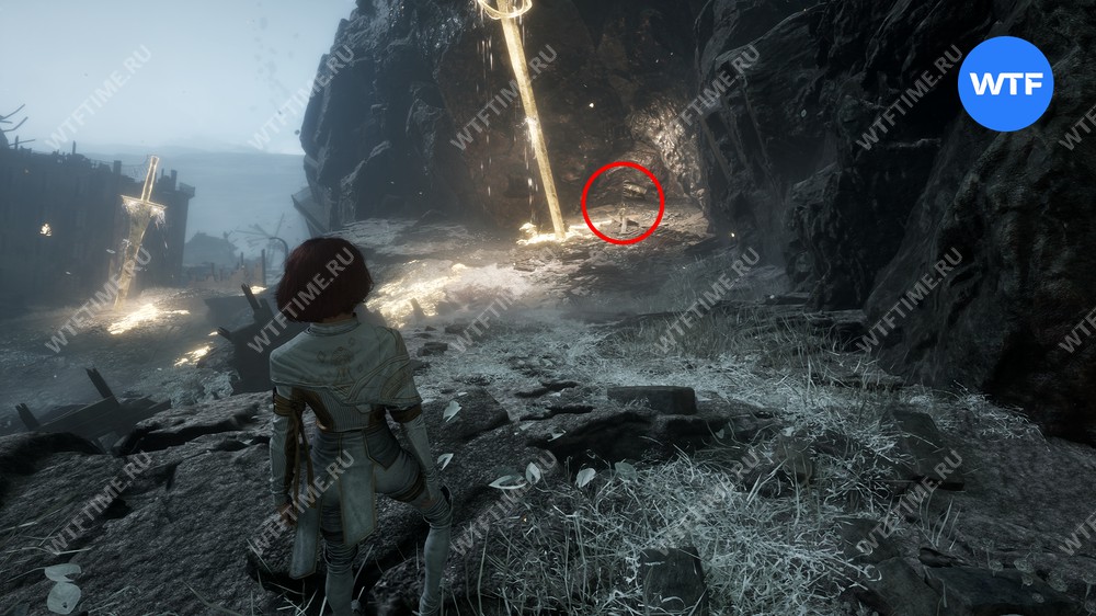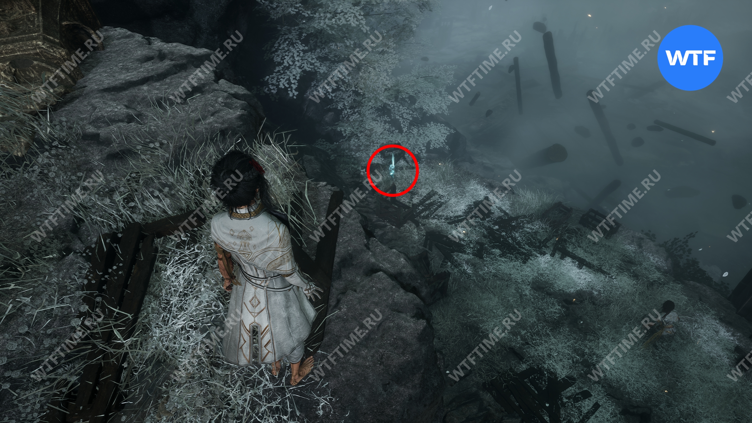 Вернитесь к дверному проему и выйдя через него обратно к развилке, сверните налево. Там вы сможете спуститься с уступа, чтобы подобрать 2495 хромы.