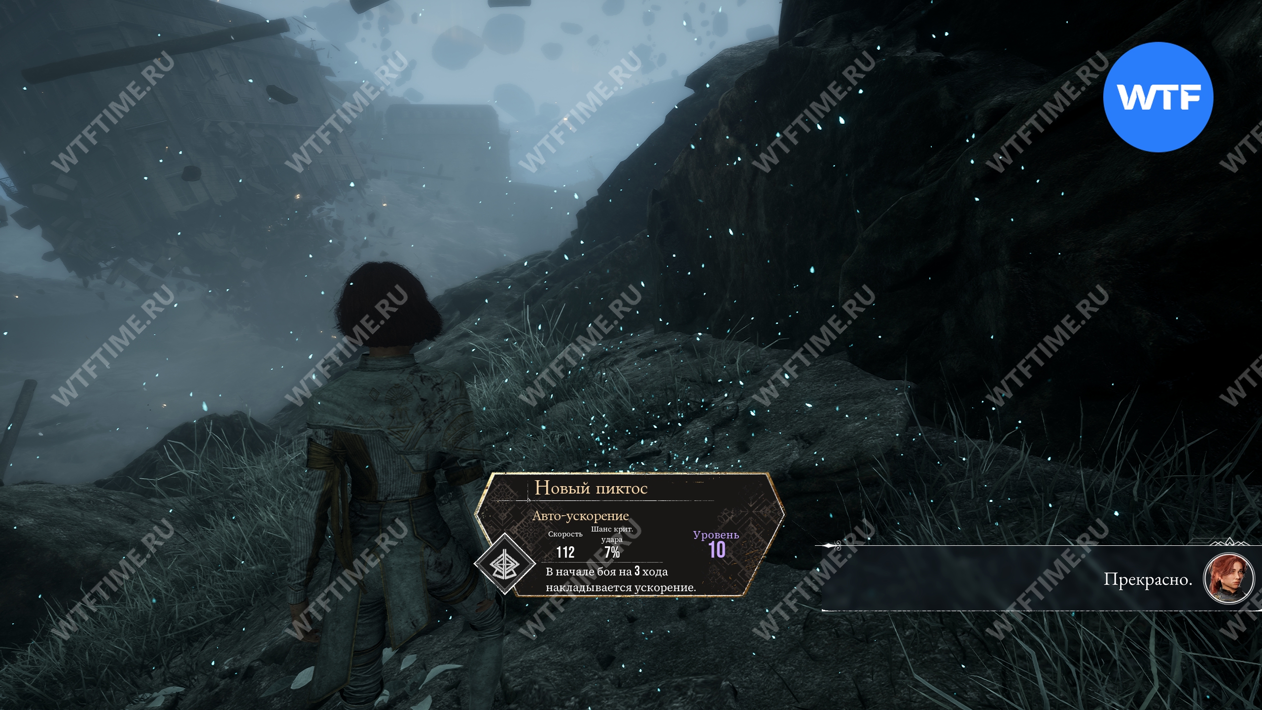 Продолжайте идти вперед и после того, как перепрыгните через полуразрушенный мост, пройдите через большую арку слева. За ней вы найдете пиктос «Авто-ускорение» (уровень 10, скорость 112, шанс крит. удара 7%), накладывающий ускорение на 3 хода в начале боя.