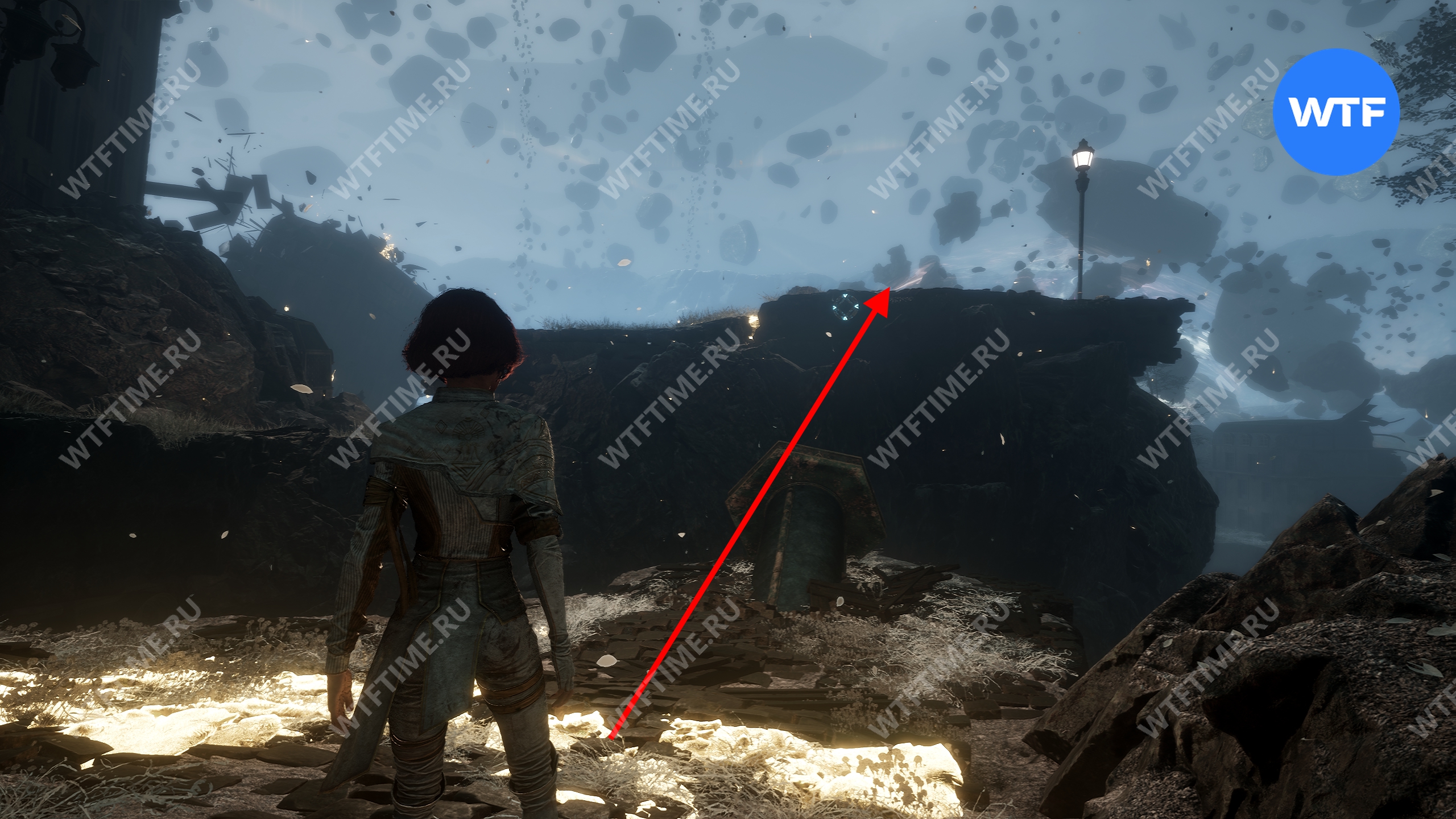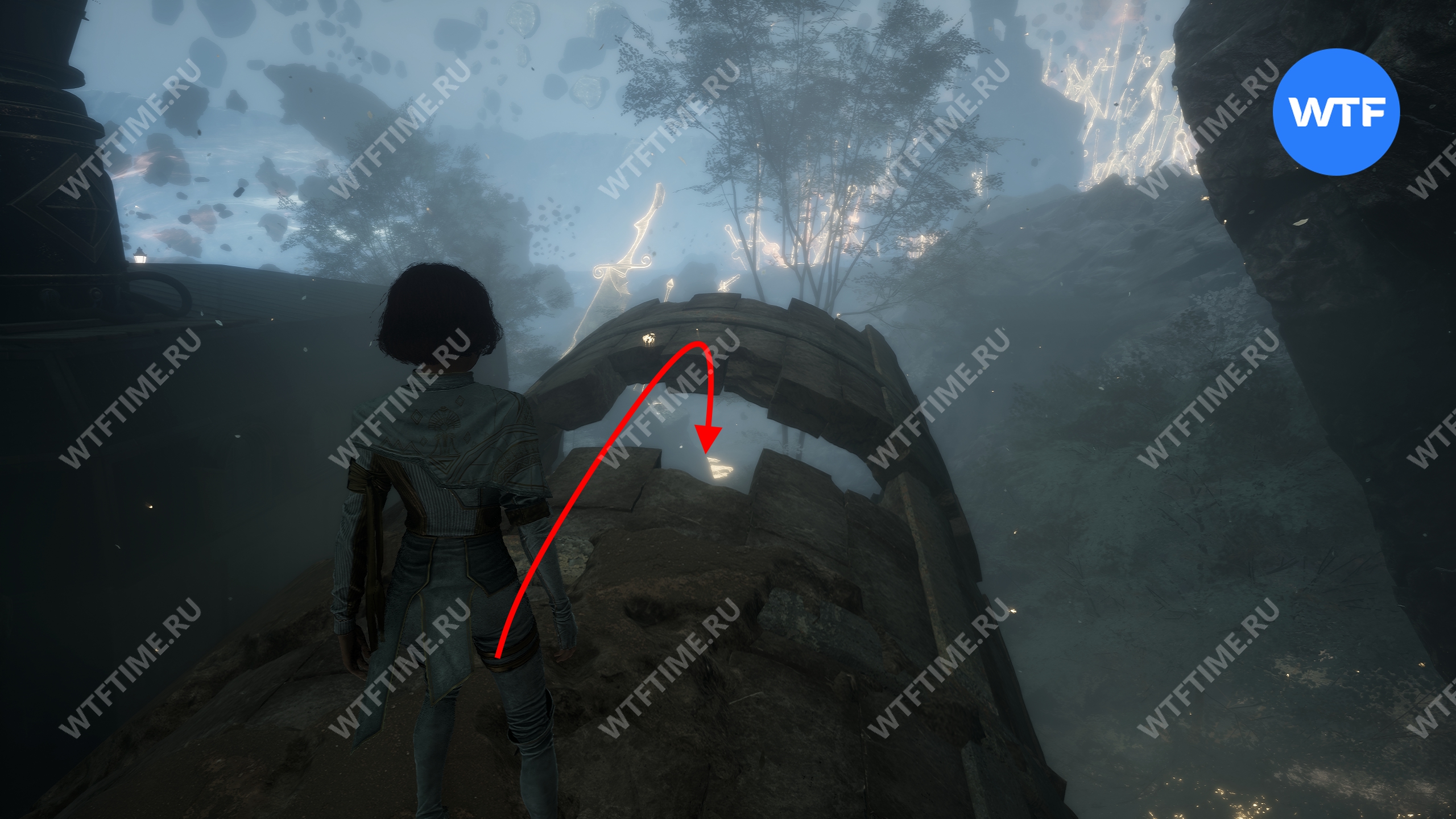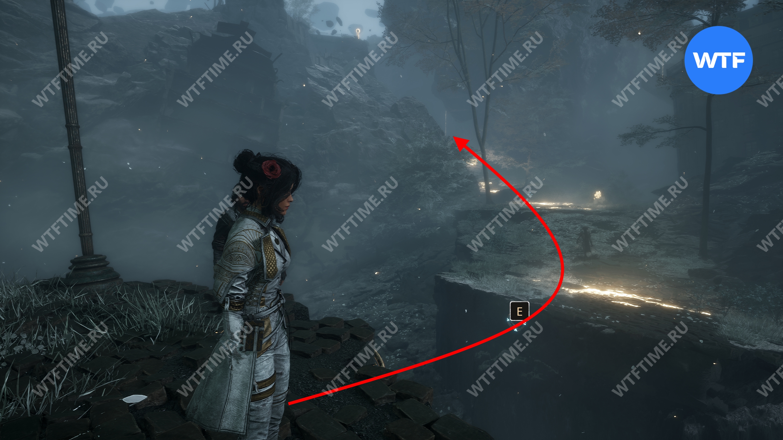 Вернитесь на основную дорогу и поднимитесь по склону, следуя за светящимися следами на земле. После того как перепрыгните через небольшую дыру на пути, держитесь правой стороны и спрыгните вниз с уступа.