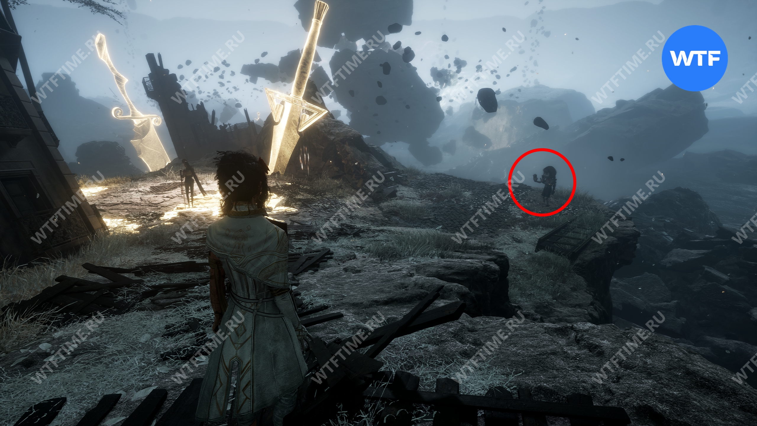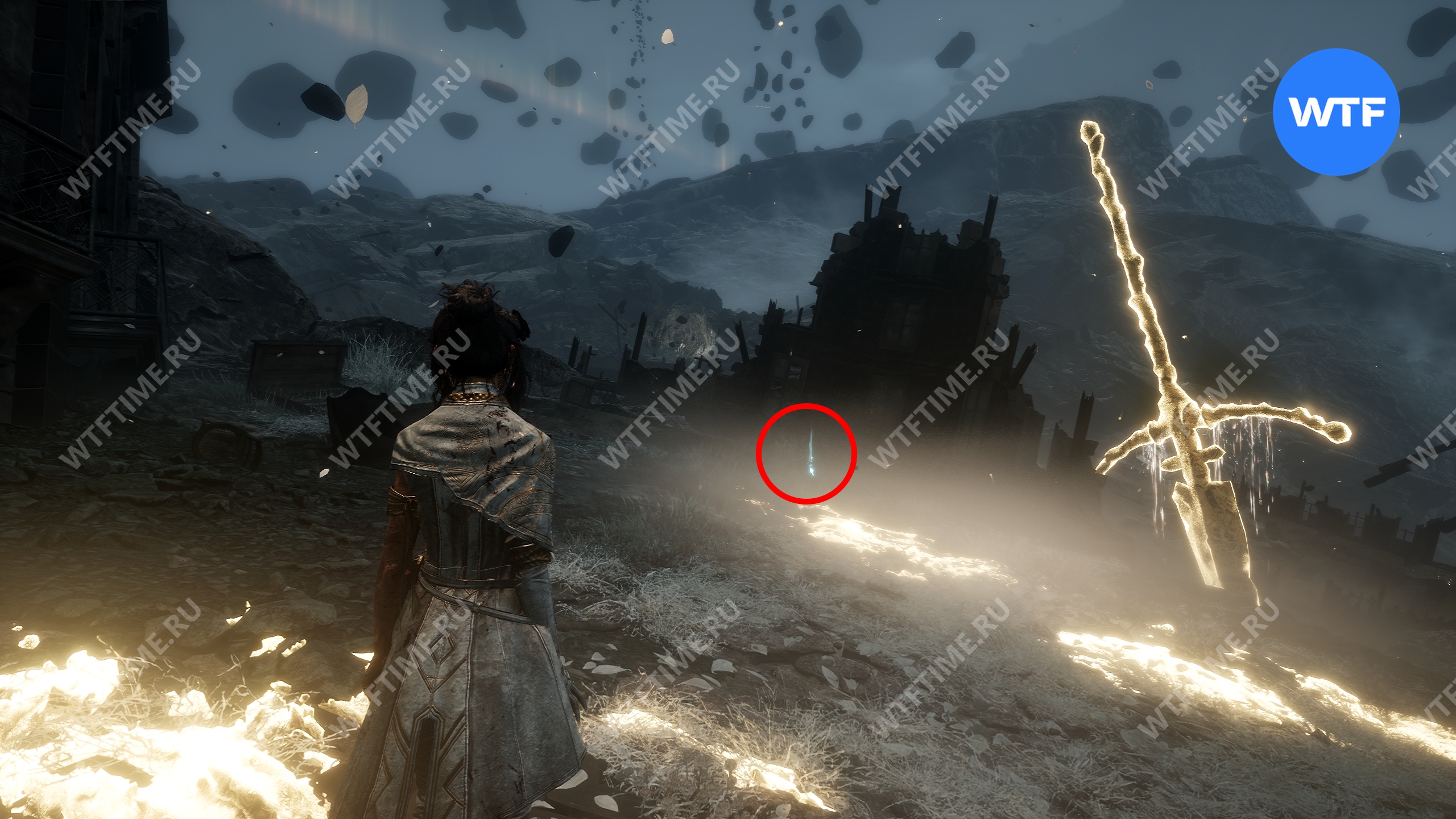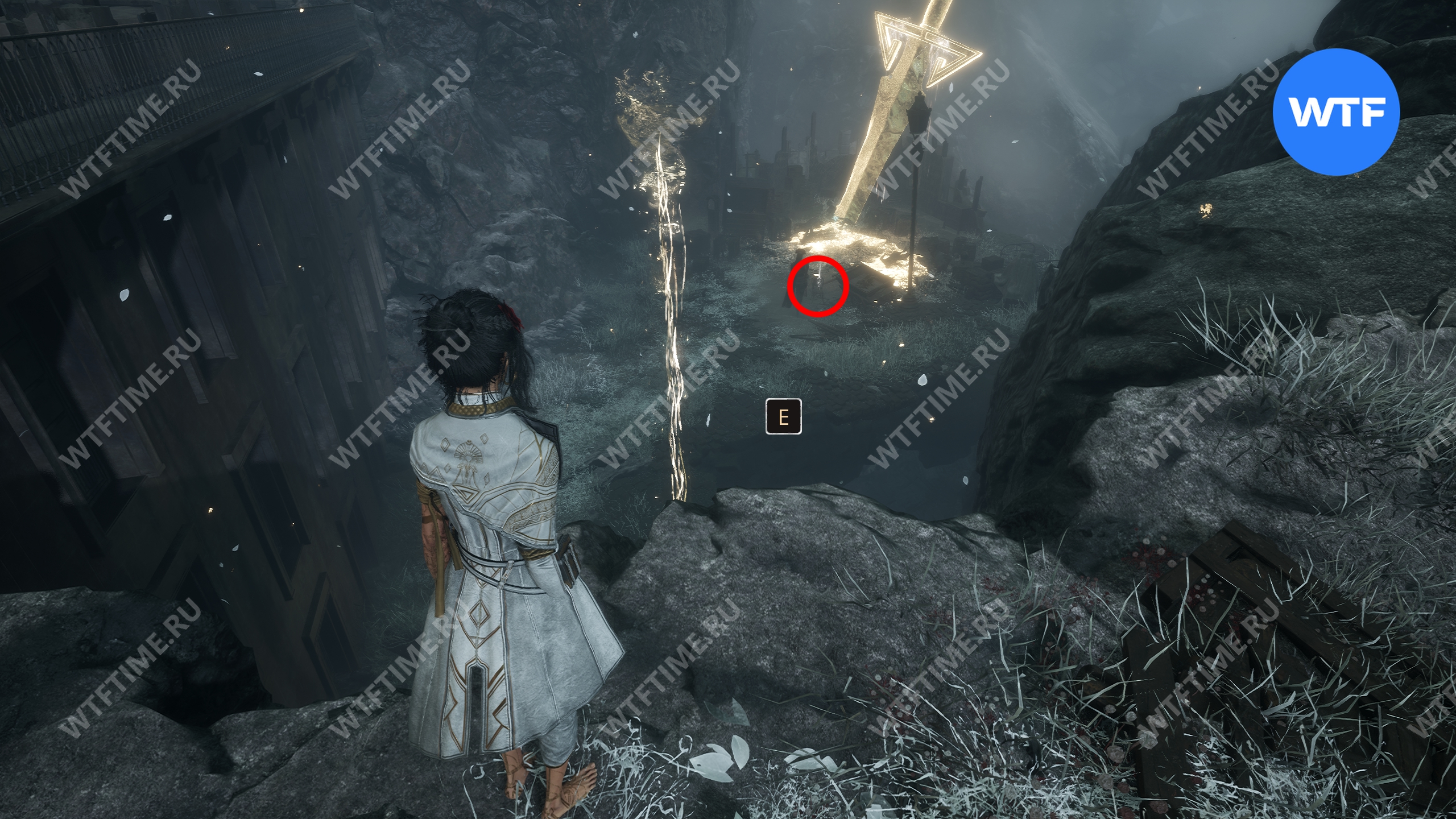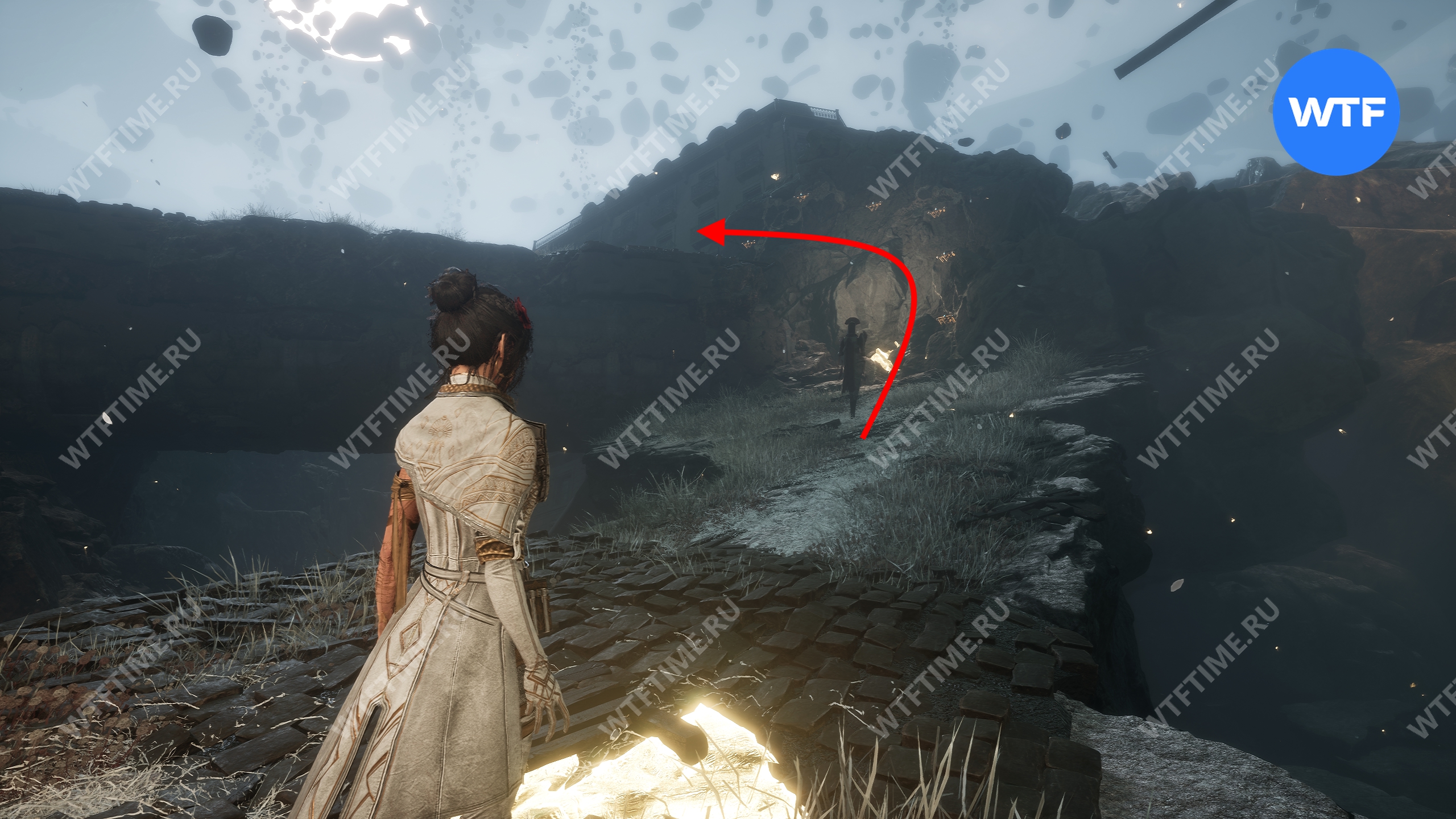 Вернитесь на основную дорогу и поднимитесь по склону, следуя за светящимися следами на земле. После того как перепрыгните через небольшую дыру на пути, держитесь правой стороны и спрыгните вниз с уступа.
