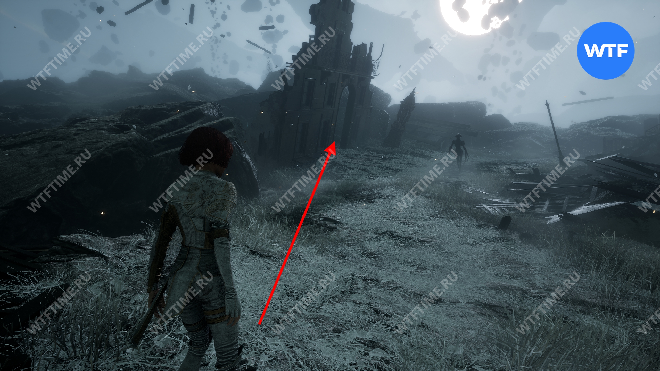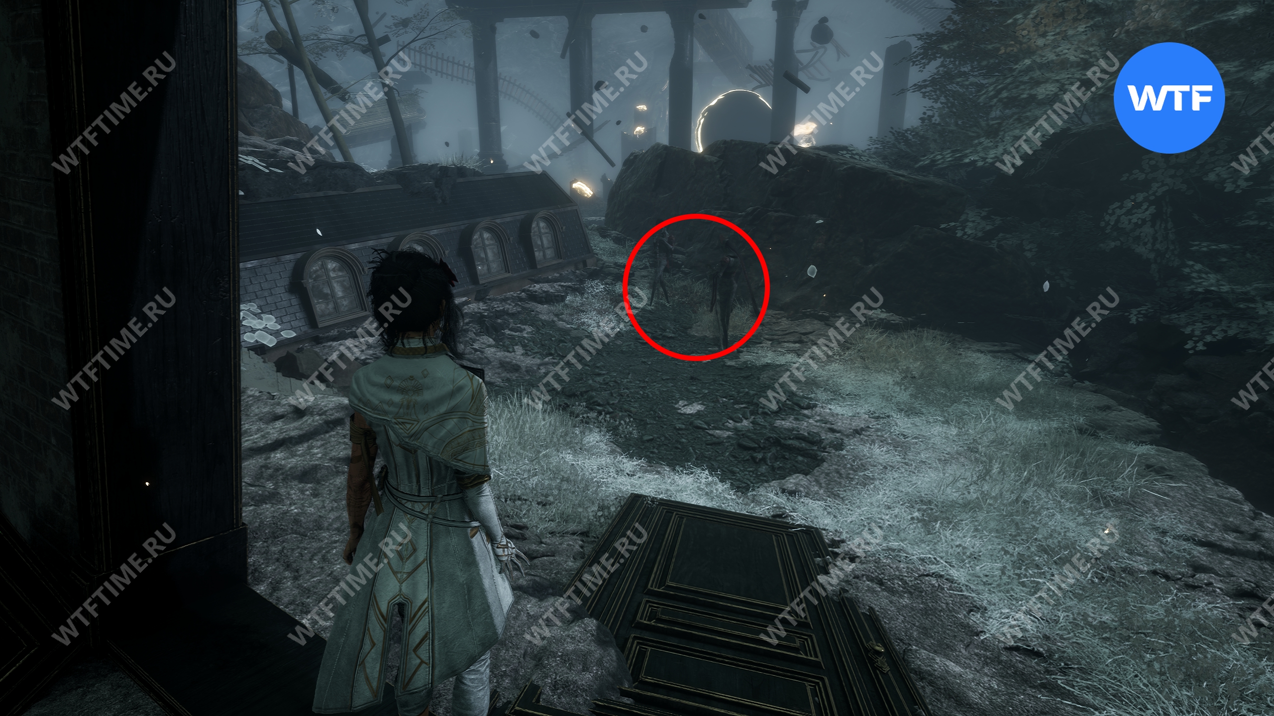От флага бегите вперед до ближайшей развилки с врагами. Пока не вступайте в бой и пройдите через дверной проем справа. Там вы увидите фарфоровую шевальерку, с которой можно получить ногу для Моноко.