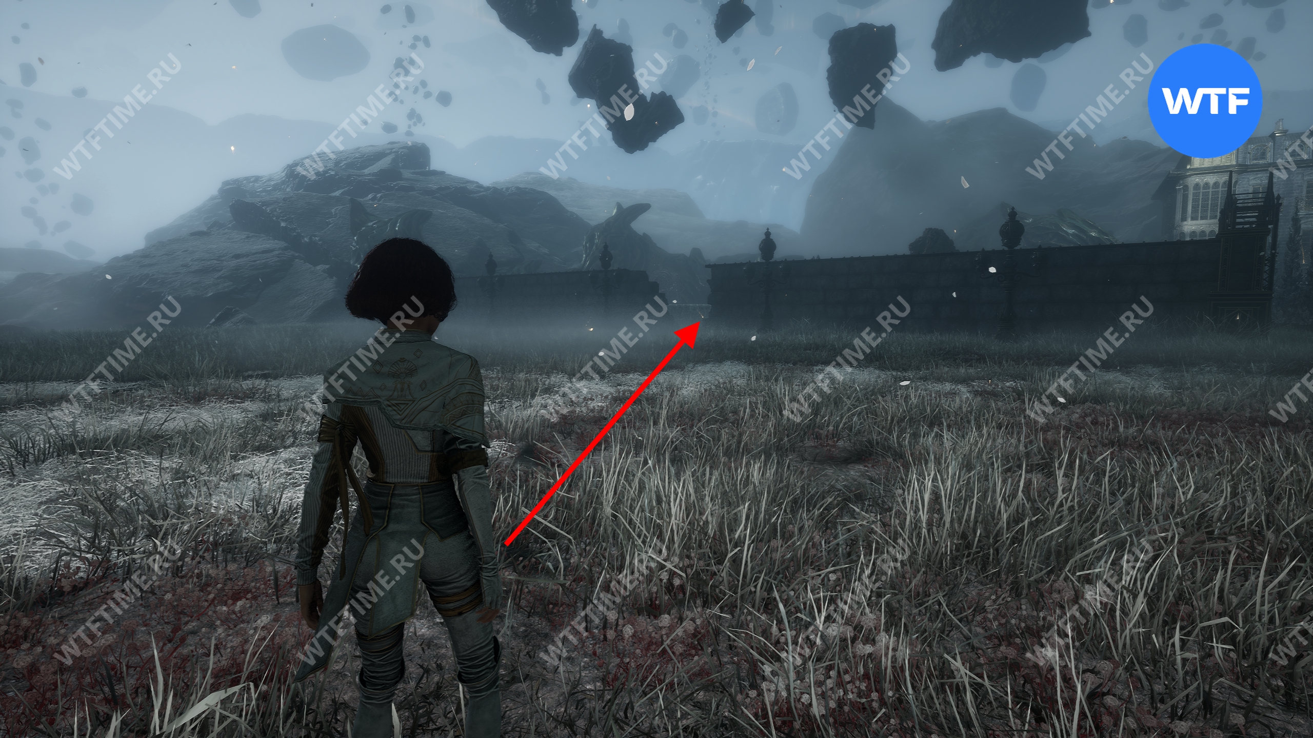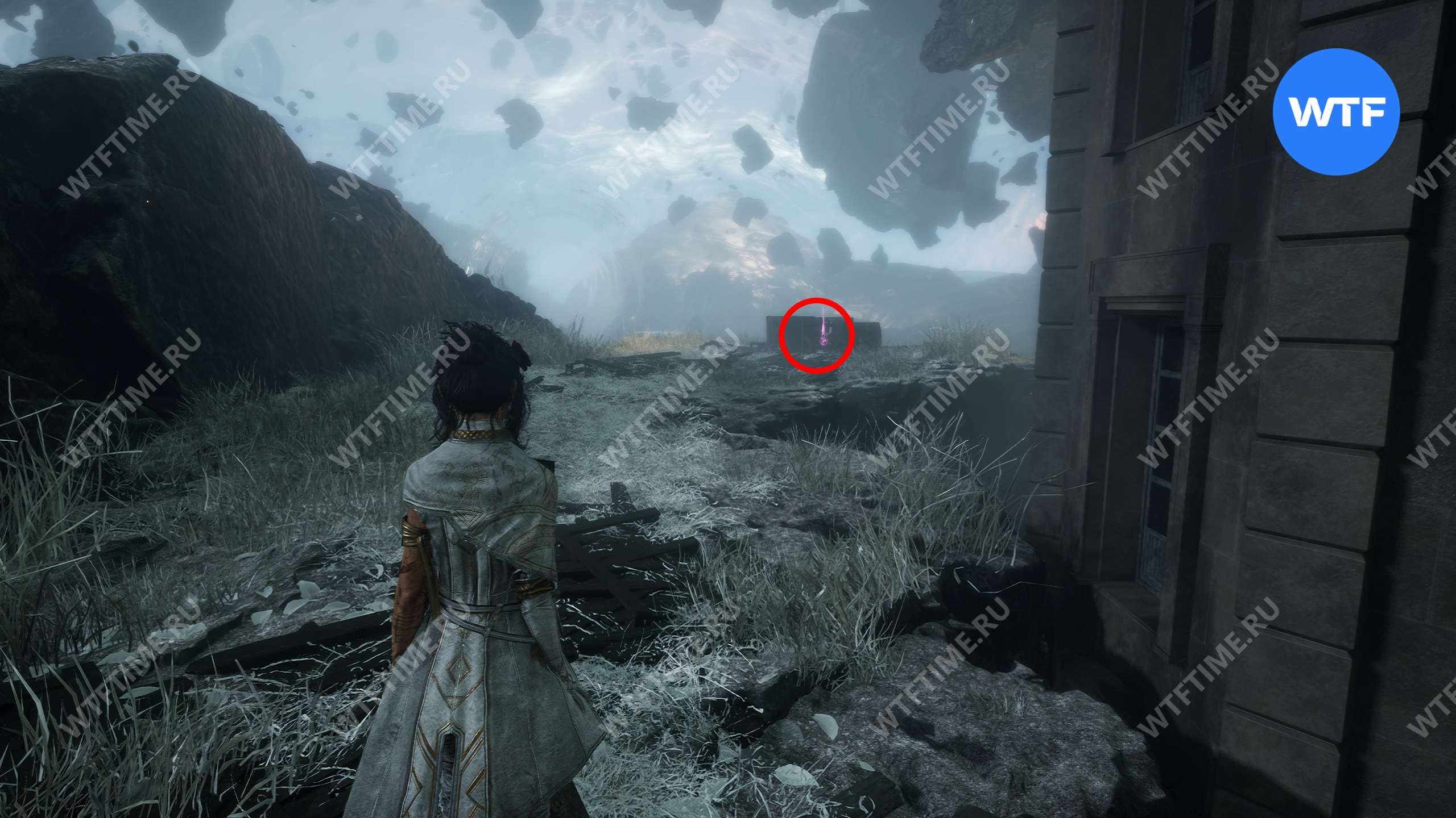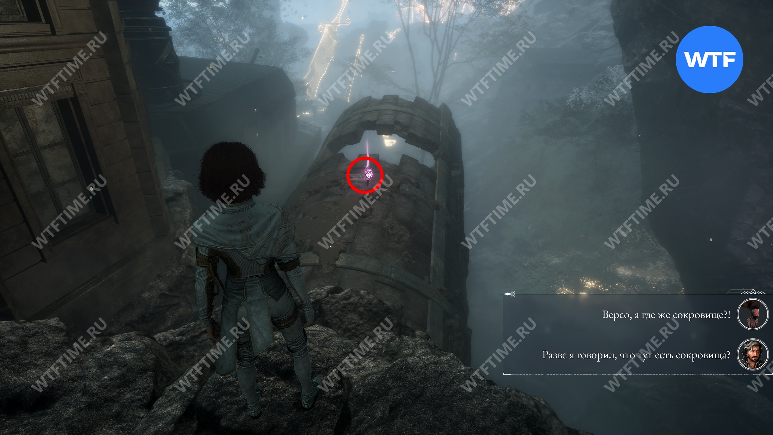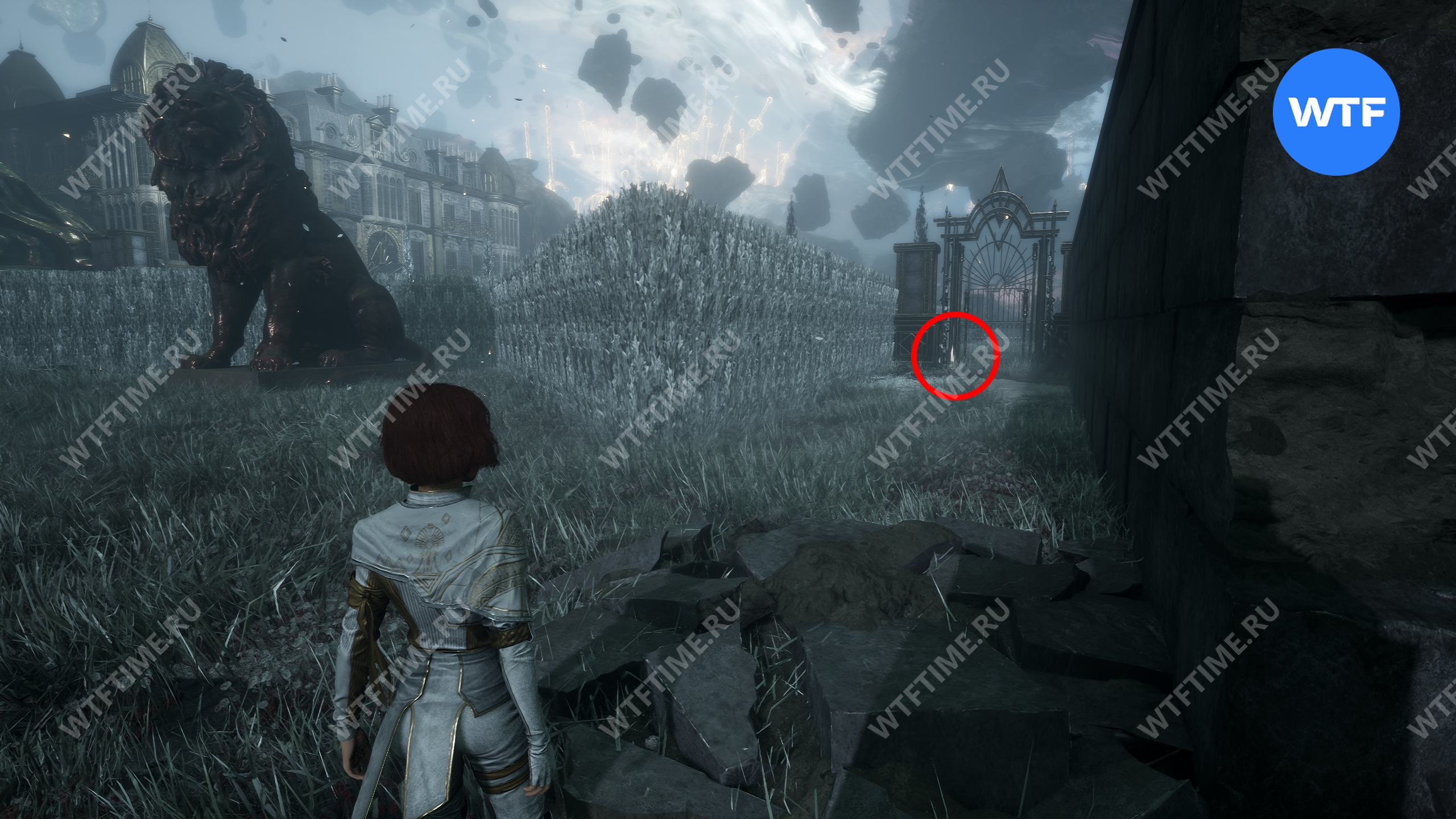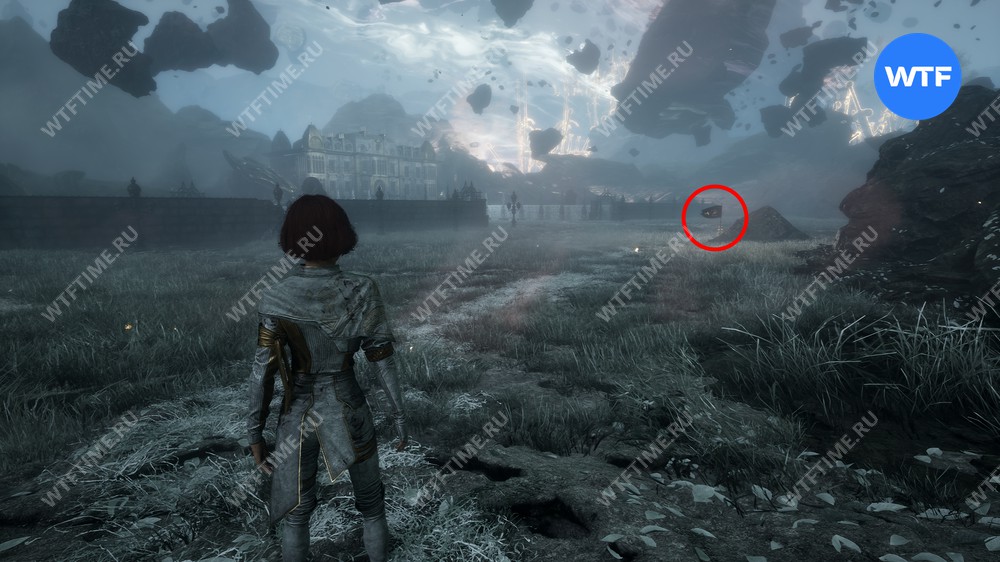 После выхода из портала бегите налево вдоль ограды особняка, а затем вдоль скал. Спуститесь вниз по веревке и подберите 4990 хромы со стула.