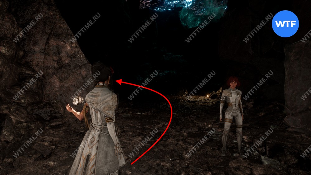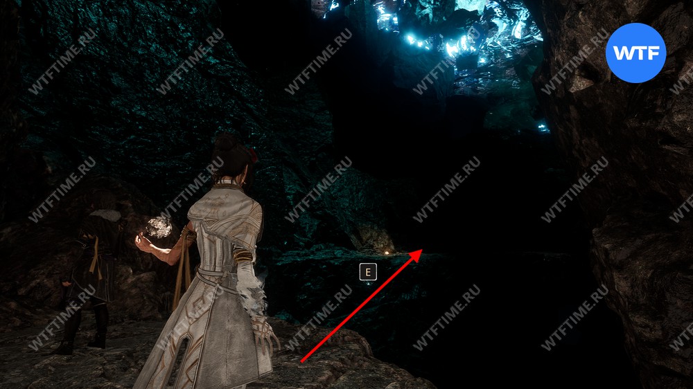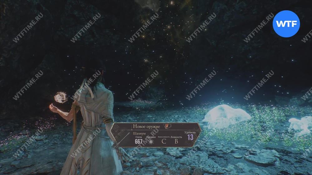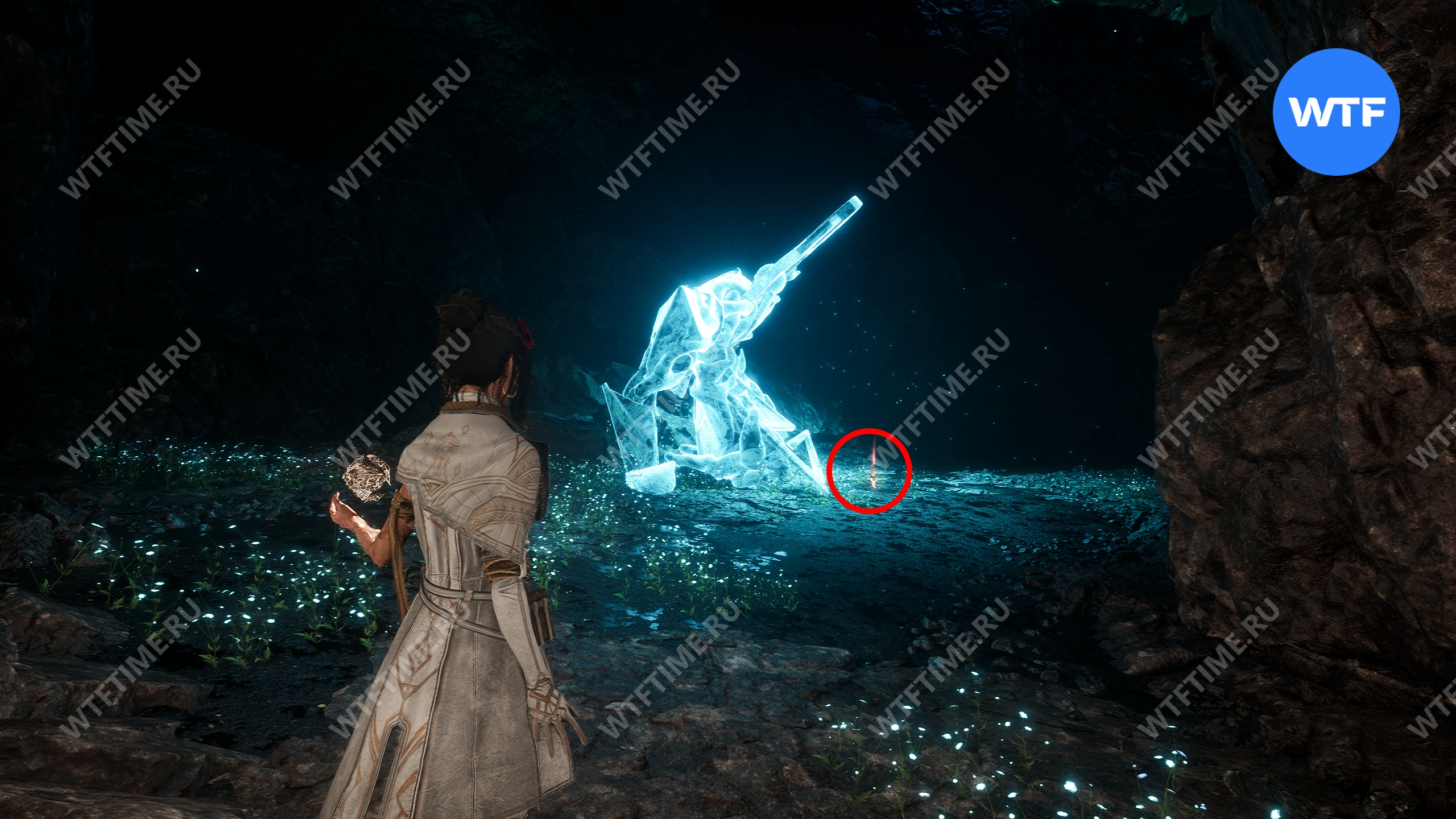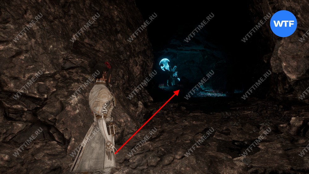 Из основной области прижмитесь к левой стене пещеры и идите вдоль неё до тех пор, пока не увидите тело светящегося неврона со скриншота ниже. На земле прямо перед ним вы найдете оружие для Люнэ «Элерим».