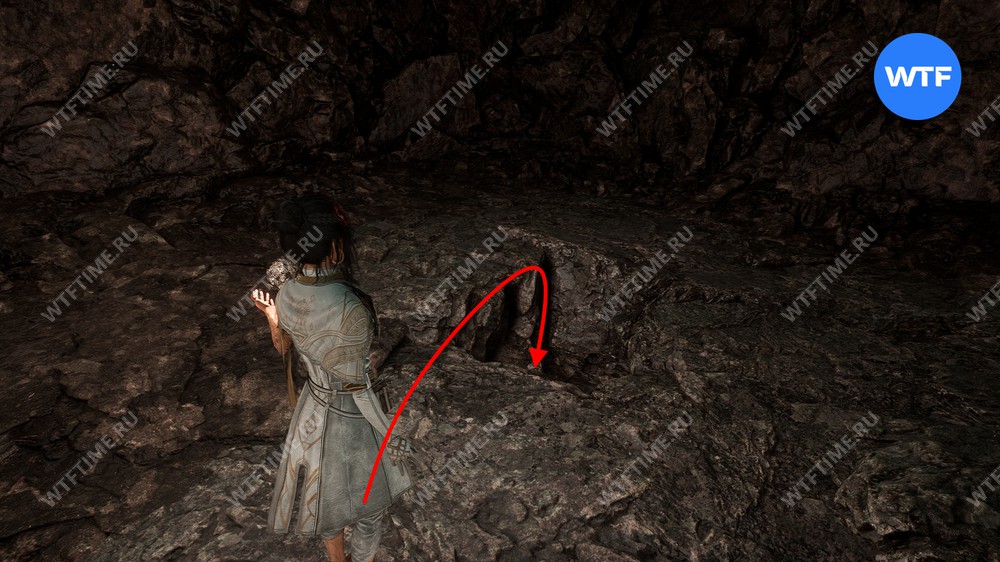 Добравшись до тупика, внимательно осмотрите пол, чтобы заметить в нем небольшую дыру. Спрыгните вниз и окажетесь на уступе с фиолетовым предметом, мимо которого мы проходили ранее.