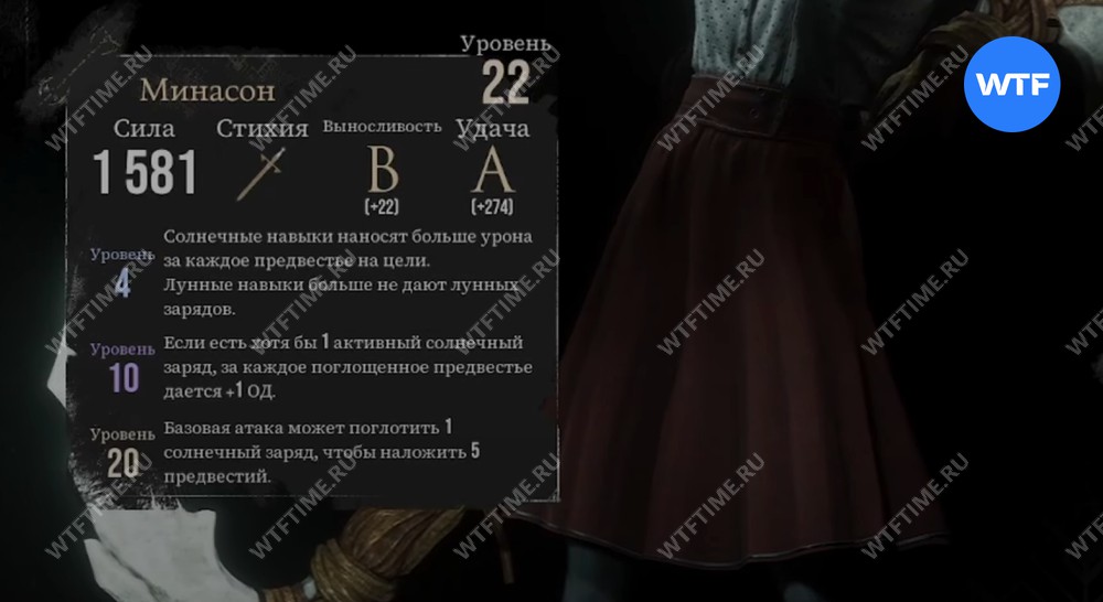- Оружие для Сиэль «Минасон» (уровень 22, стихия физ., сила 1224, выносливость B, удача A);