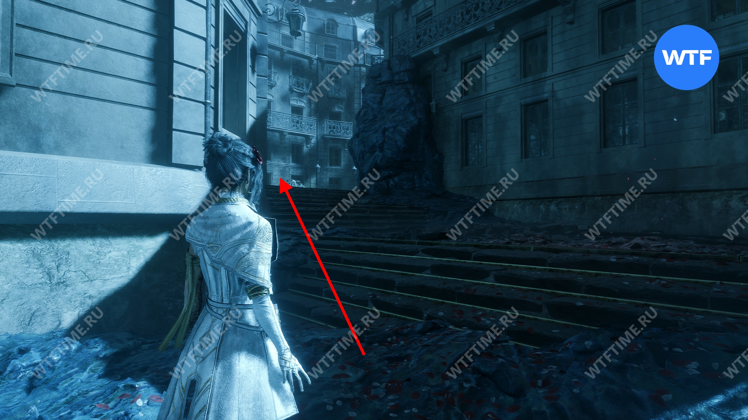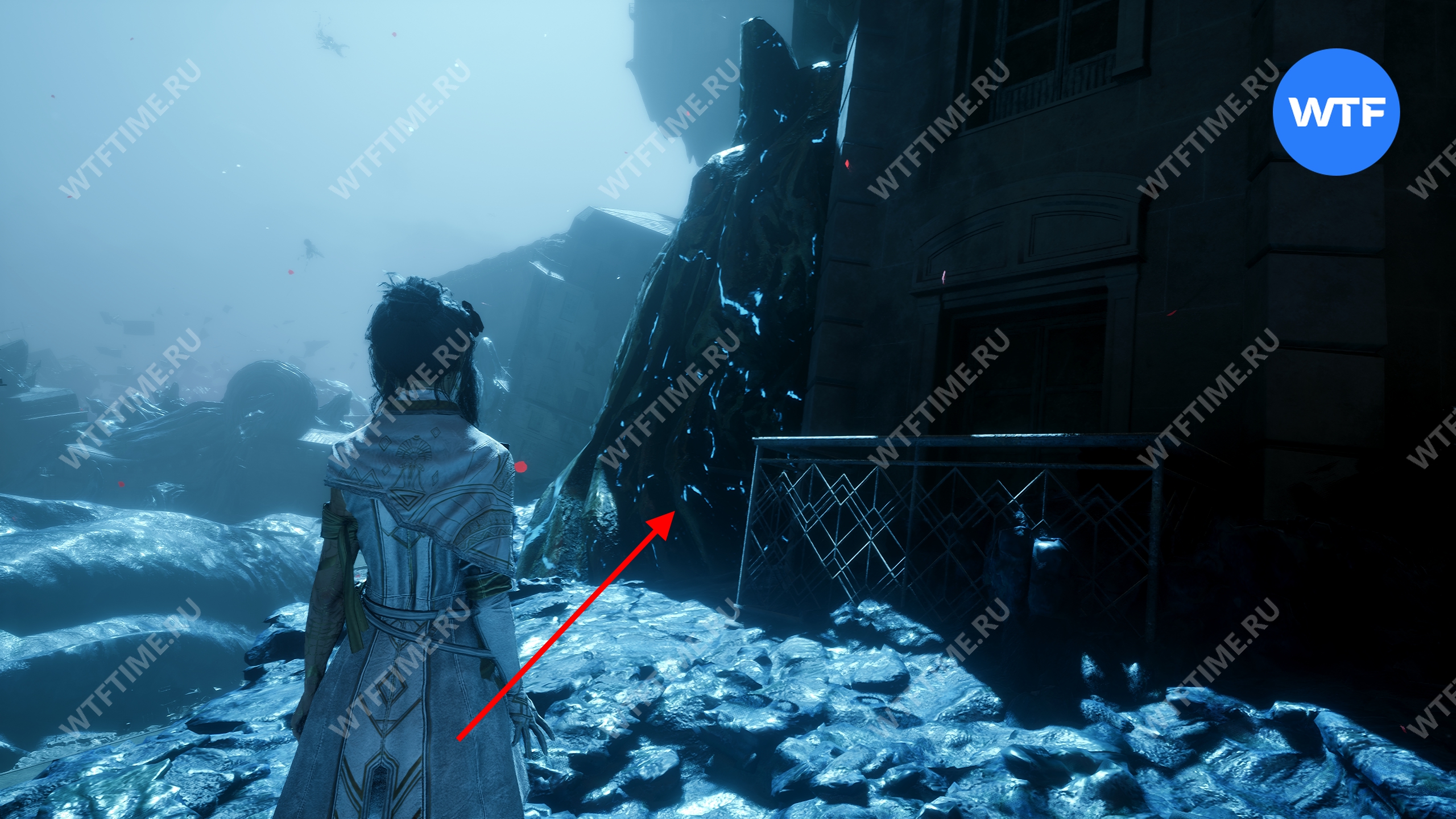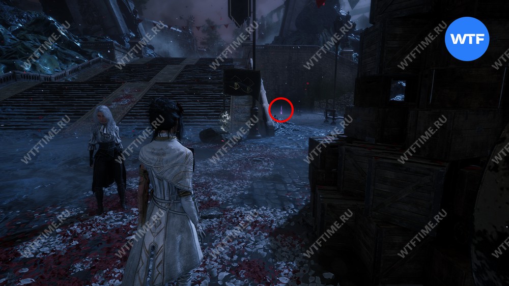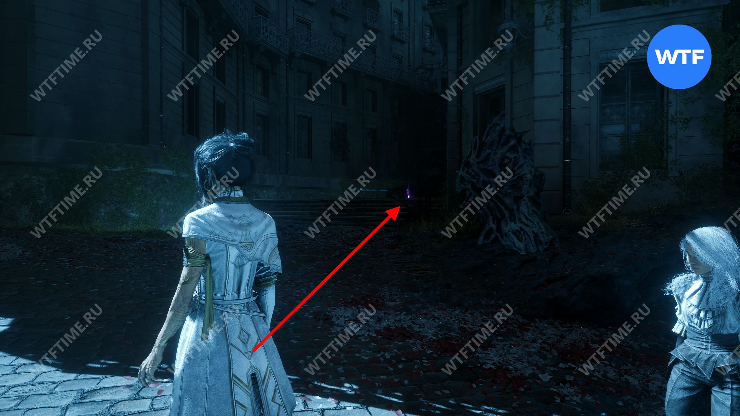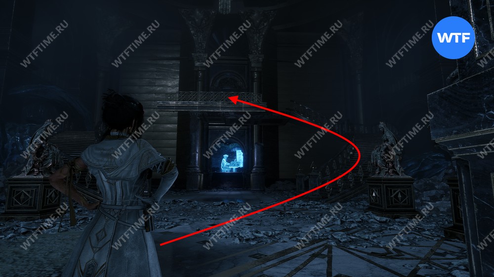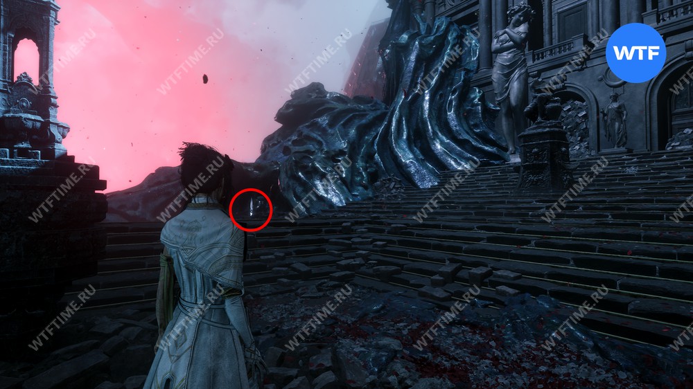 Пройдя по второй лестнице справа, вы увидите на ступеньках вдалеке еще один светящийся предмет — это 2450 хромы.