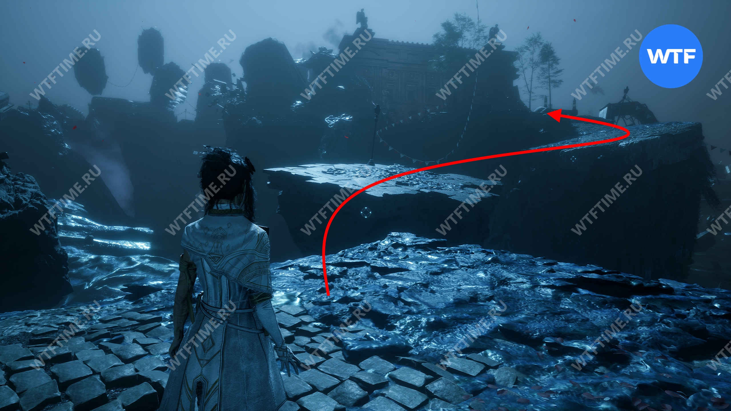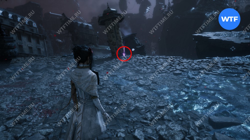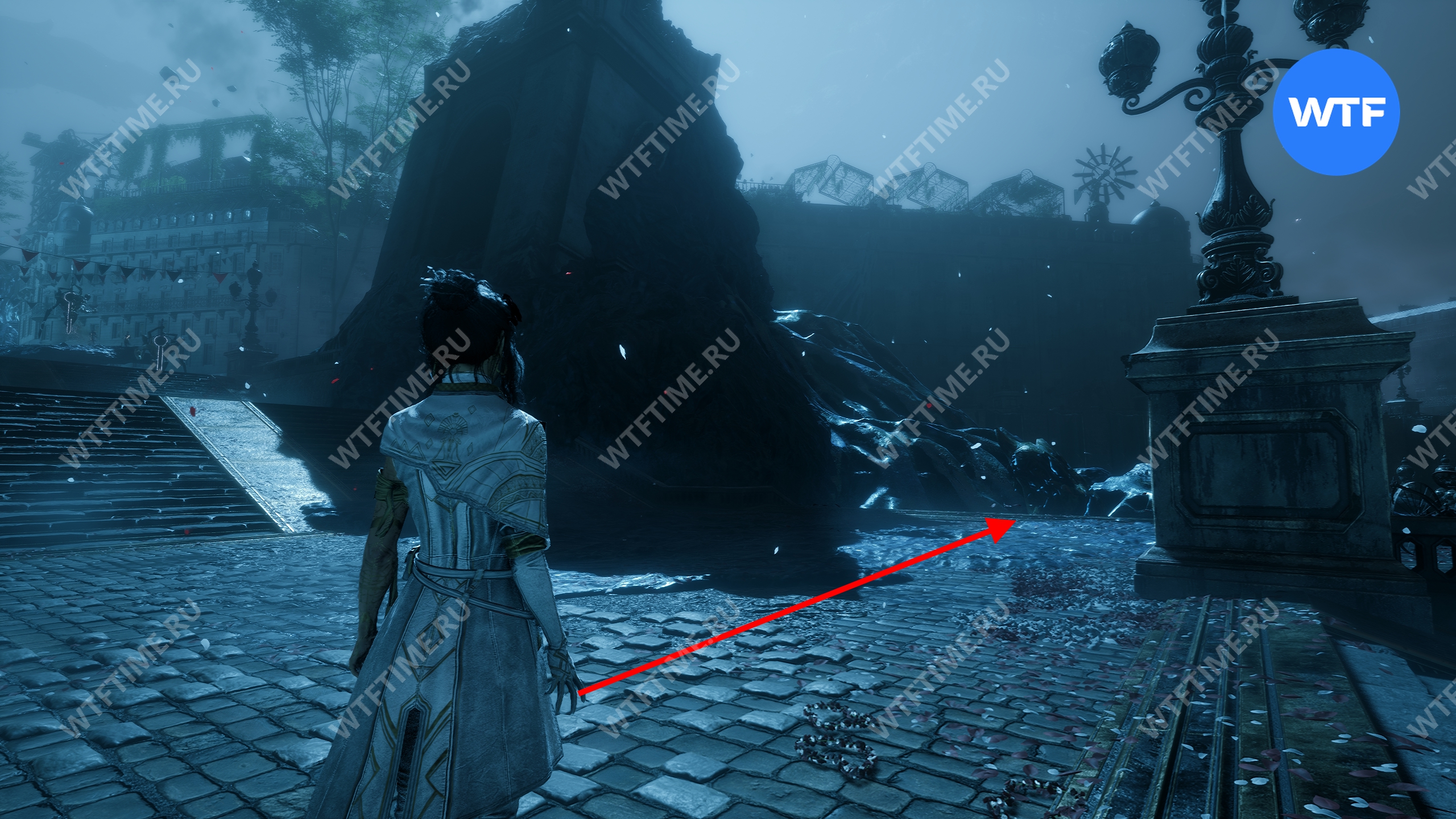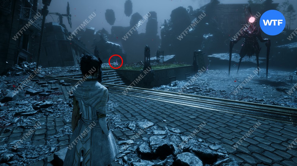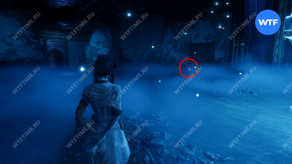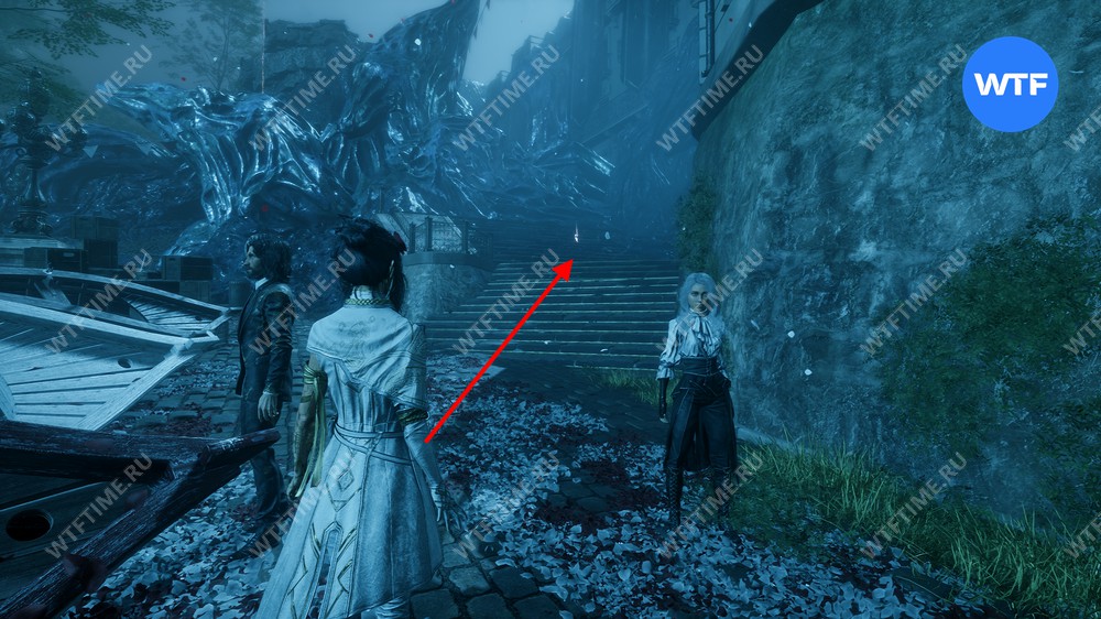 Пройдя по второй лестнице справа, вы увидите на ступеньках вдалеке еще один светящийся предмет — это 2450 хромы.