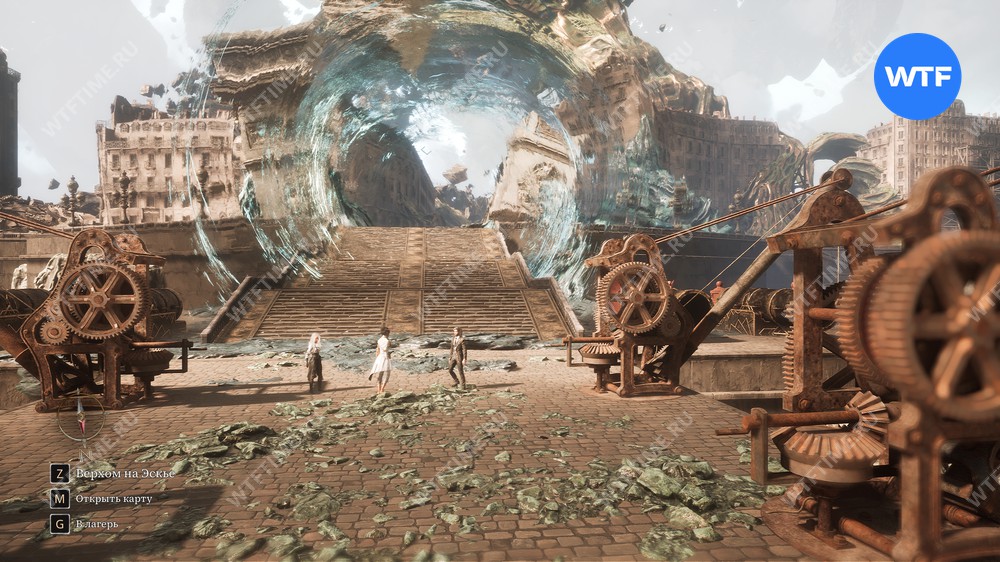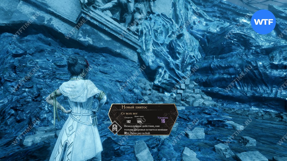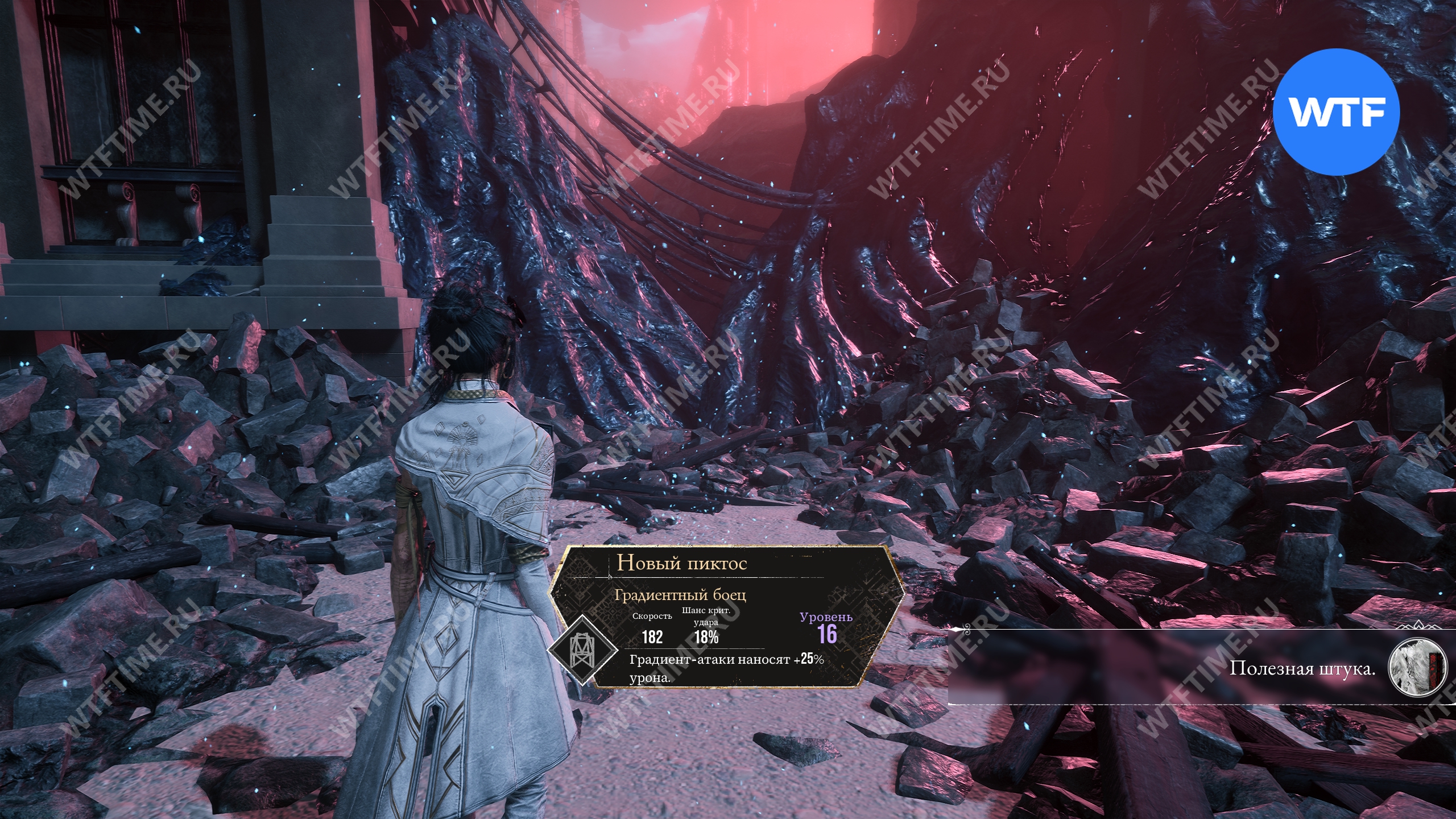 Если пойти по второй лестнице слева, то на ступеньках вдалеке увидите пиктос «Градиентный боец» (уровень 16, скорость 182, шанс крит. удара 18%), повышающий урон градиент-атак на 25%.