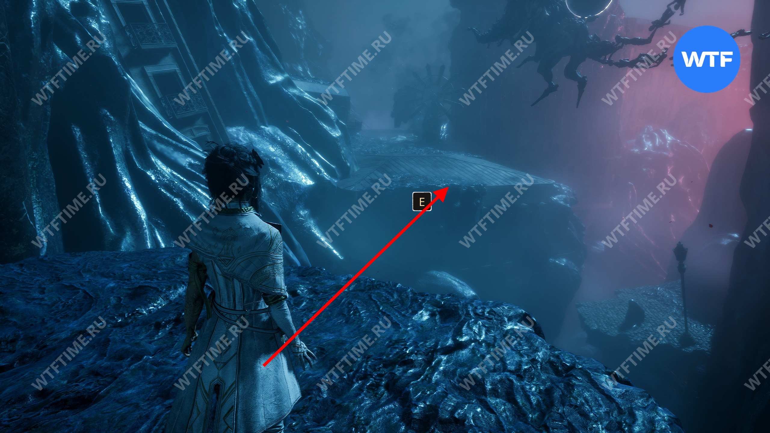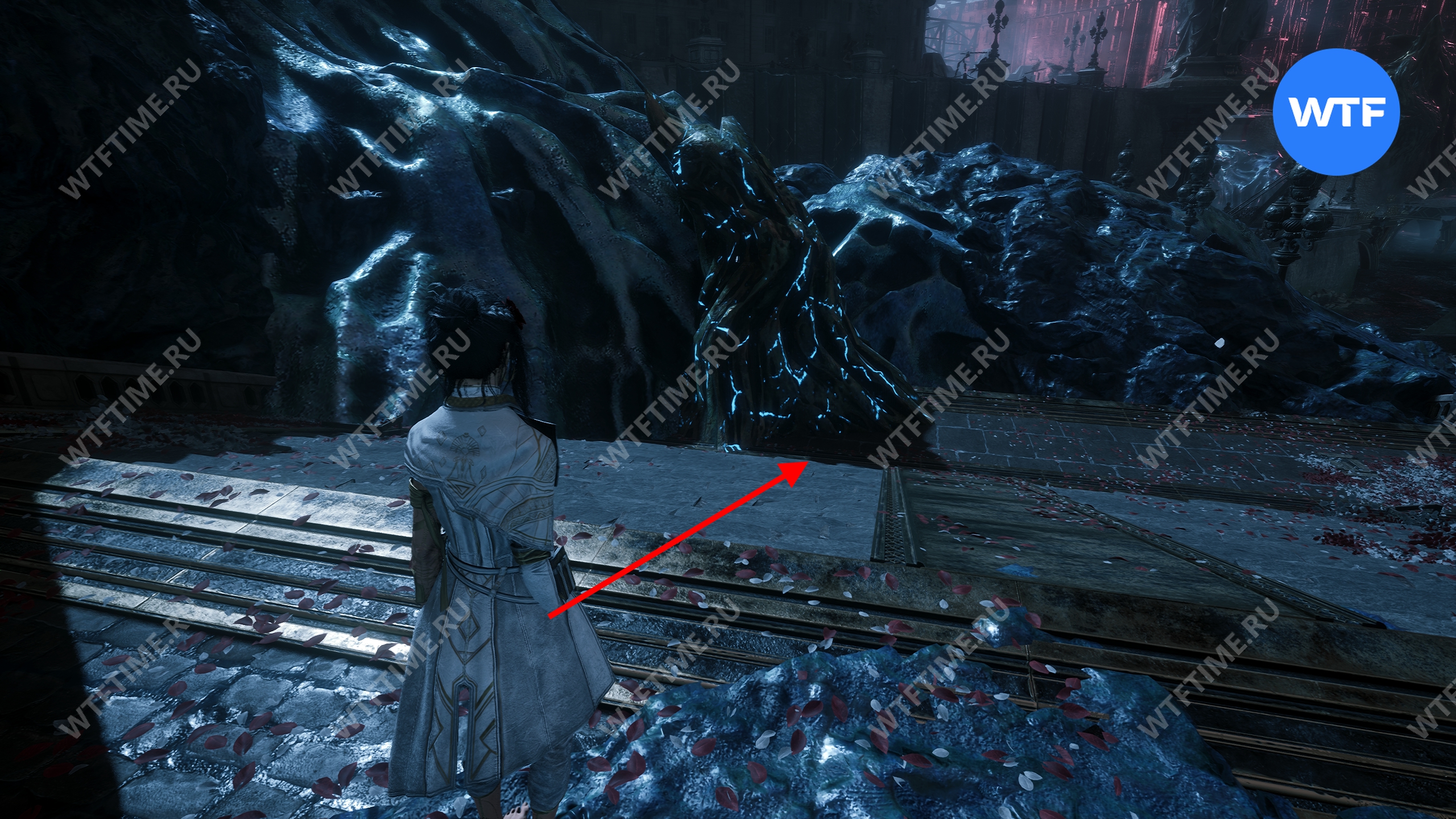 Спуститесь по первой лестнице справа, а затем снова посмотрите направо, чтобы увидеть цвет люмины, спрятанный внутри каменной конструкции.