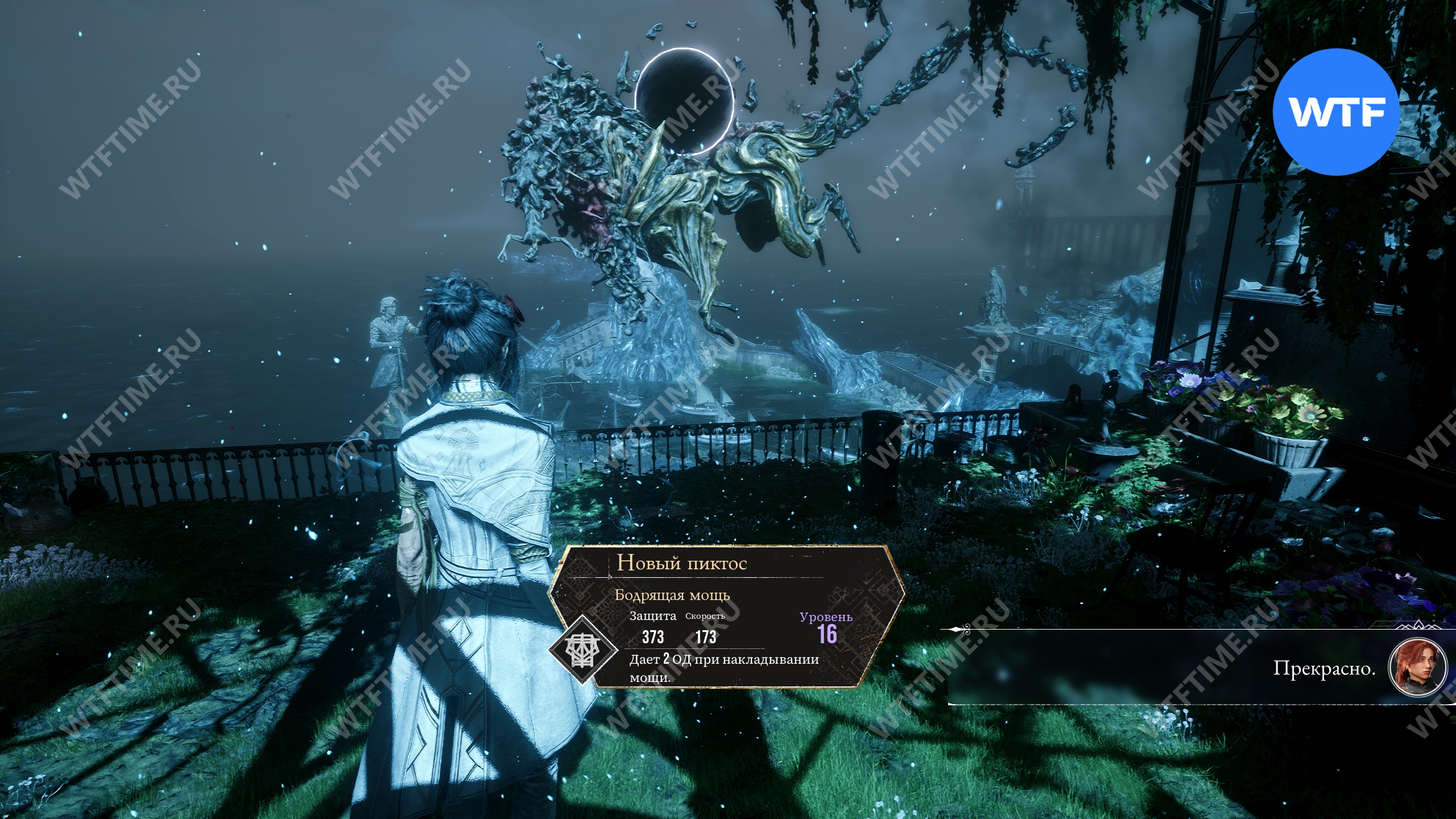 За победу над творением вы получите сверкающий катализатор хромы, ногу творения для Моноко и пиктос «Быстрота без силы» (уровень 16, здоровье 876, защита 373), дающий два действия подряд, но снижающий урон на 50%.