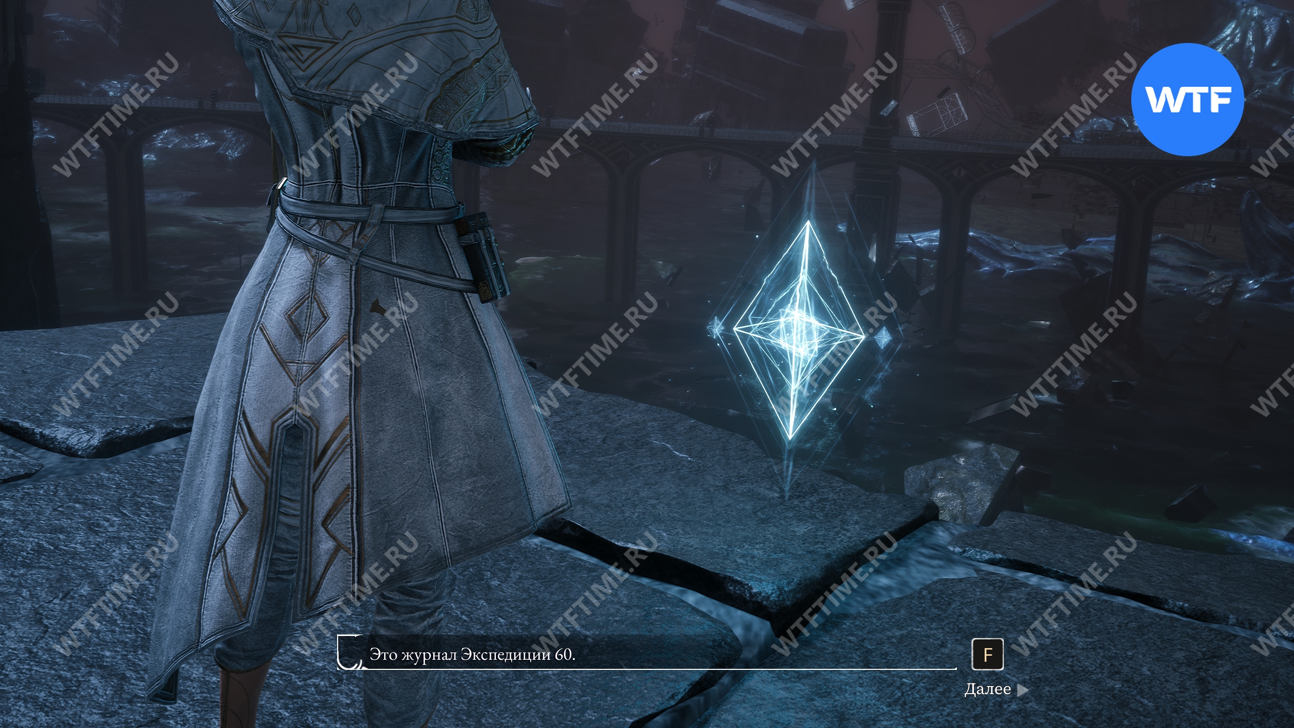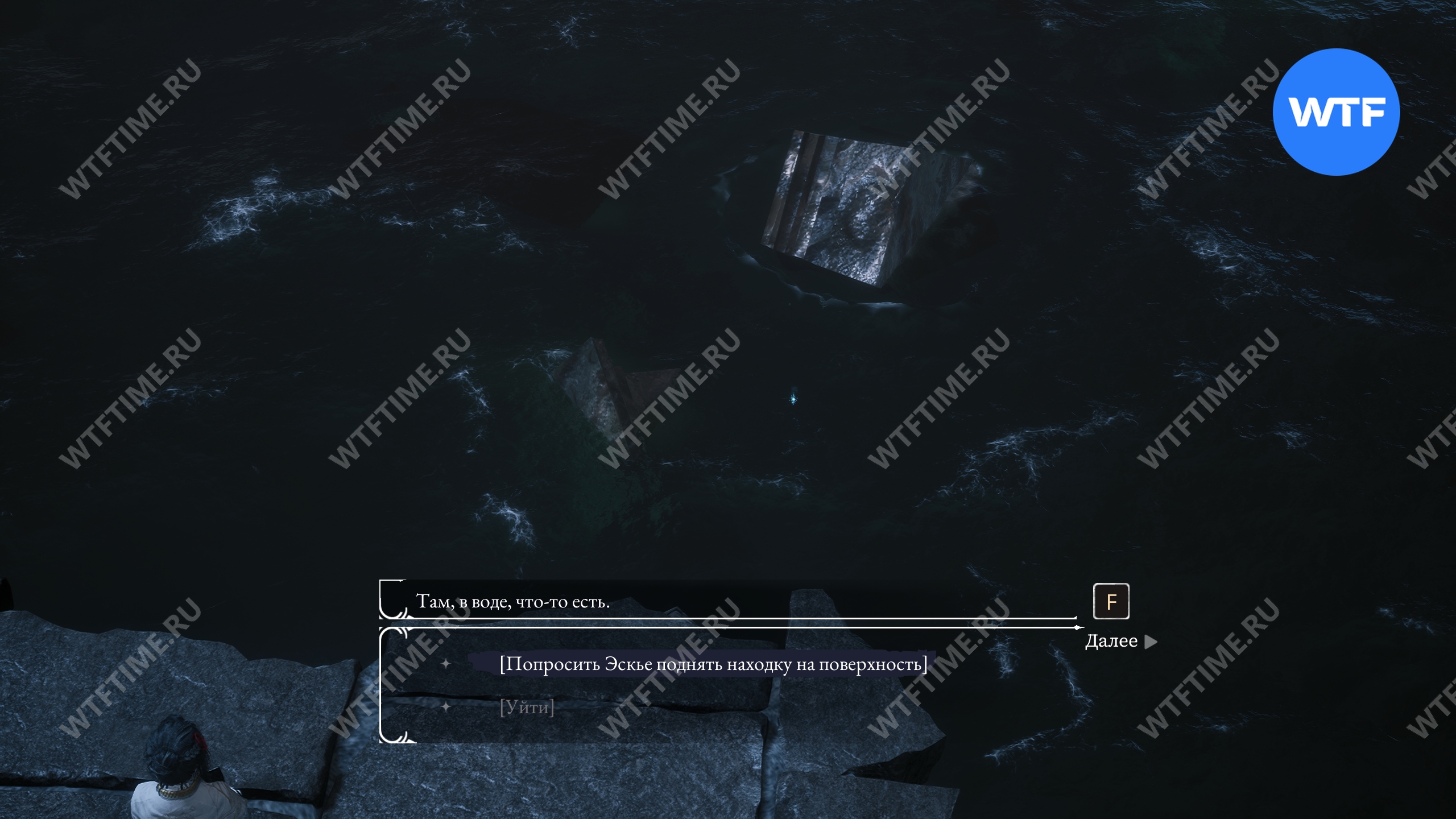 Теперь отыщите каменный уступ, выступающий над пропастью справа от входа в здание. Взаимодействуйте с ним и попросите Эскье достать предмет из воды. Им окажется журнал «Экспедиция 60».