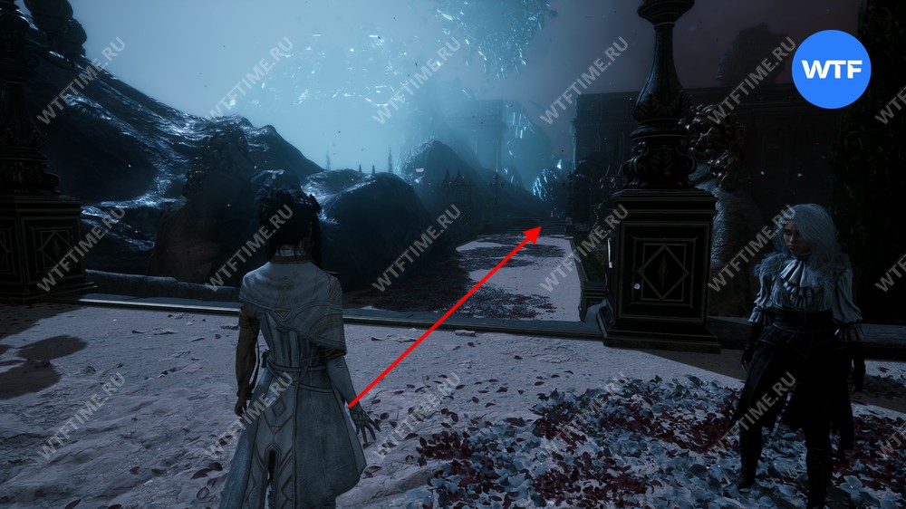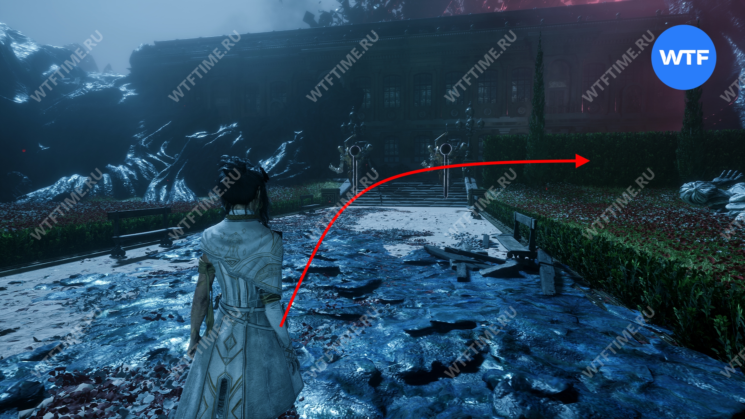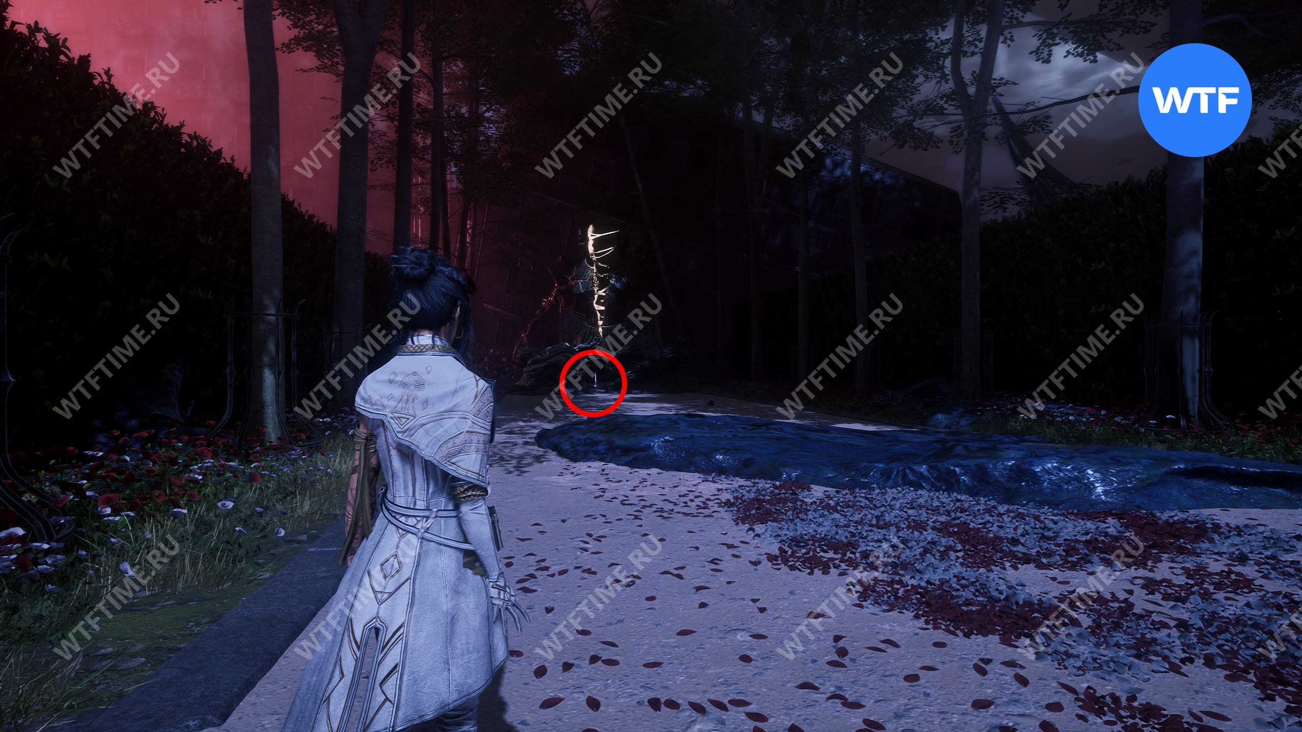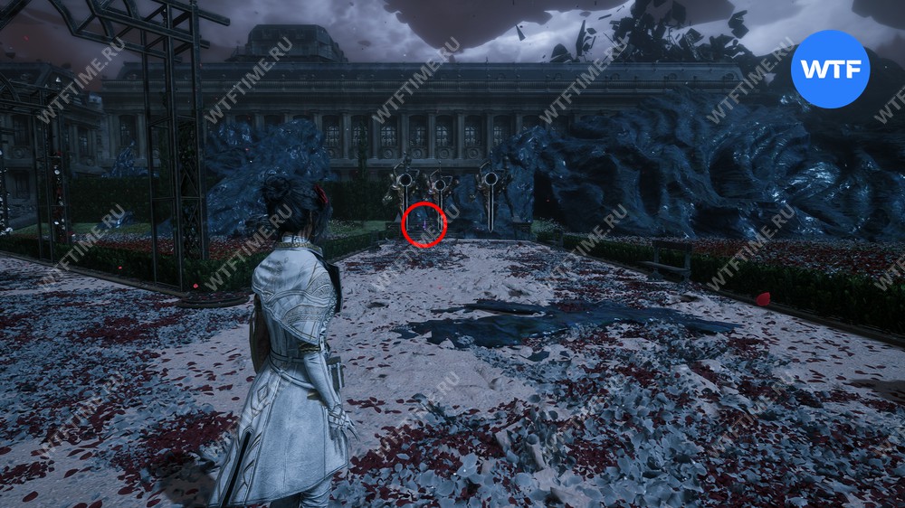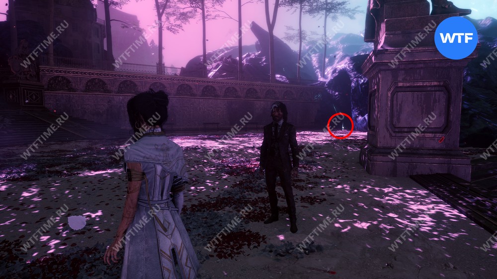 Третья лестница справа приведет вас к еще одному отряду из двух аберраций. Разобравшись с ними, загляните за зеленую изгородь, чтобы найти 2450 хромы.