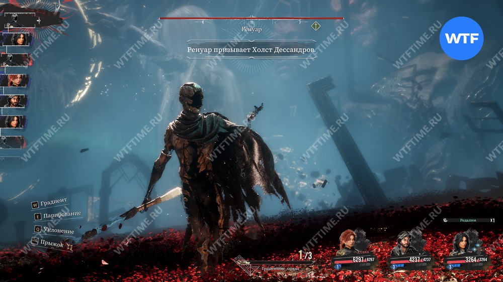 - Ренуар бьет со всей мощи — босс взлетает в воздух, делает несколько кругов вокруг арены, затем зависает в воздухе и четыре раза атакует Экспедицию. Прожимайте кнопку, когда увидите золотое свечение.