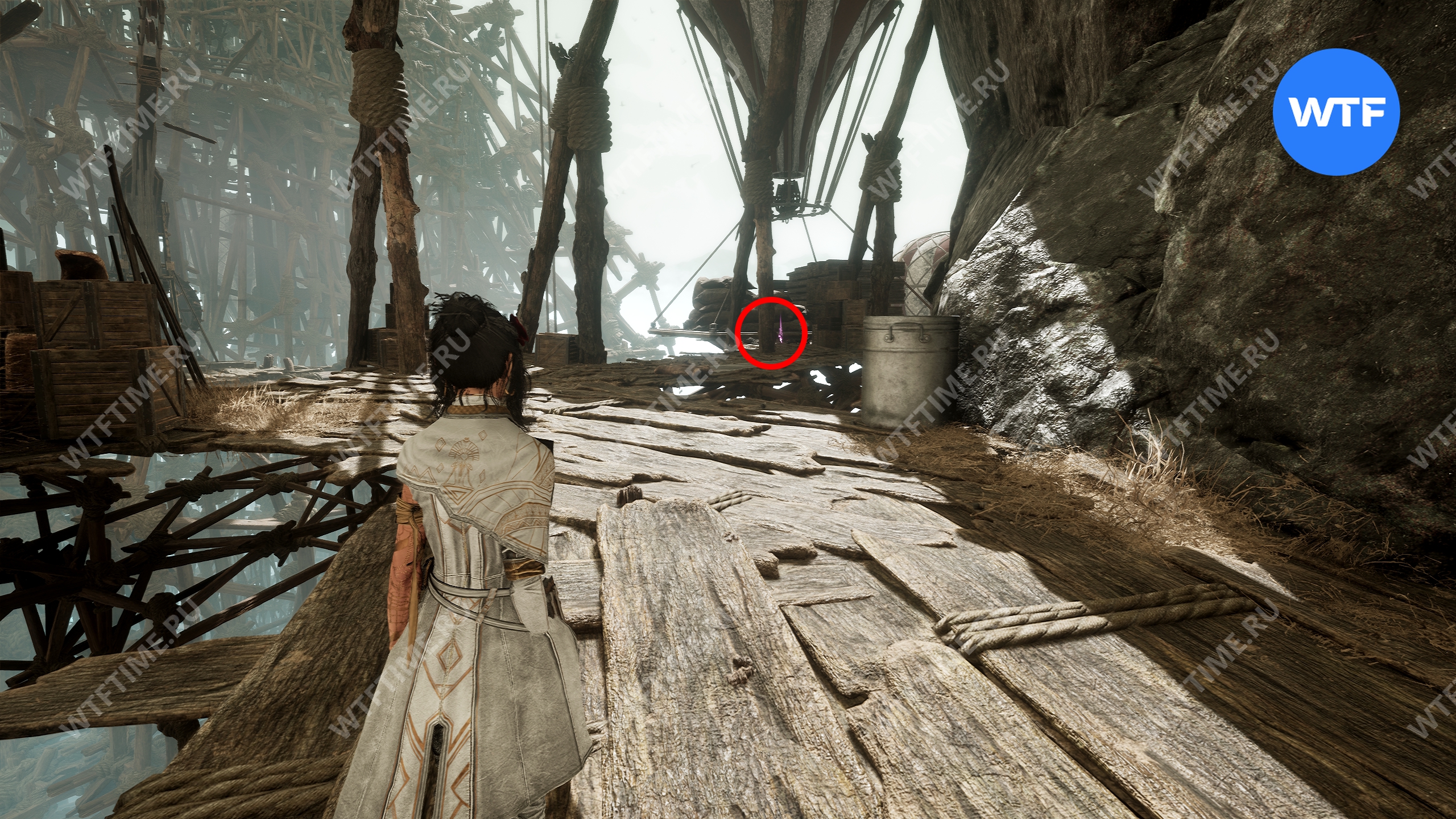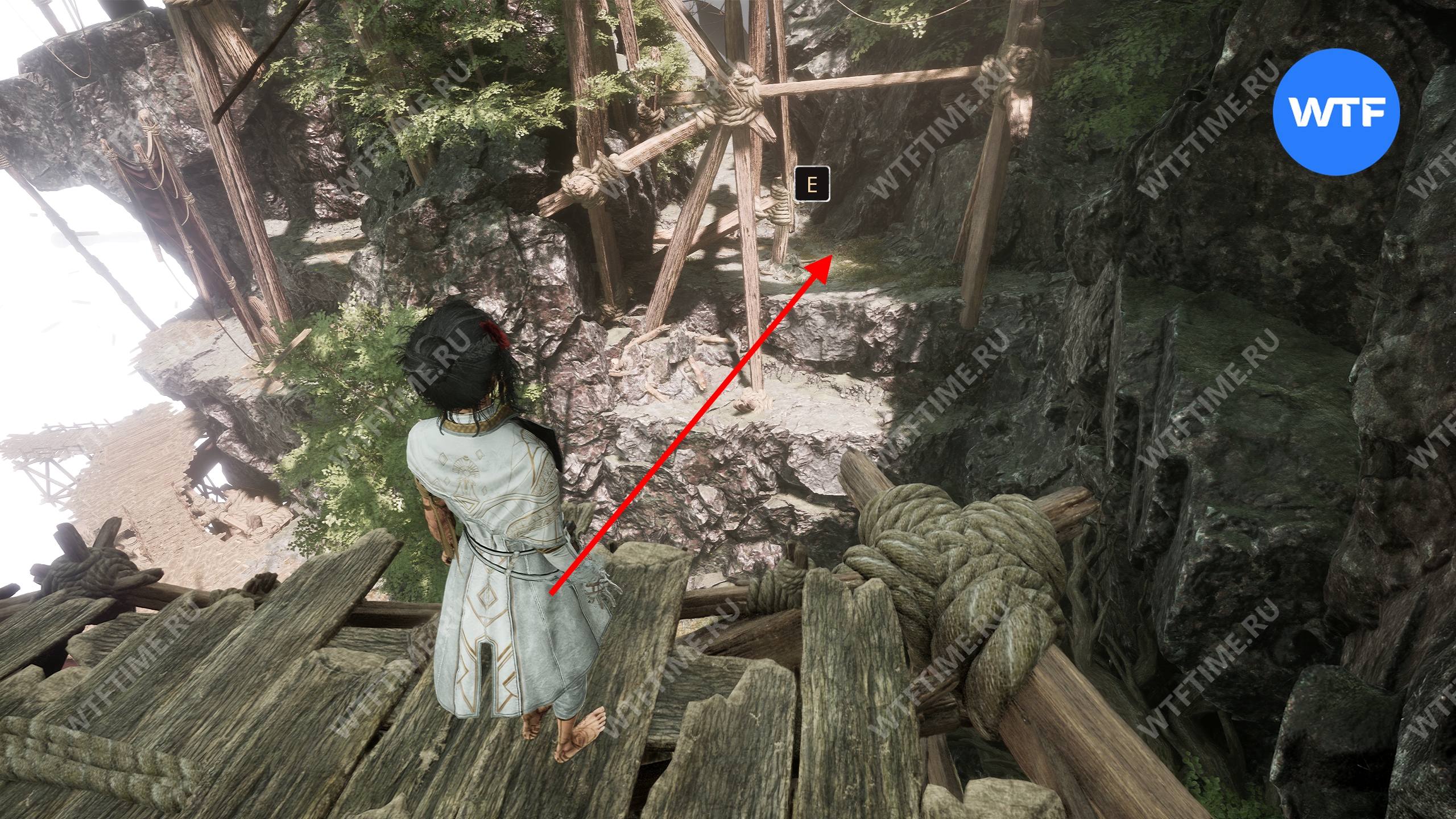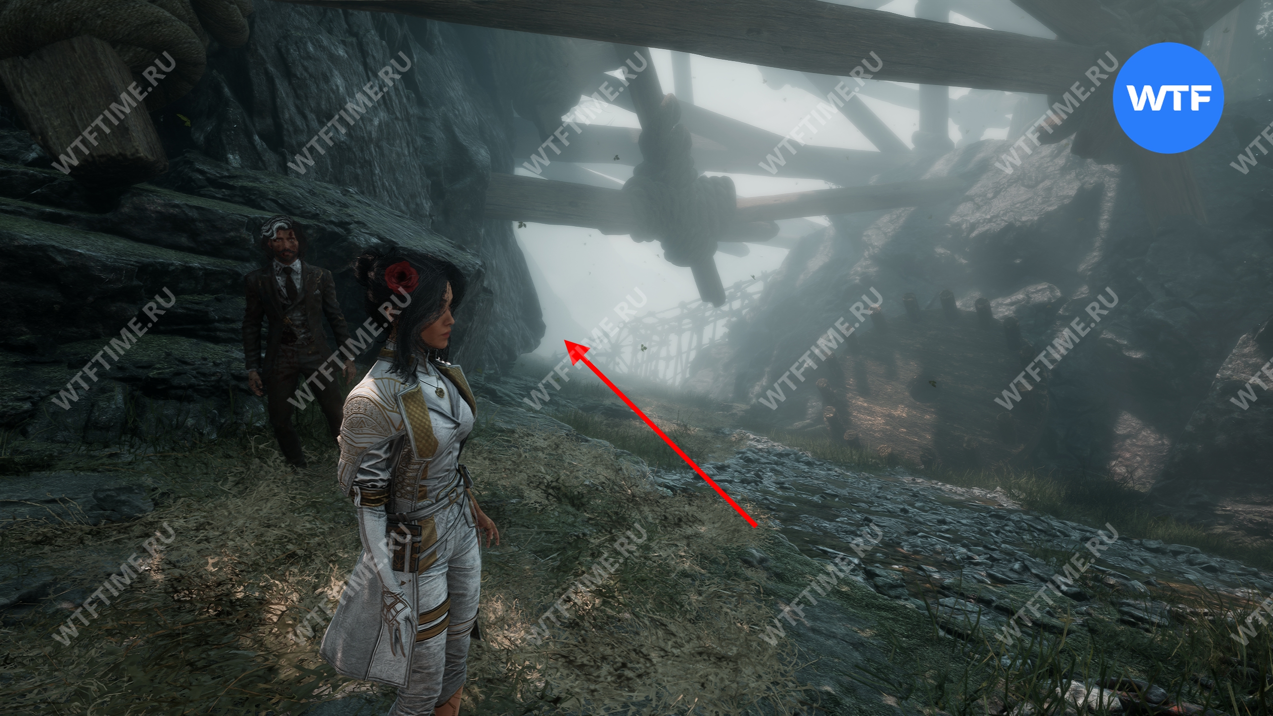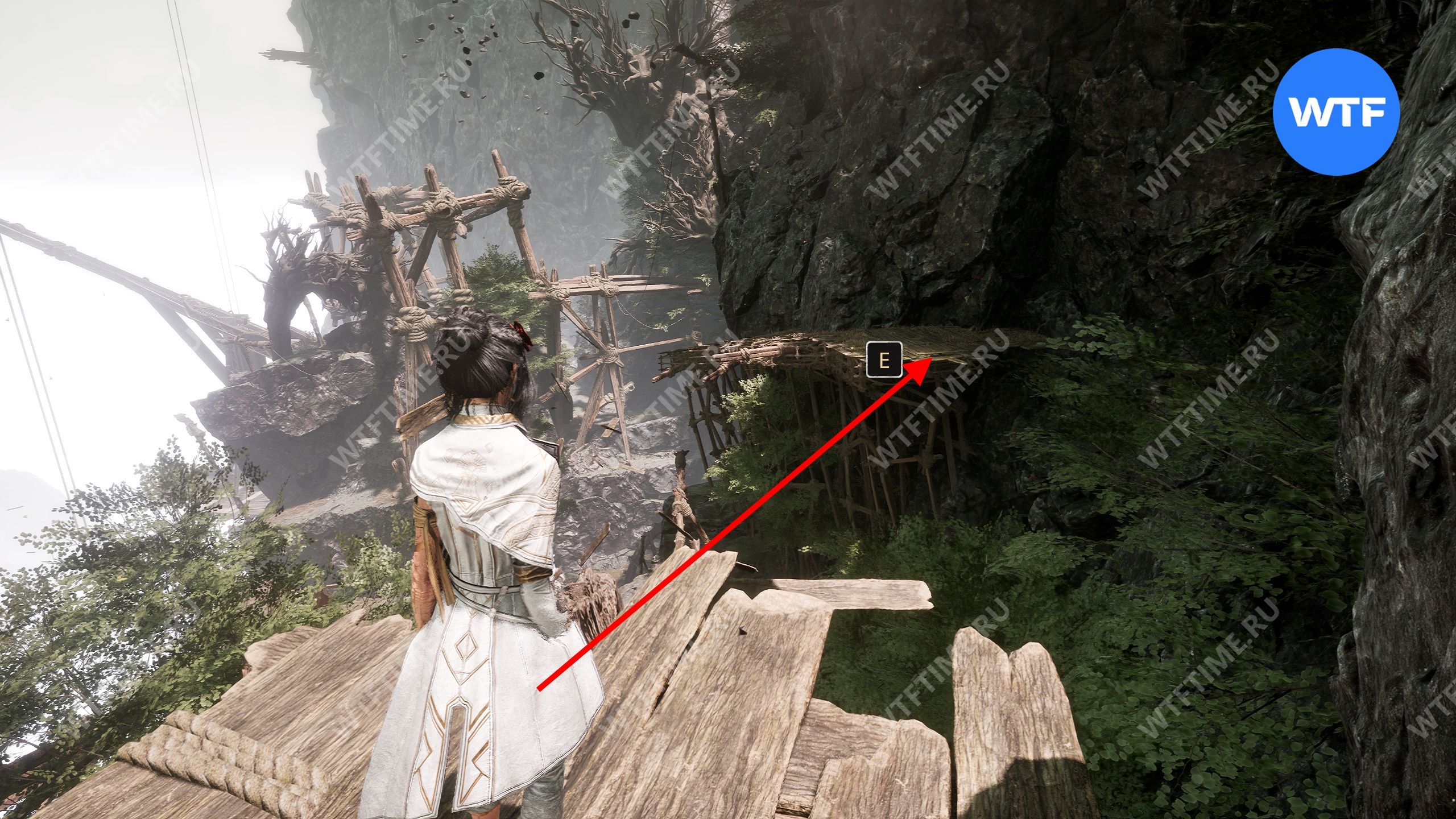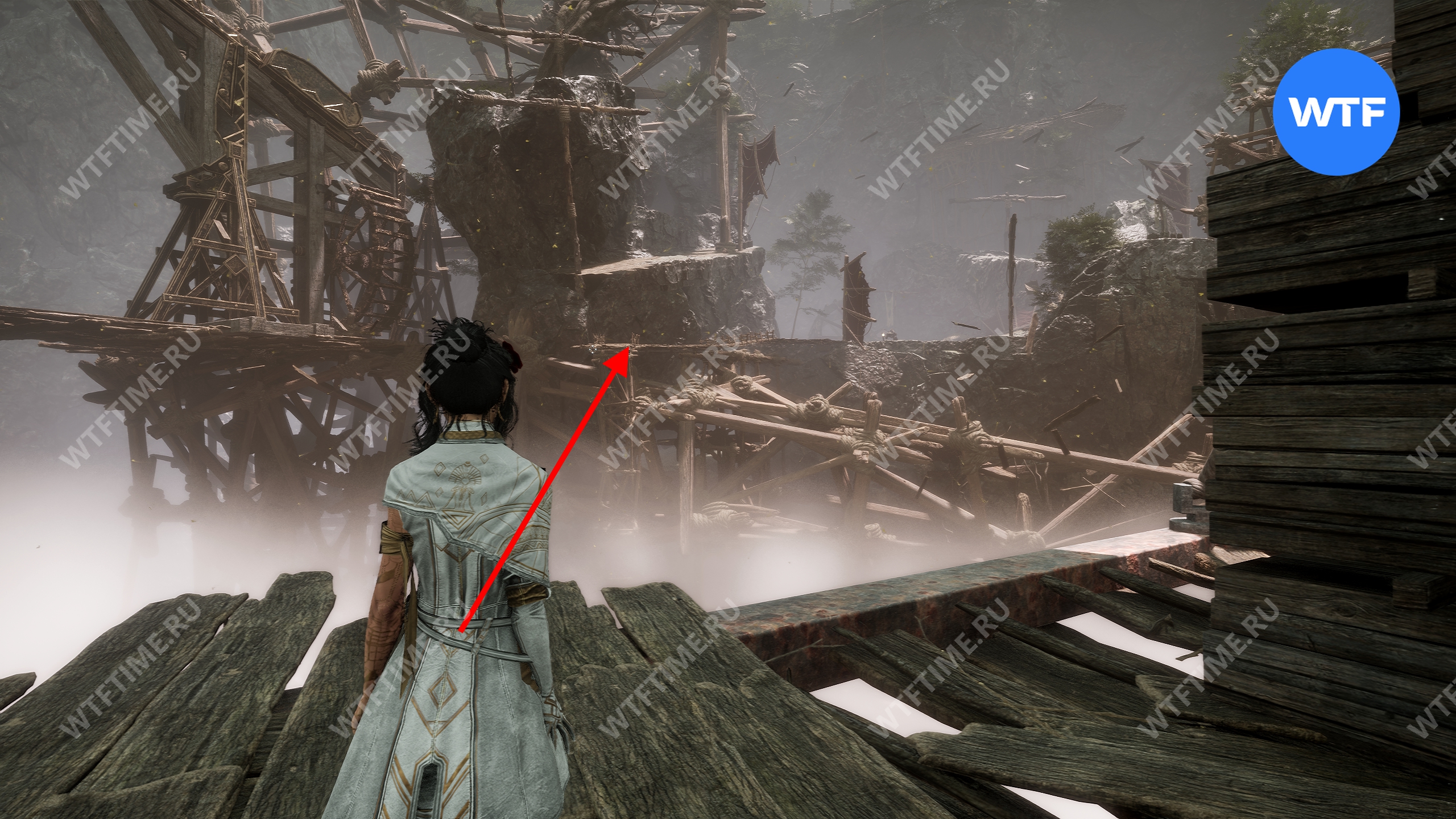 Разберитесь с врагами и идите вперед, пока не увидите Тающего мужчину. Поговорите с ним, а затем идите направо до конца и используйте точку захвата. Пройдите вперед по деревянному помосту и снова переберитесь через пропасть.