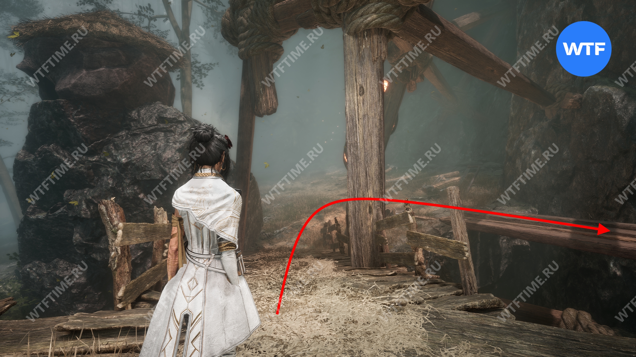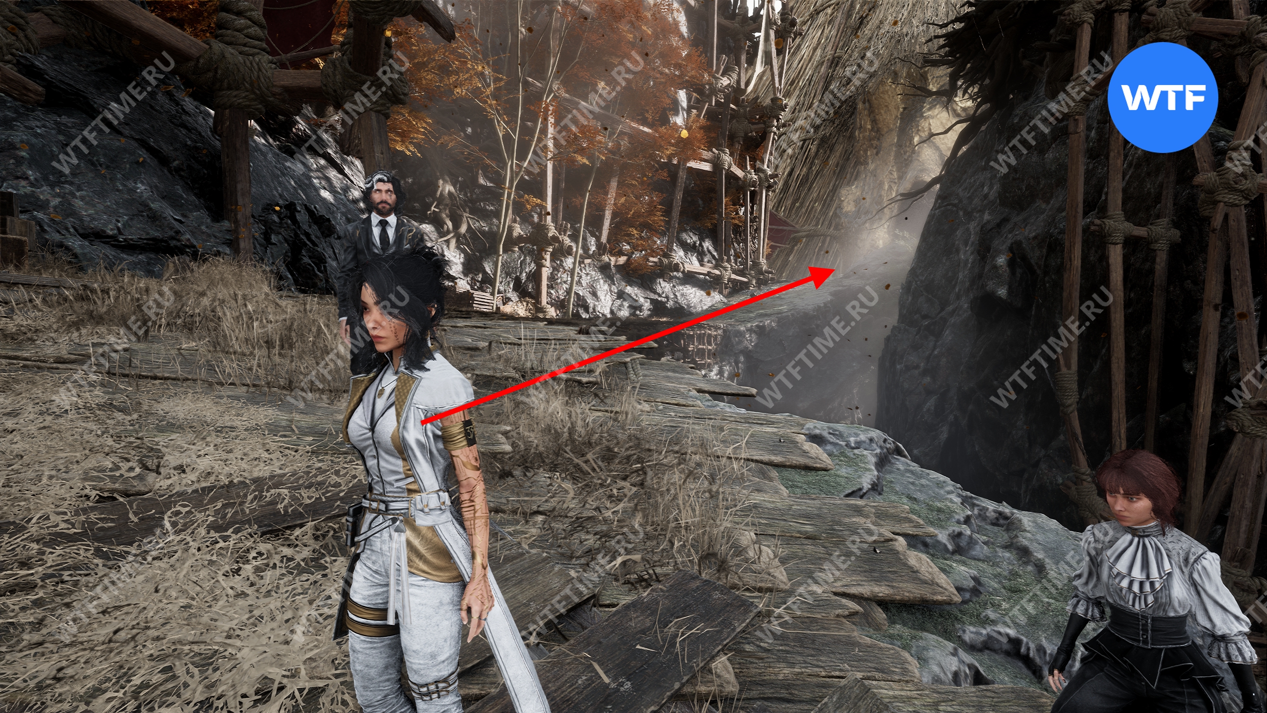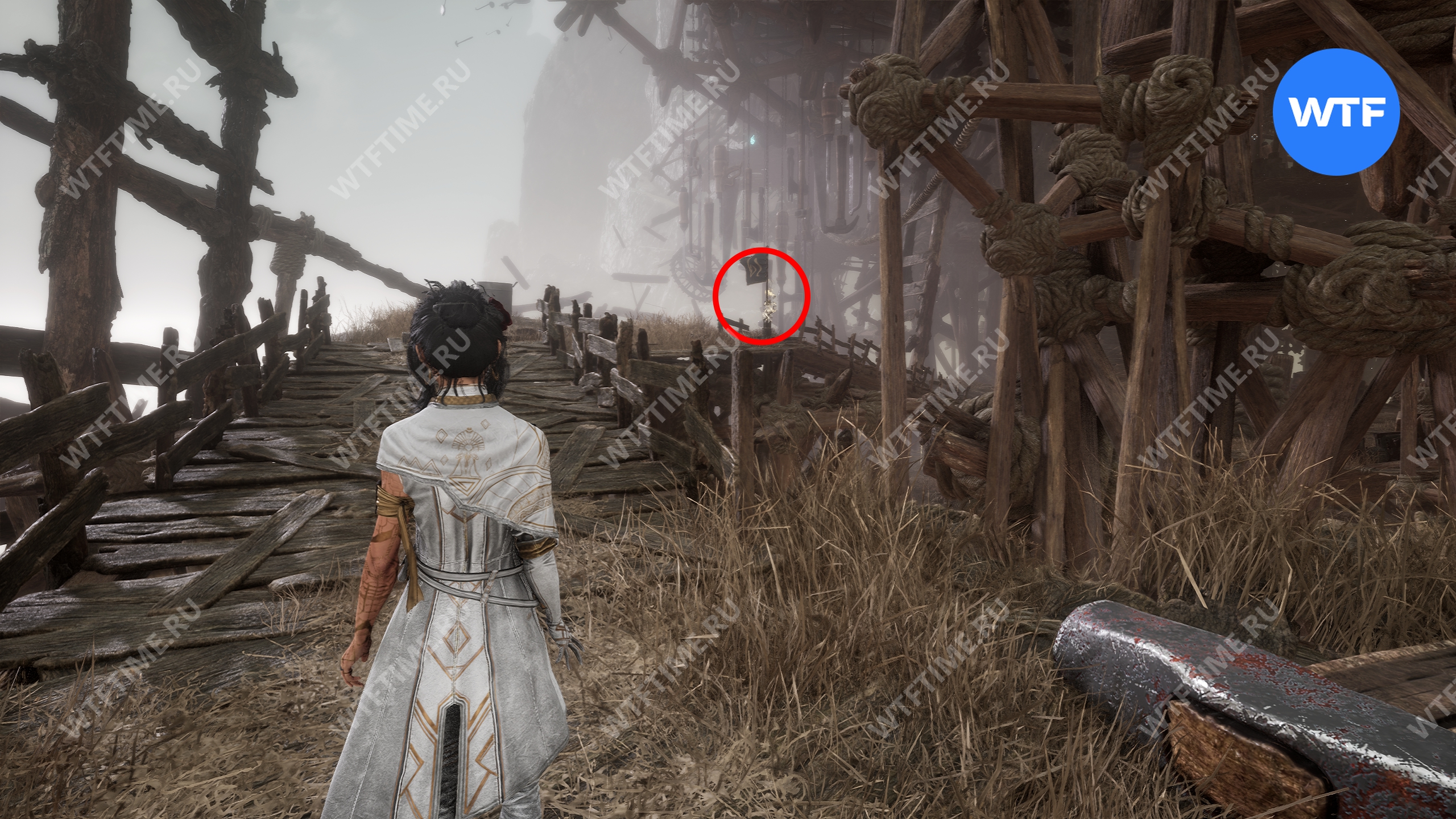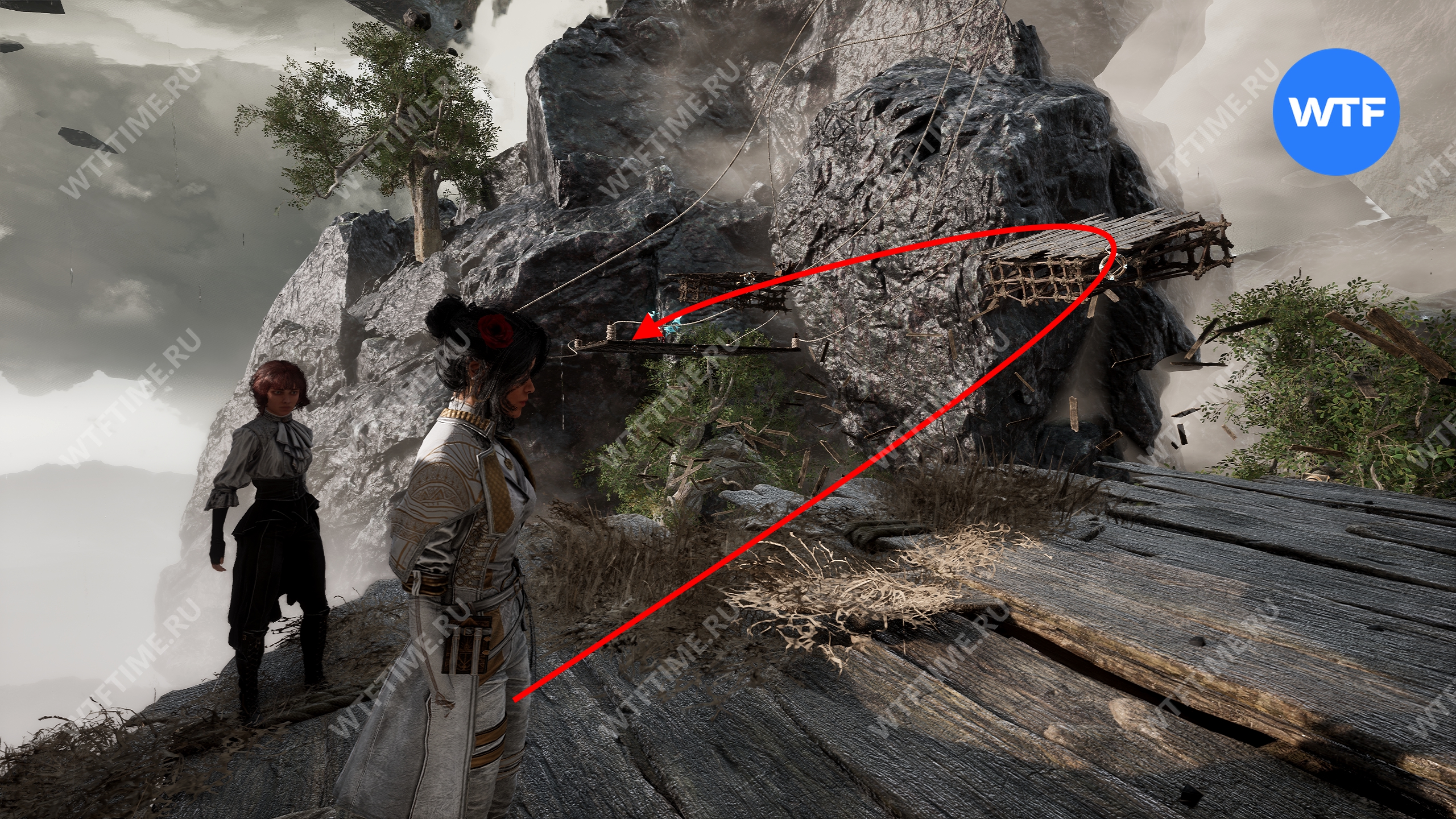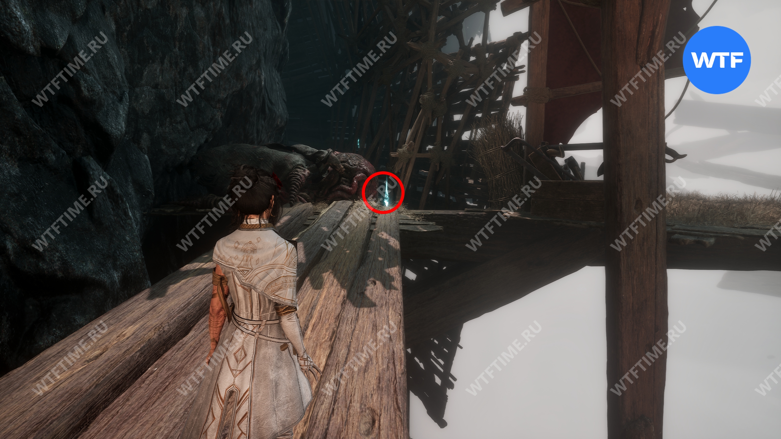 Разберитесь с врагами и идите вперед, пока не увидите Тающего мужчину. Поговорите с ним, а затем идите направо до конца и используйте точку захвата. Пройдите вперед по деревянному помосту и снова переберитесь через пропасть.