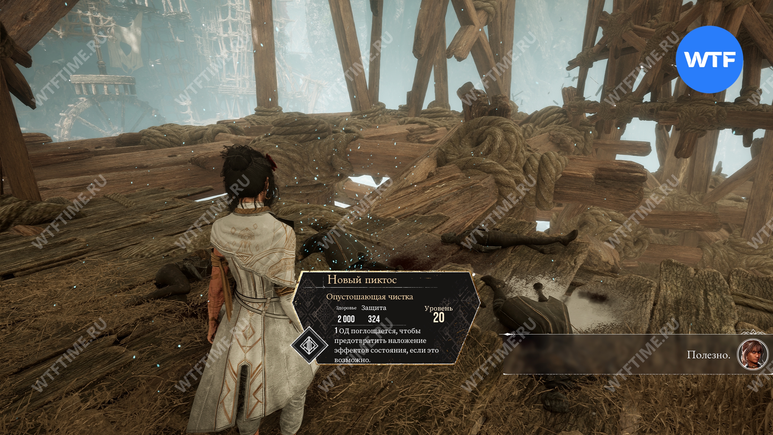 Вернитесь обратно к веревке и теперь от неё идите направо. Разберитесь с сиротками и заберите пиктос «Опустошающая чистка» (уровень 20, здоровье 2000, защита 324), поглощающий 1 ОД, чтобы предотвратить наложение эффектов состояния, если это возможно.