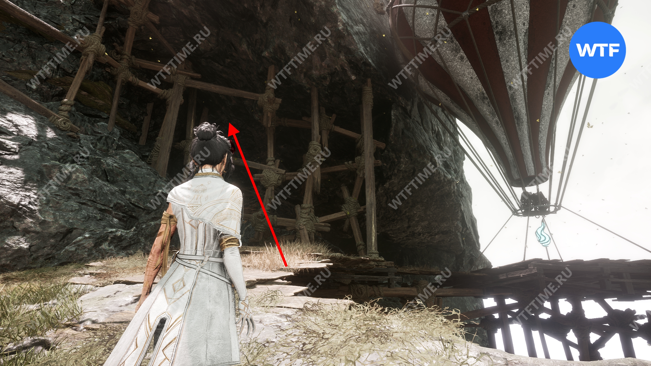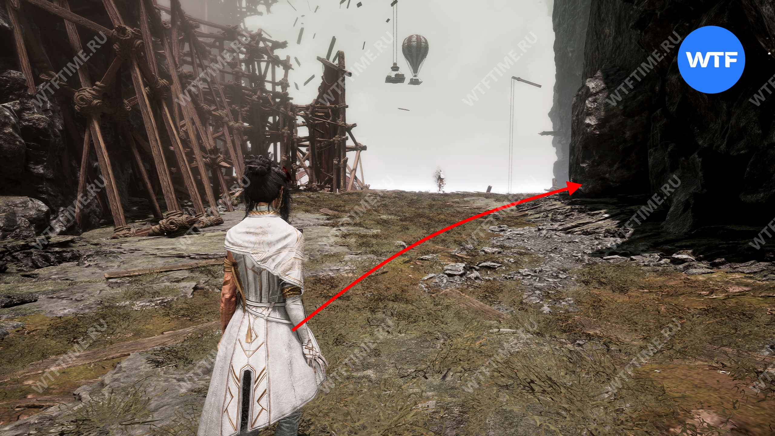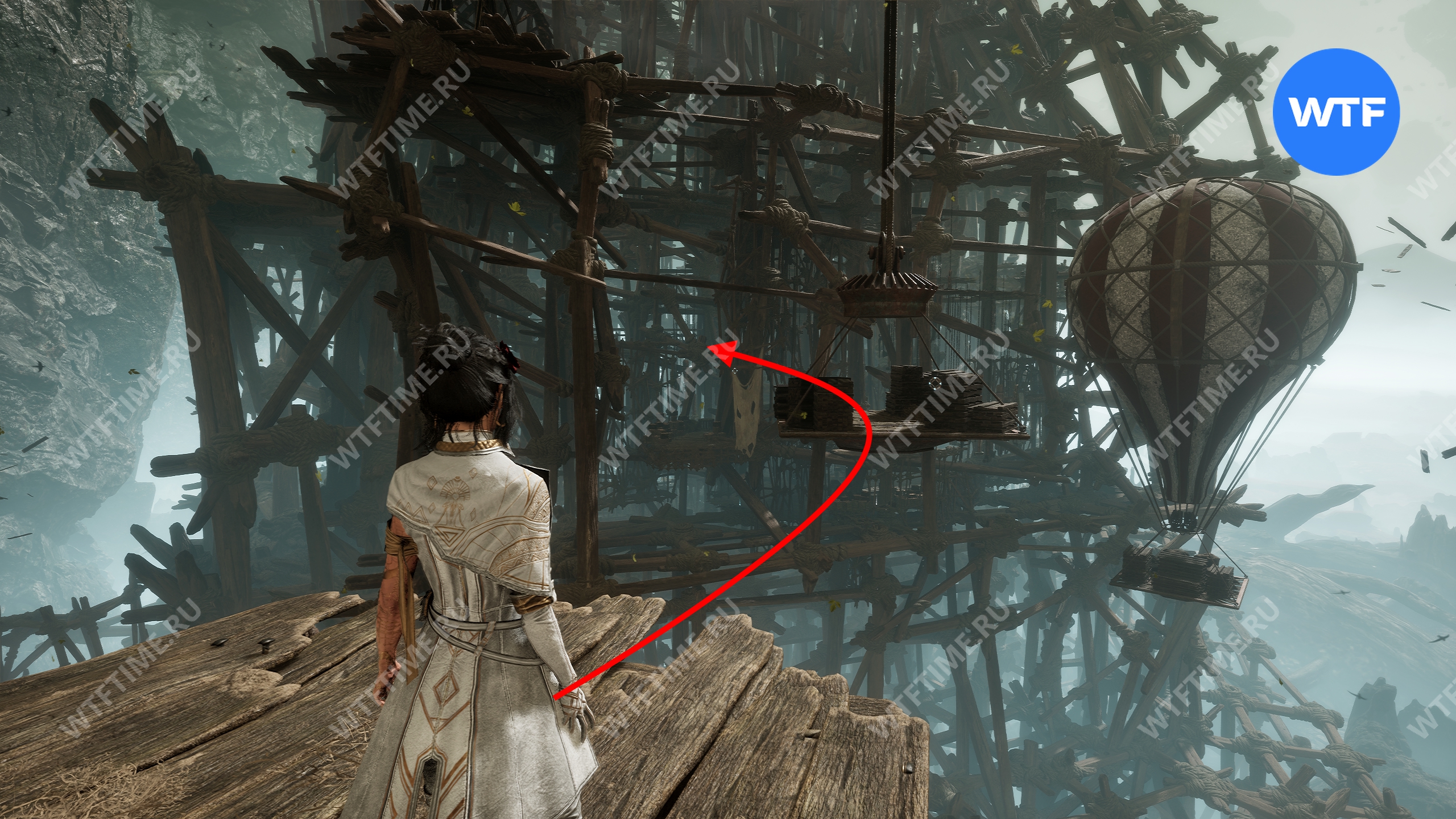 Теперь вернитесь к развилке за ходулье и на этот раз идите налево. Пройдите по этому пути до самого конца, пока не доберетесь до воздушного шара. Но вместо того чтобы лететь на нем, поднимитесь наверх по уступам на стене слева.