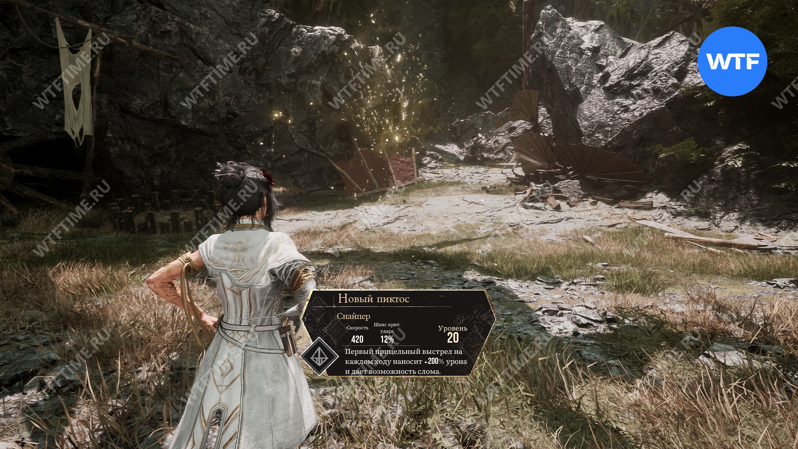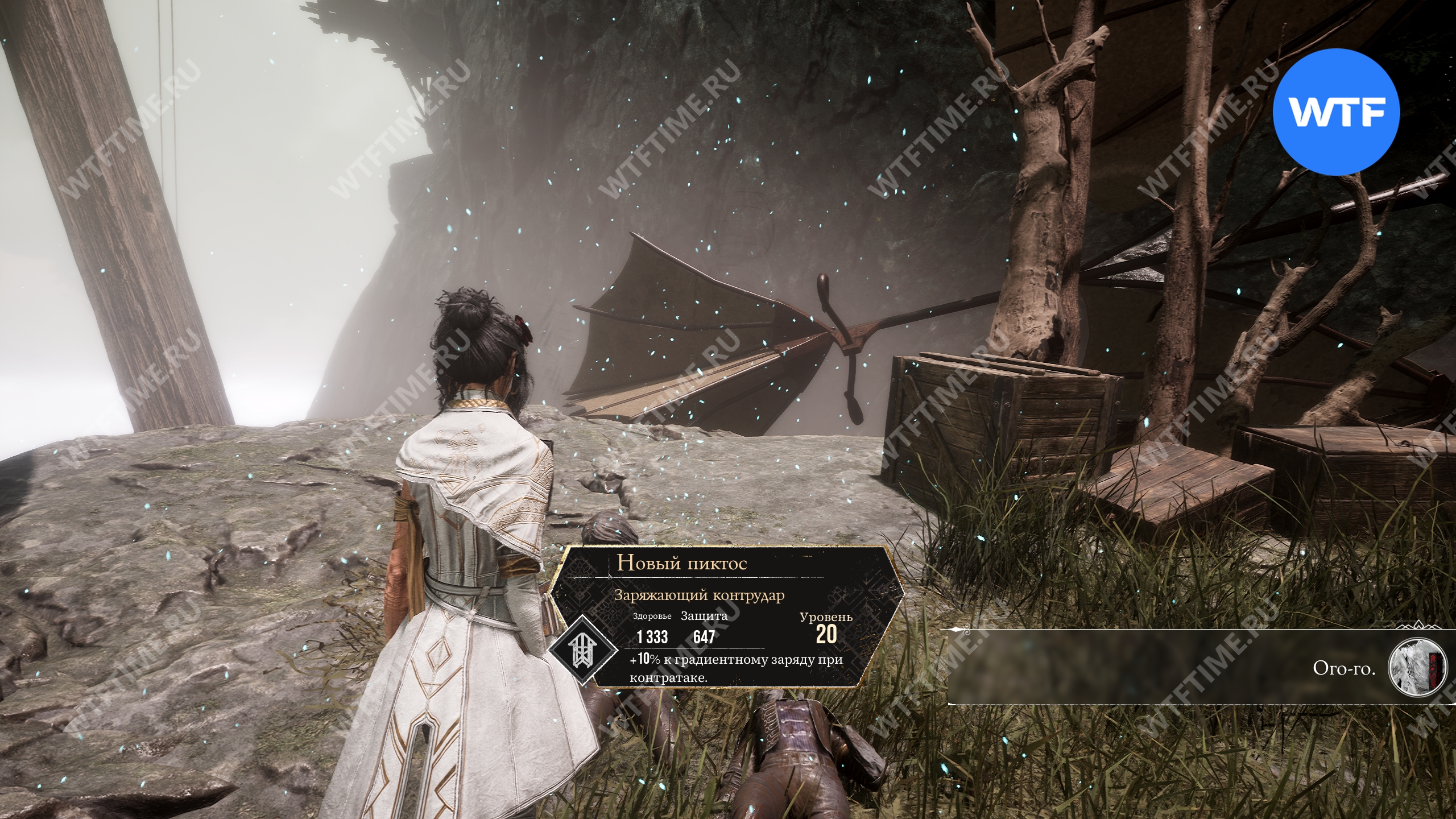 После этого в скале слева от вас будет небольшой лаз. Запомните его, но пока идите по тропинке вперед и сразитесь с ходулье, охраняющими пиктос «Заряжающий контрудар» (уровень 20, здоровье 1333, защита 647), дающий +10% к градиентному заряду при контратаке.