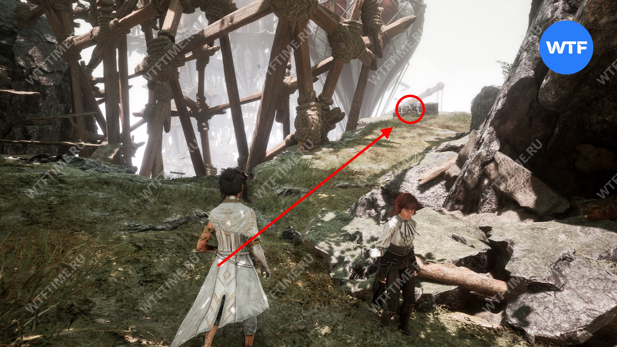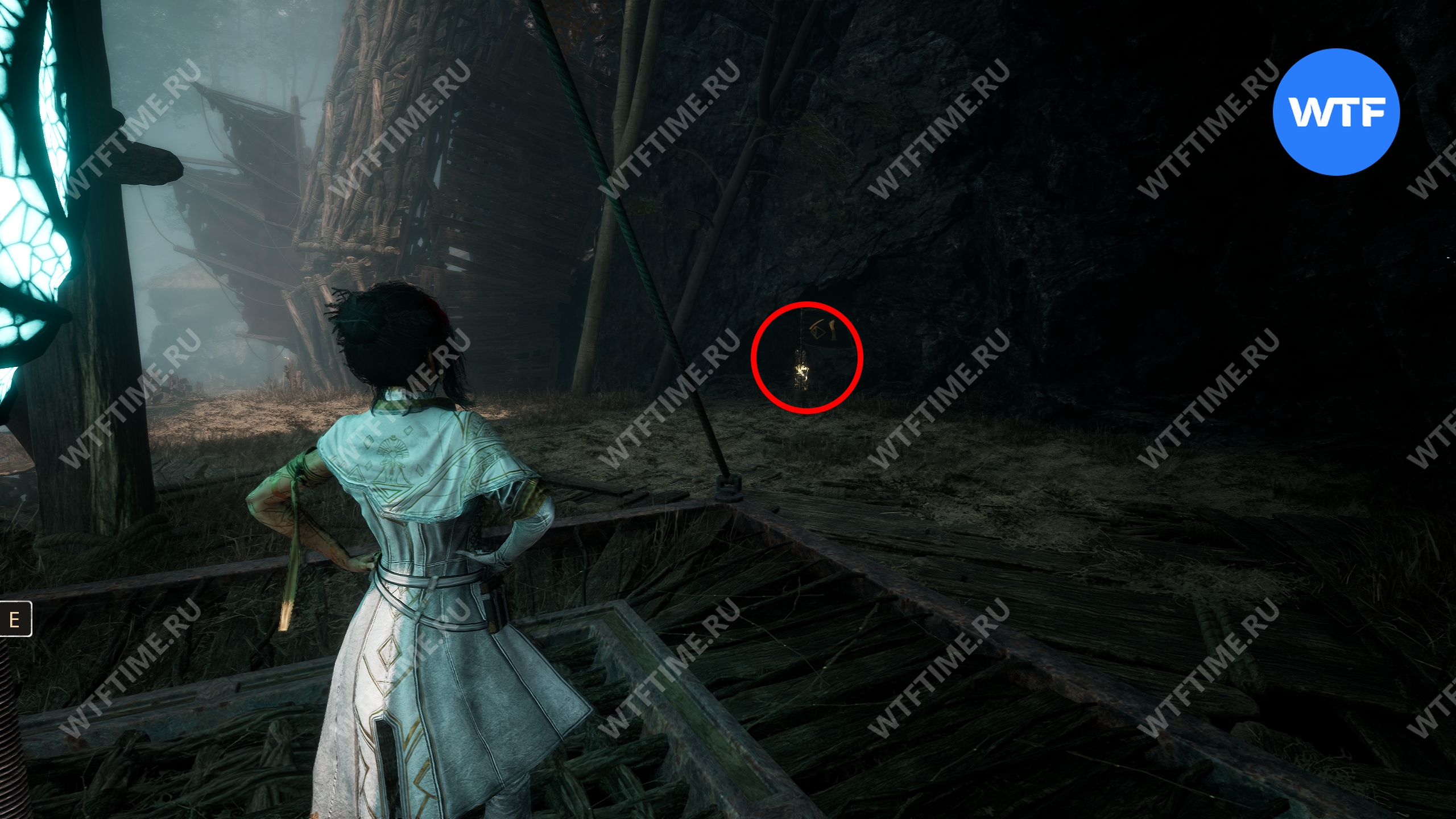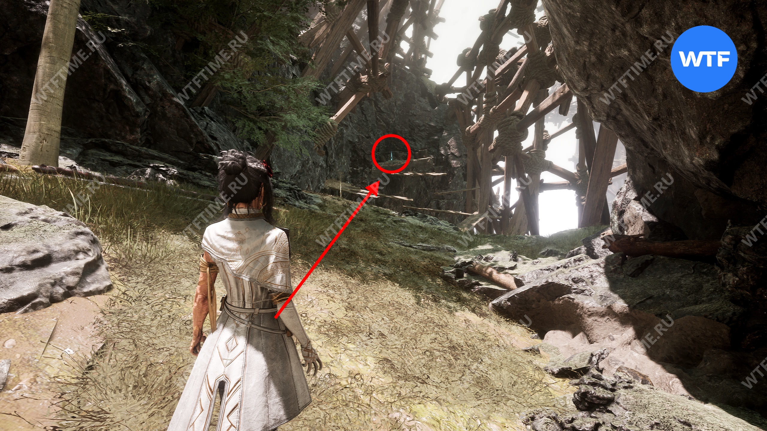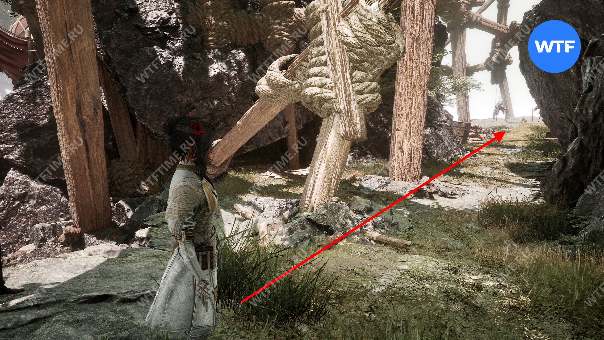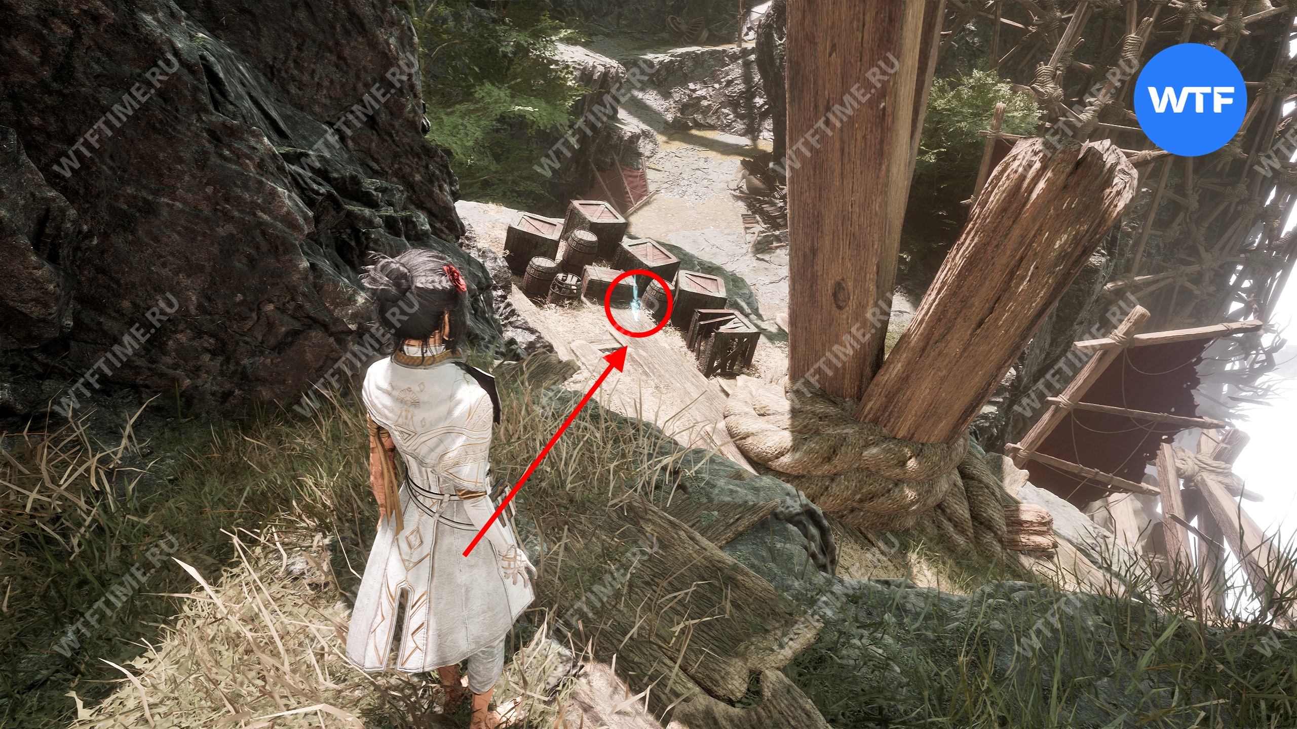 Затем от веревки идите направо и используйте точку захвата. Дойдя по этой тропе до самого конца, вы сможете подобрать 6255 хромы у ящиков.