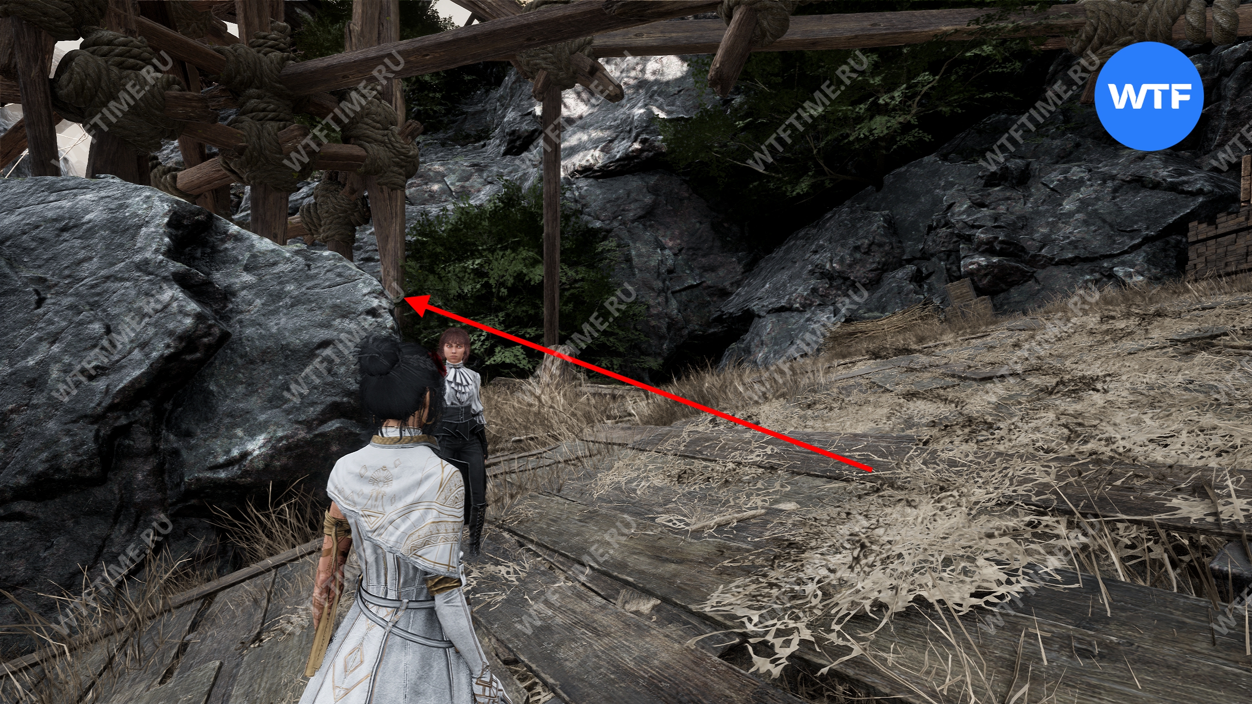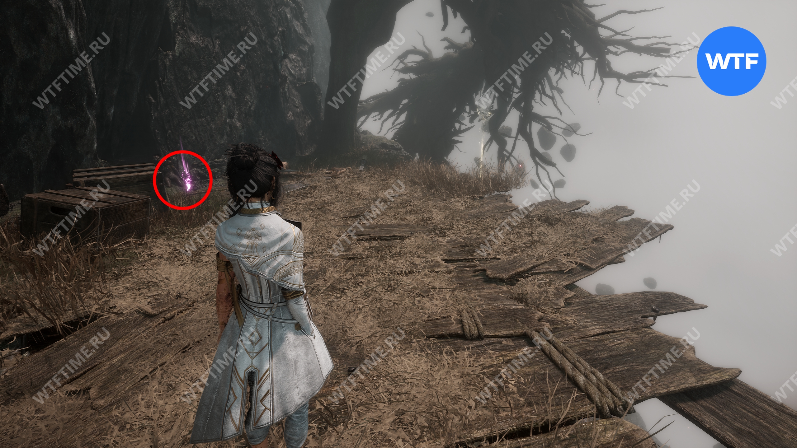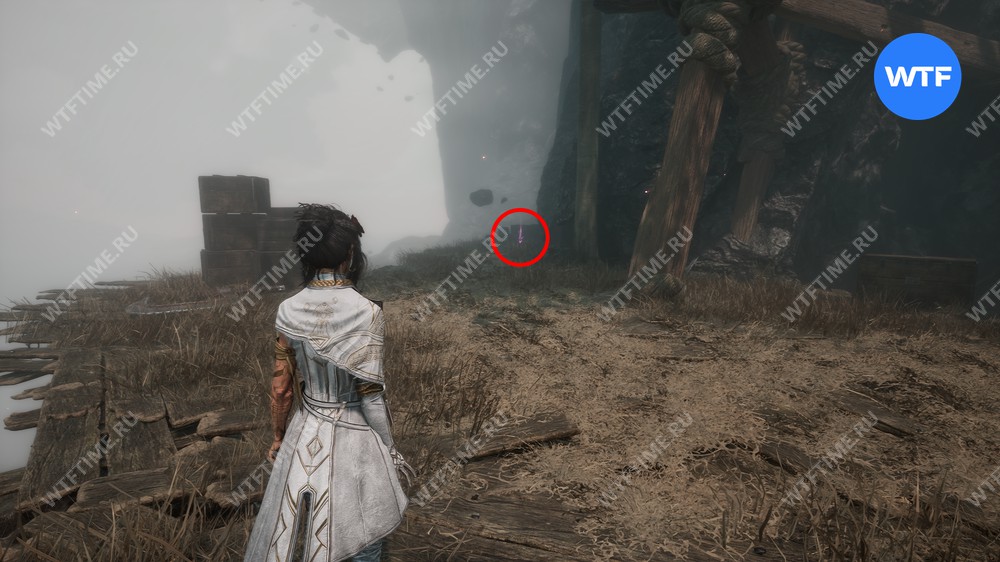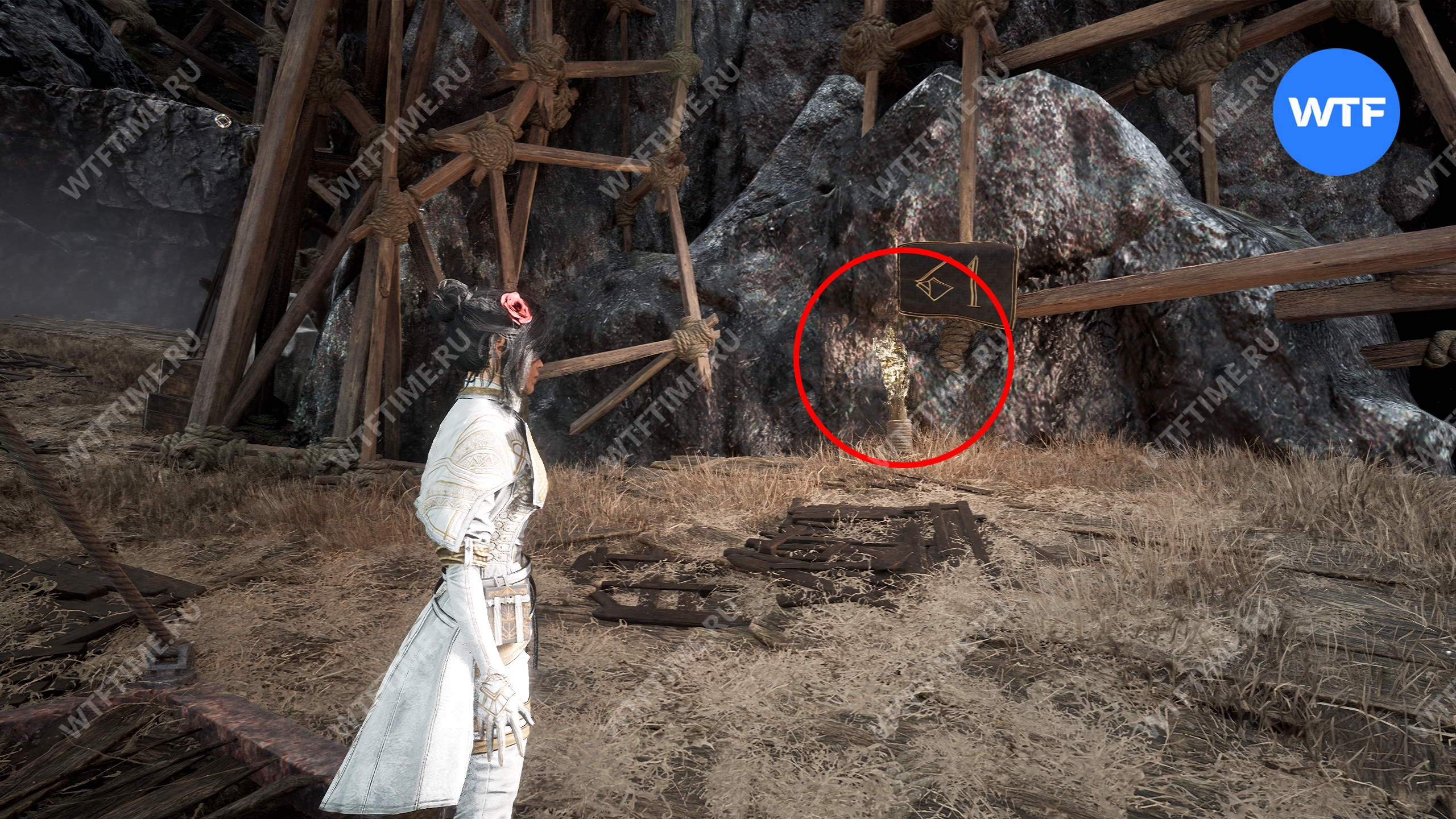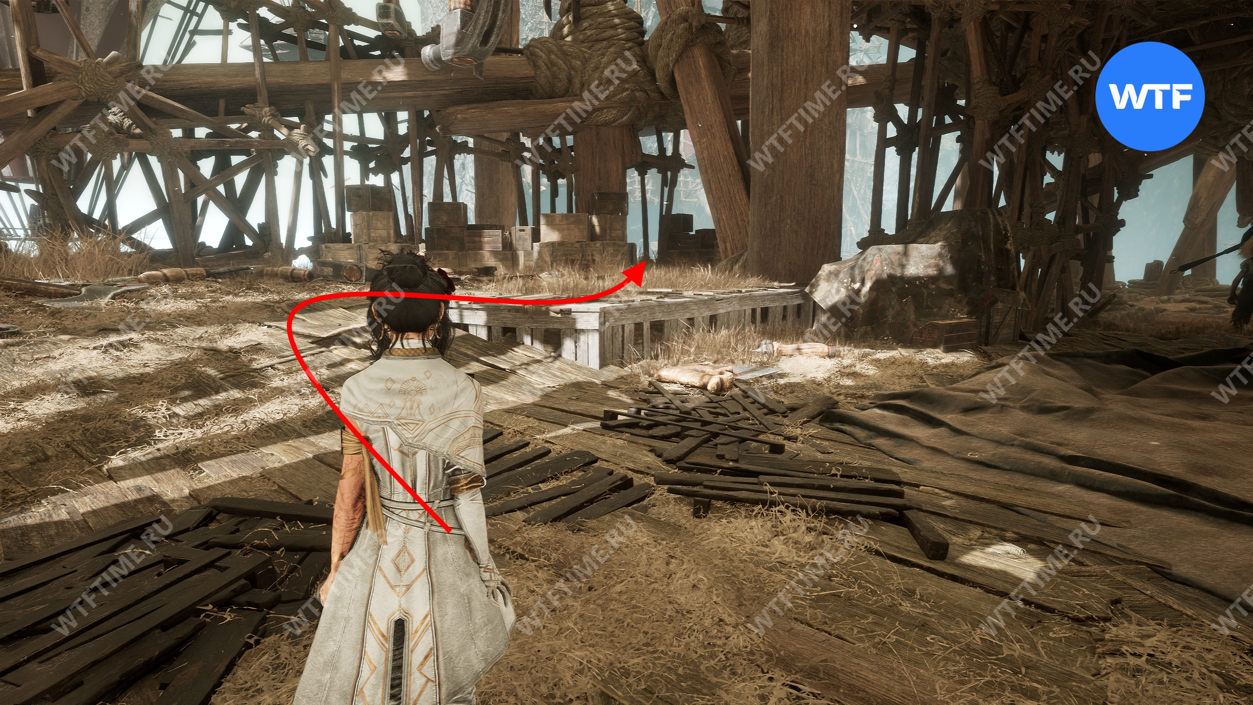 Затем от веревки идите направо и используйте точку захвата. Дойдя по этой тропе до самого конца, вы сможете подобрать 6255 хромы у ящиков.