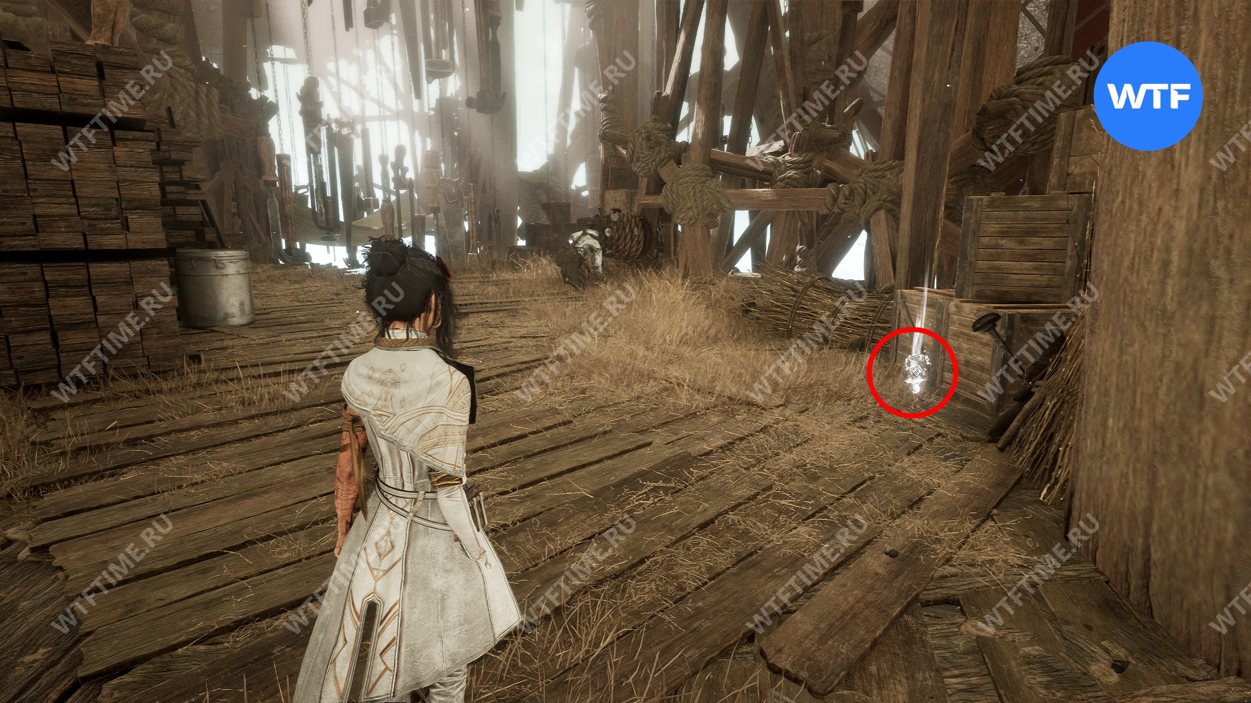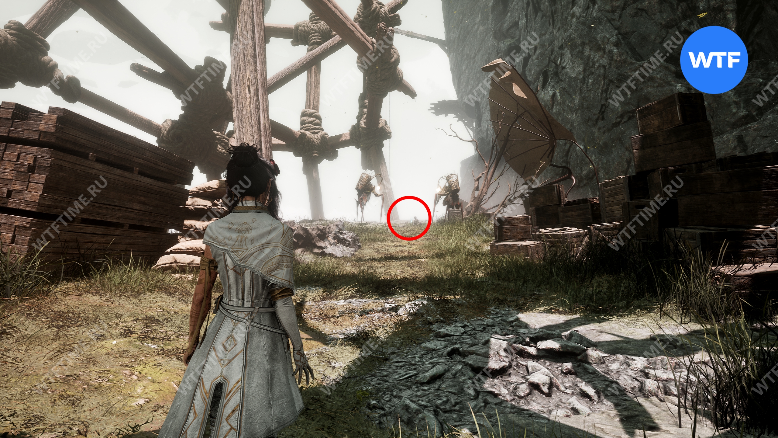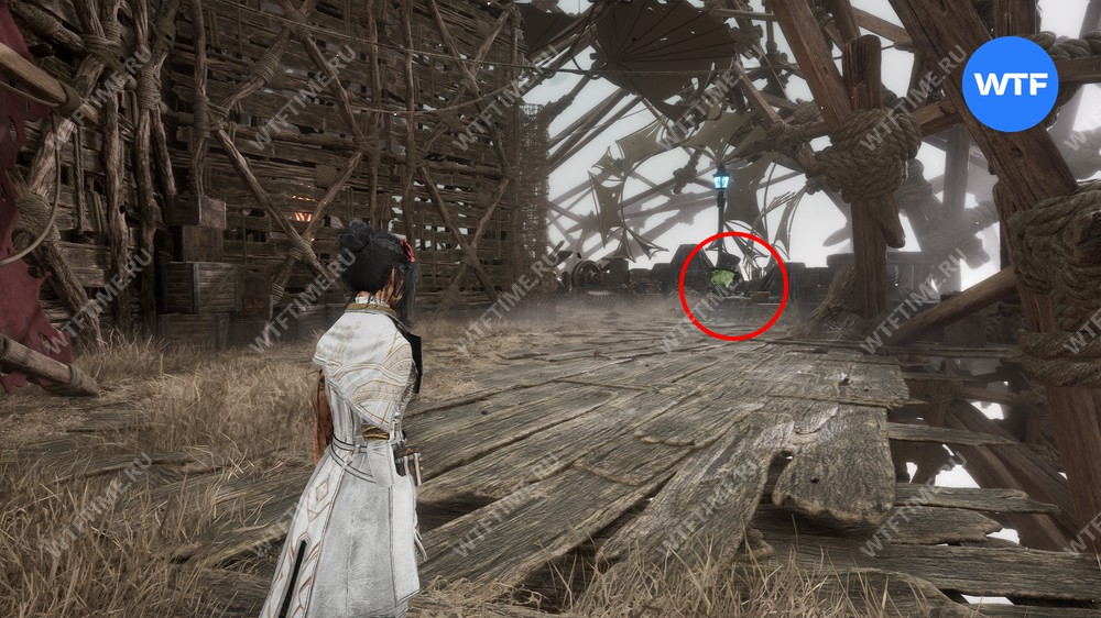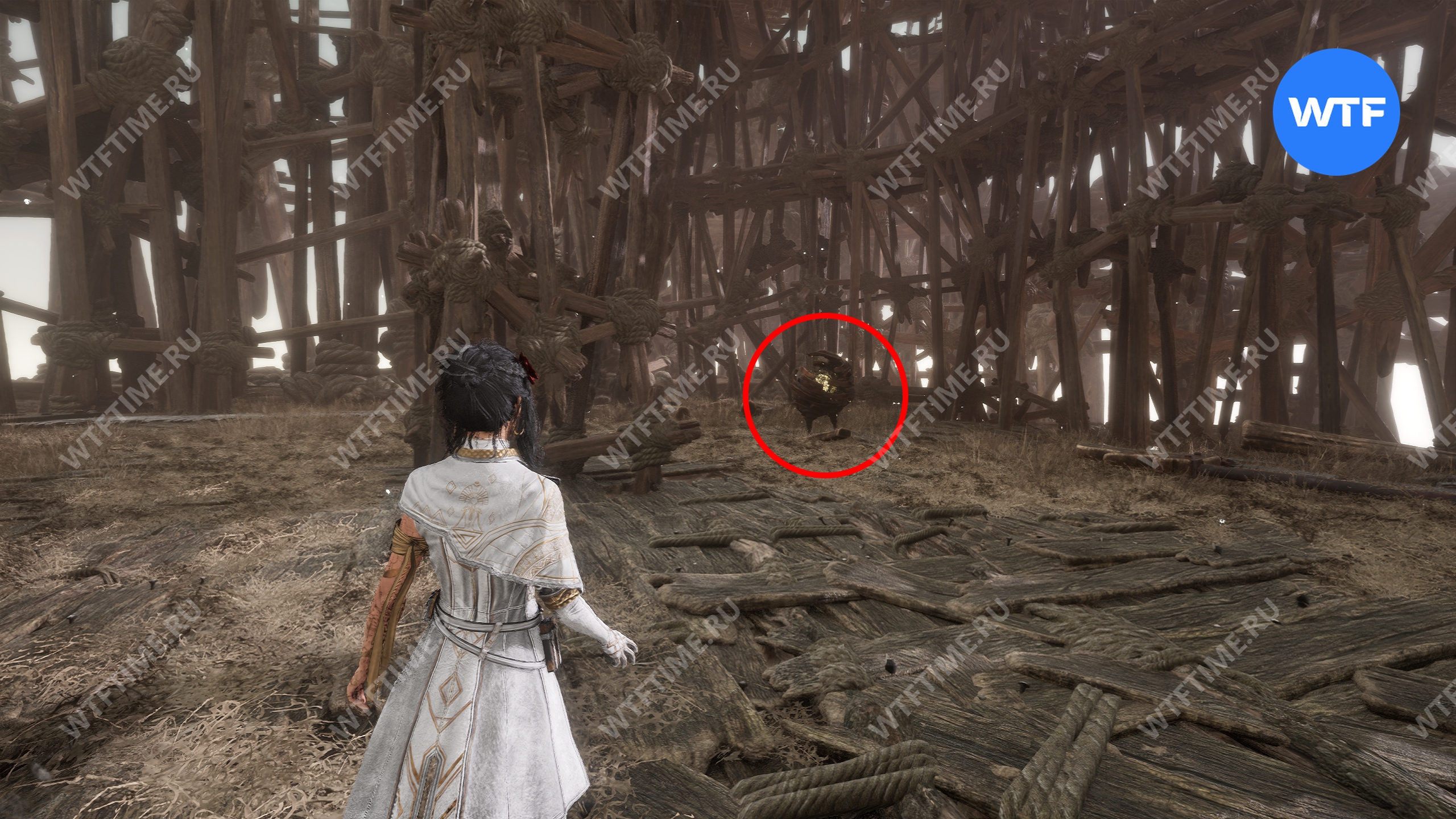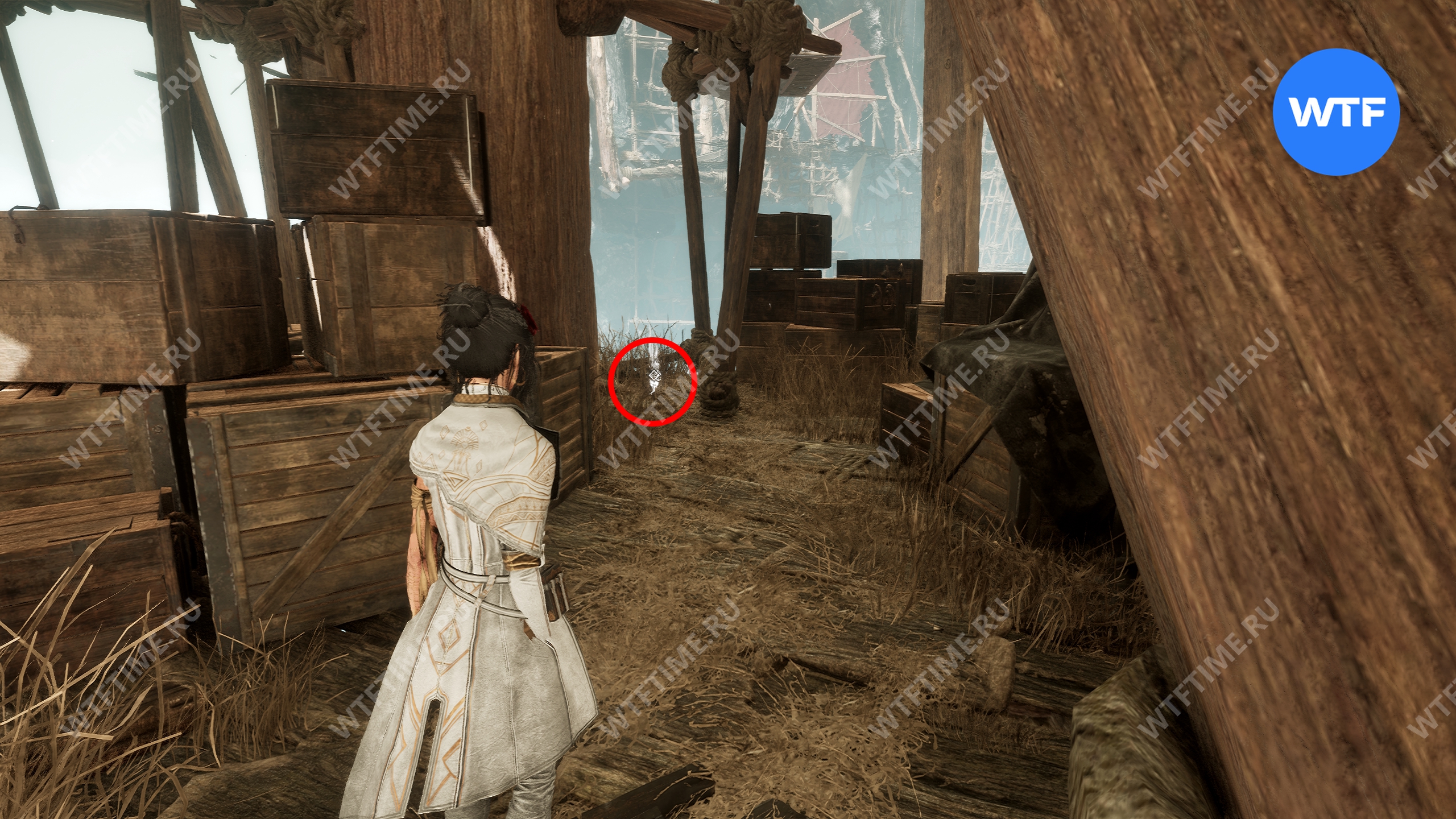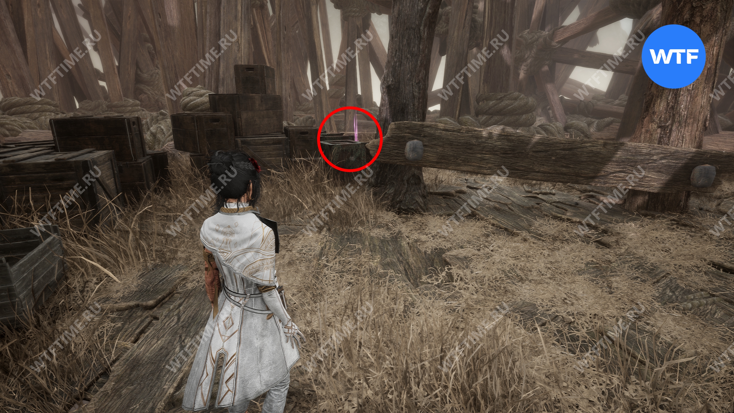 Затем от веревки идите направо и используйте точку захвата. Дойдя по этой тропе до самого конца, вы сможете подобрать 6255 хромы у ящиков.