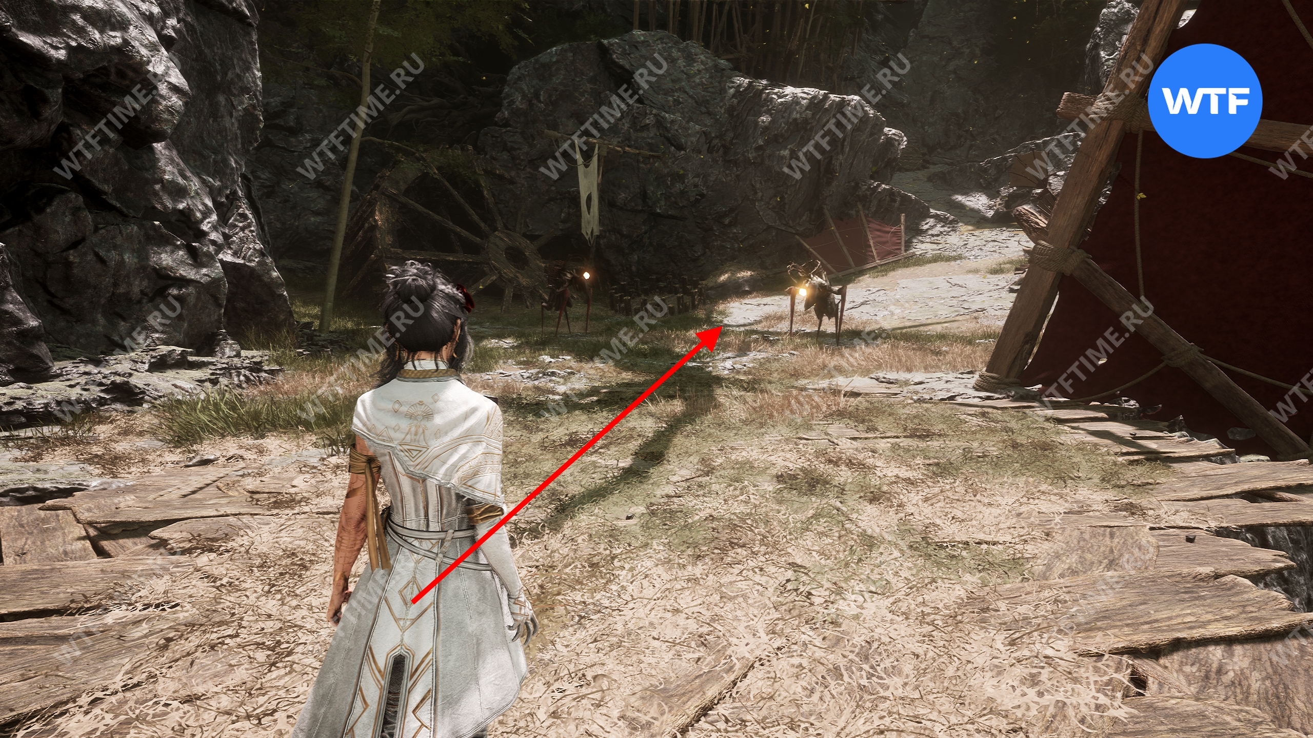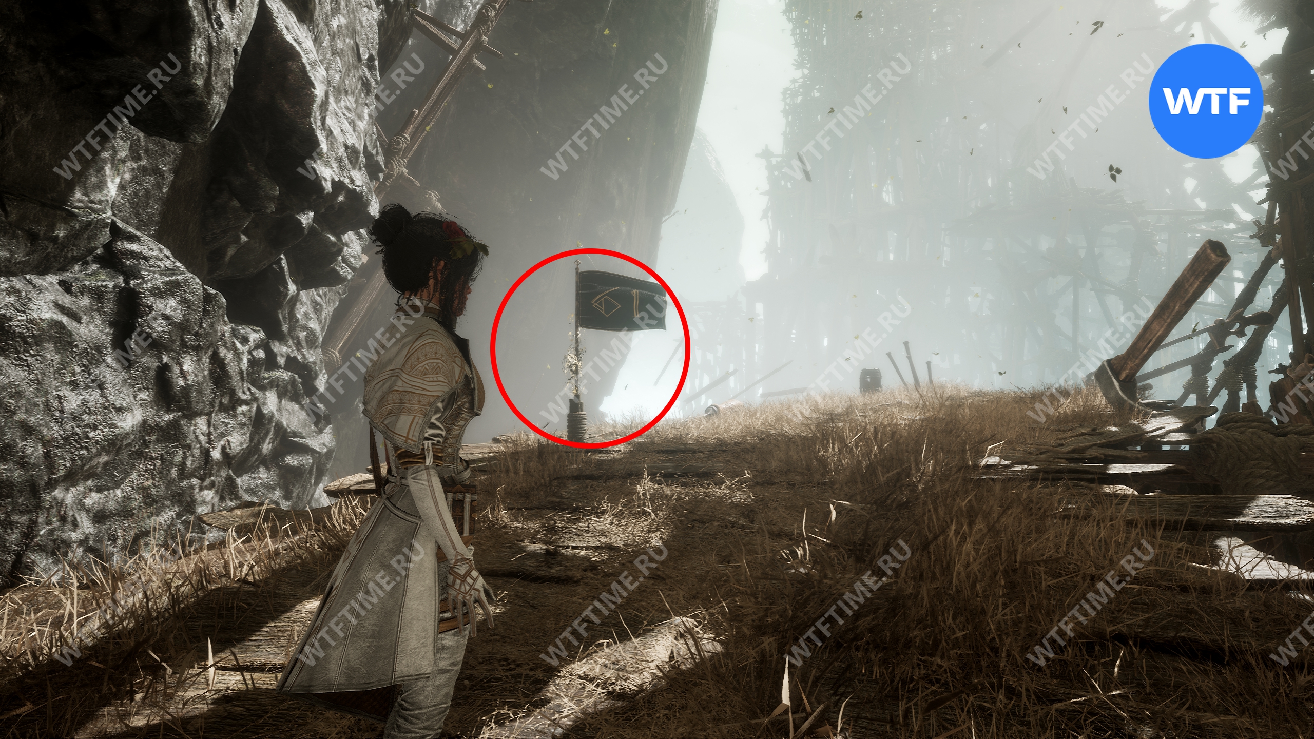 Пройдя через портал, бегите вперед по деревянному помосту и очень скоро увидите первый флаг экспедиции.