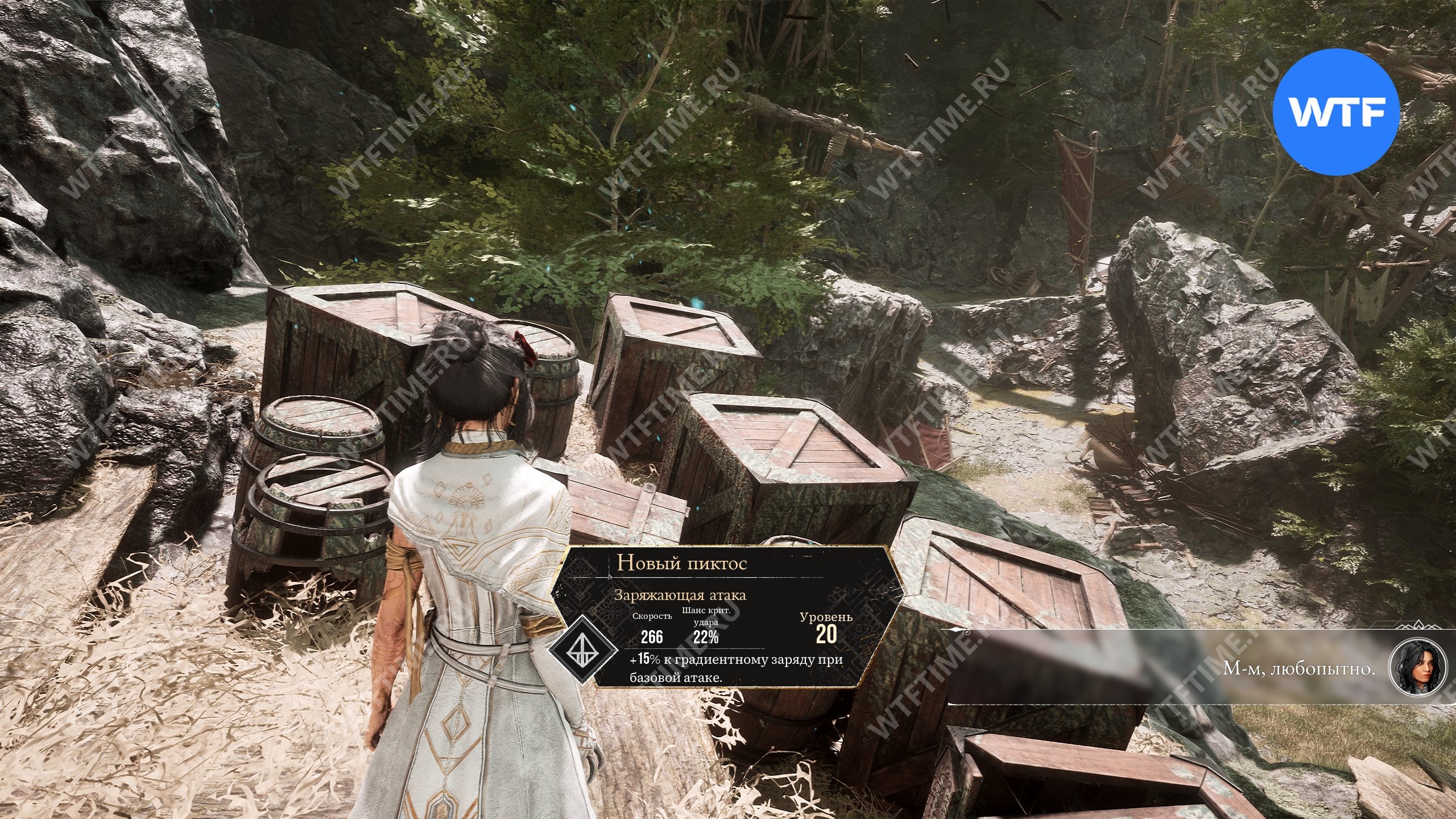 Теперь вернитесь обратно к лазу и, пробравшись через него, спрыгните вниз с уступа слева, чтобы забрать пиктос «Заряжающая атака» (уровень 20, скорость 266, шанс крит. удара 22%), дающий +15% к градиентному заряду при базовой атаке.