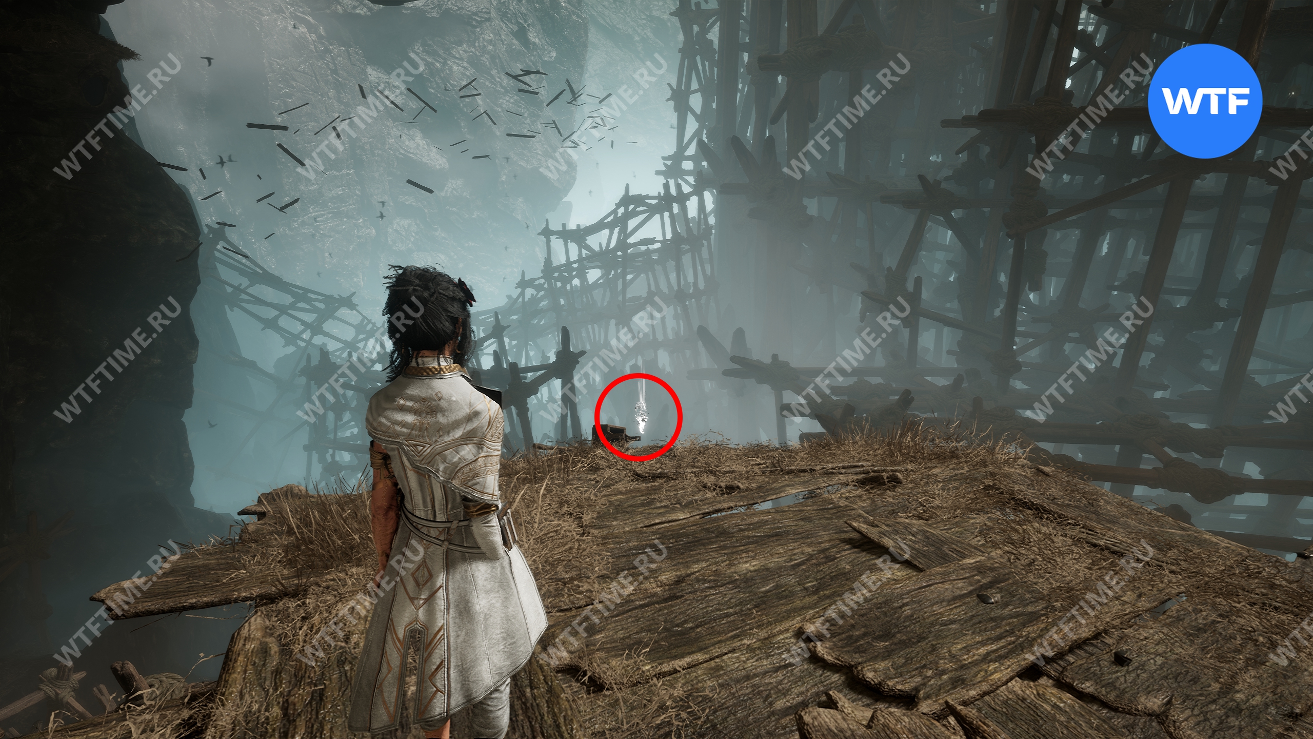 От предыдущих ходулье пройдите немного вперед и окажетесь на развилке. Здесь вам нужно повернуть направо, а затем на следующей развилке еще раз направо, чтобы забрать хрому 3128 хромы возле ящиков у обрыва.