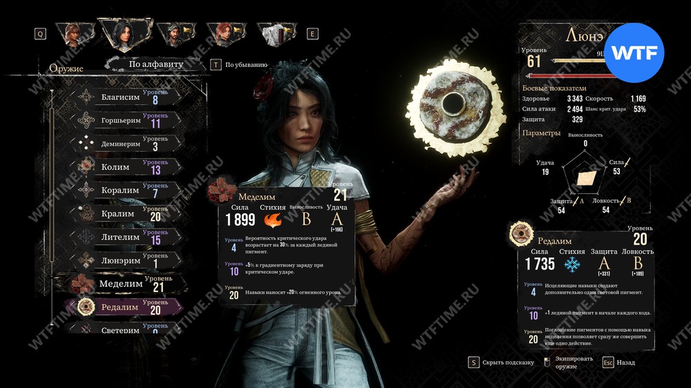 За победу над Хрома-медником вы получите 2 сверкающих катализатора хромы, 5 цвета люмины и оружие для Люнэ «Меделим» (уровень 21, сила 1899, стихия огонь, выносливость B, удача A).