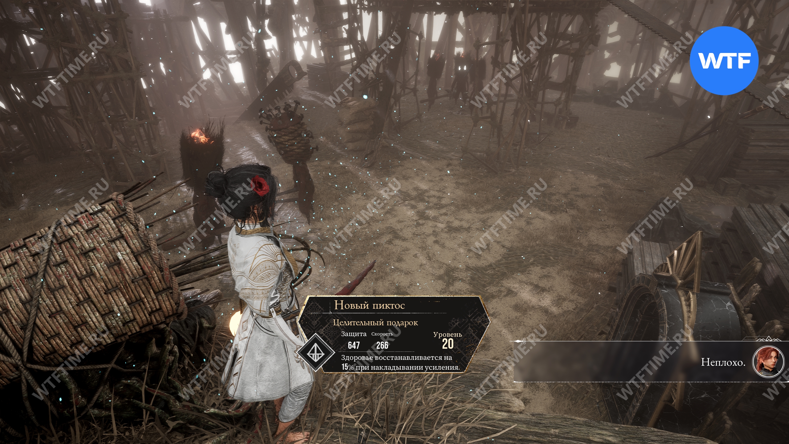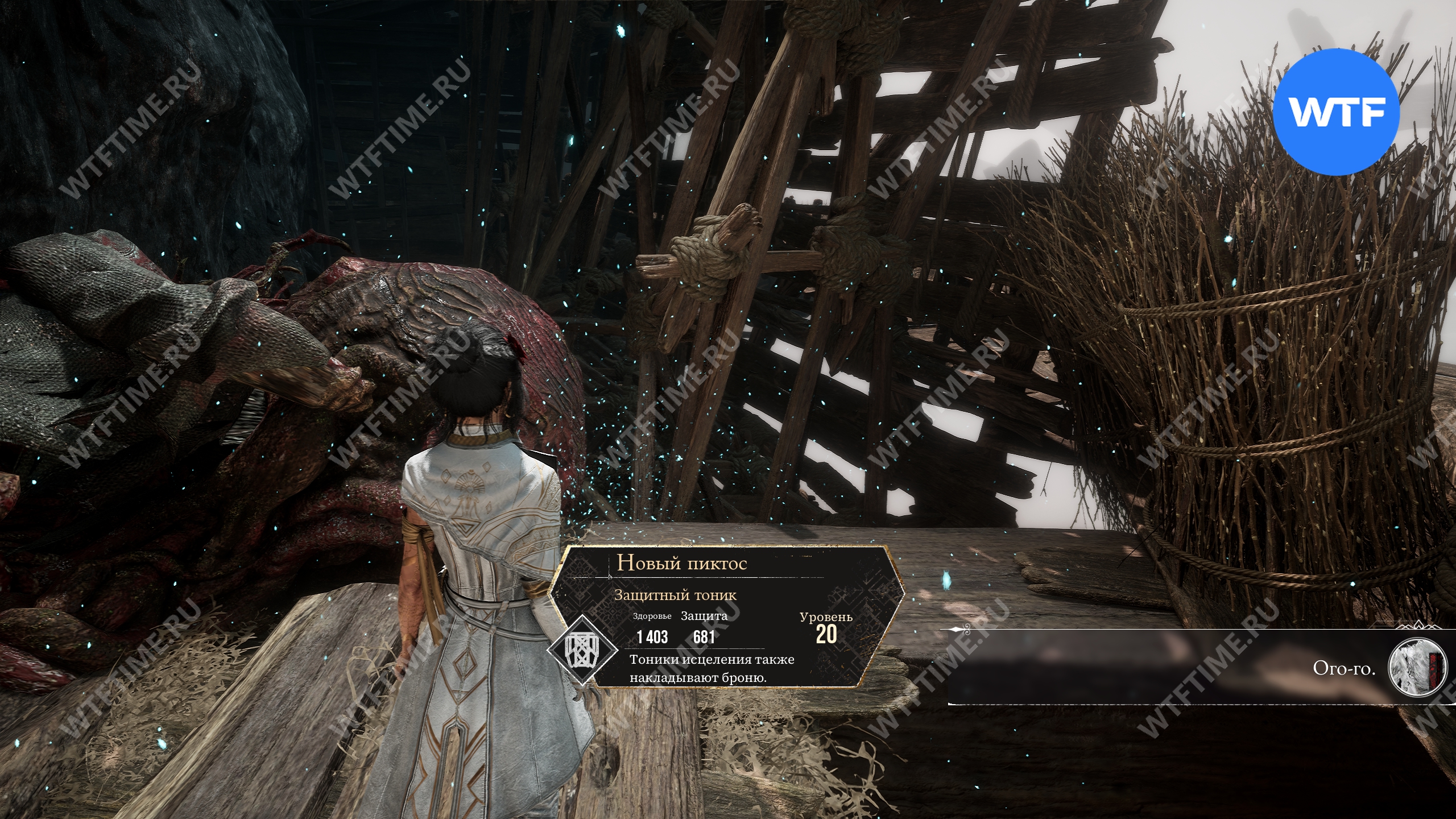 От флага бегите вперед и спуститесь вниз по мосту. Затем сразу же поверните направо и пройдите по деревянным доскам к пиктосу «Защитный тоник» (уровень 20, здоровье 1403, защита 681), с которым тоники исцеления также накладывают броню.