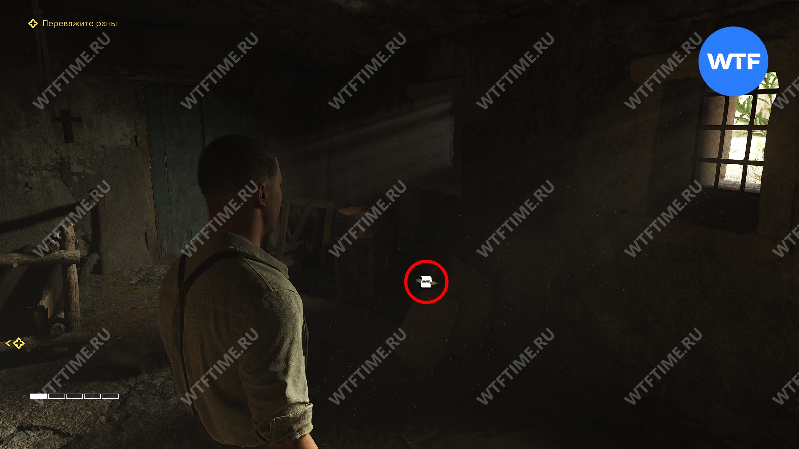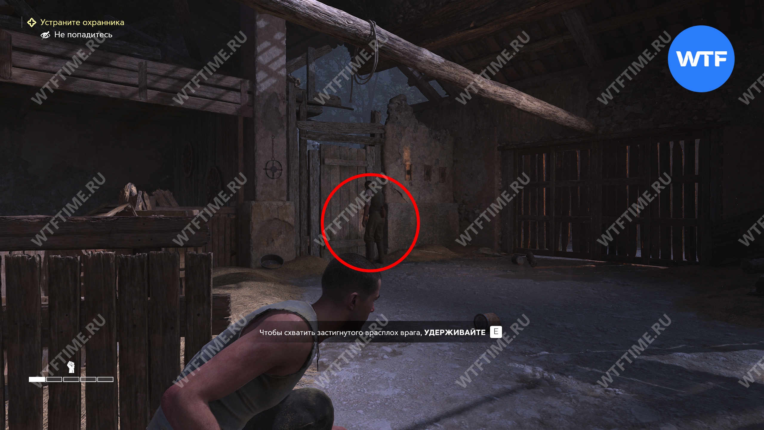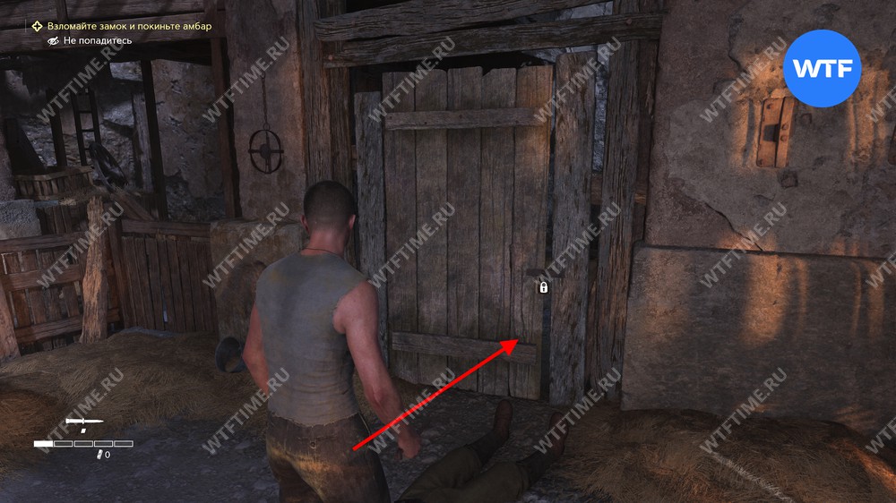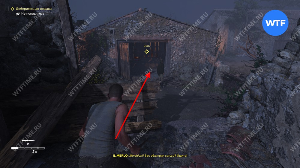 События главы начинаются в амбаре, где Энцо настигли Il Merlo и его люди. Первым делом идите налево и спуститесь вниз по лестнице. Затем подкрадитесь к стоящему там охраннику и обезвредьте его.