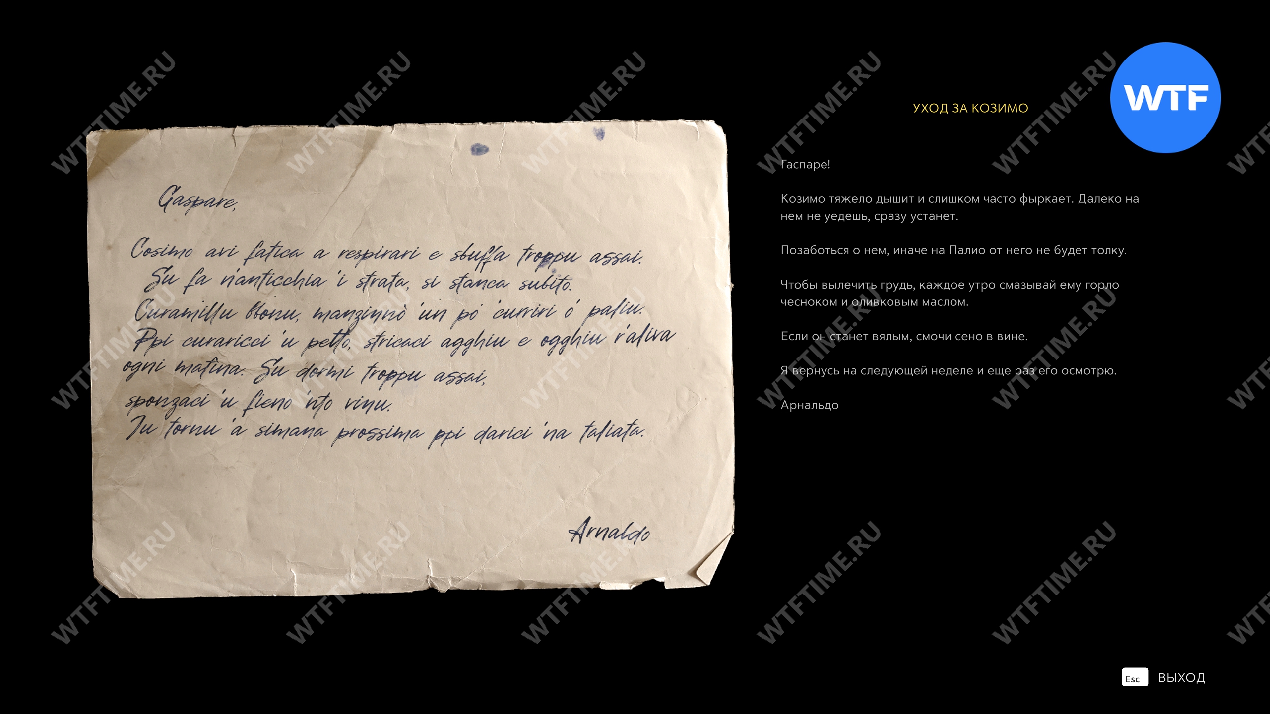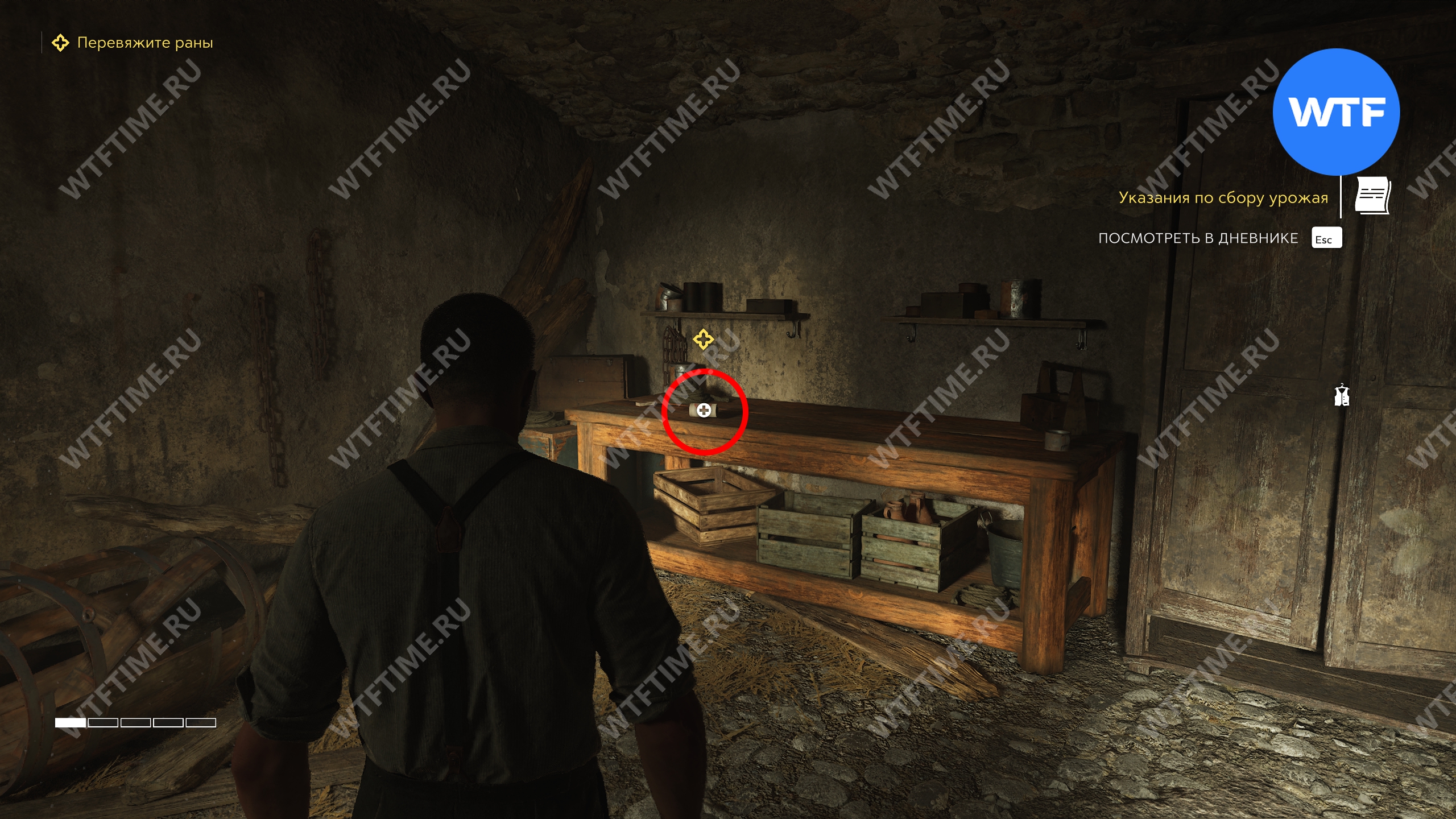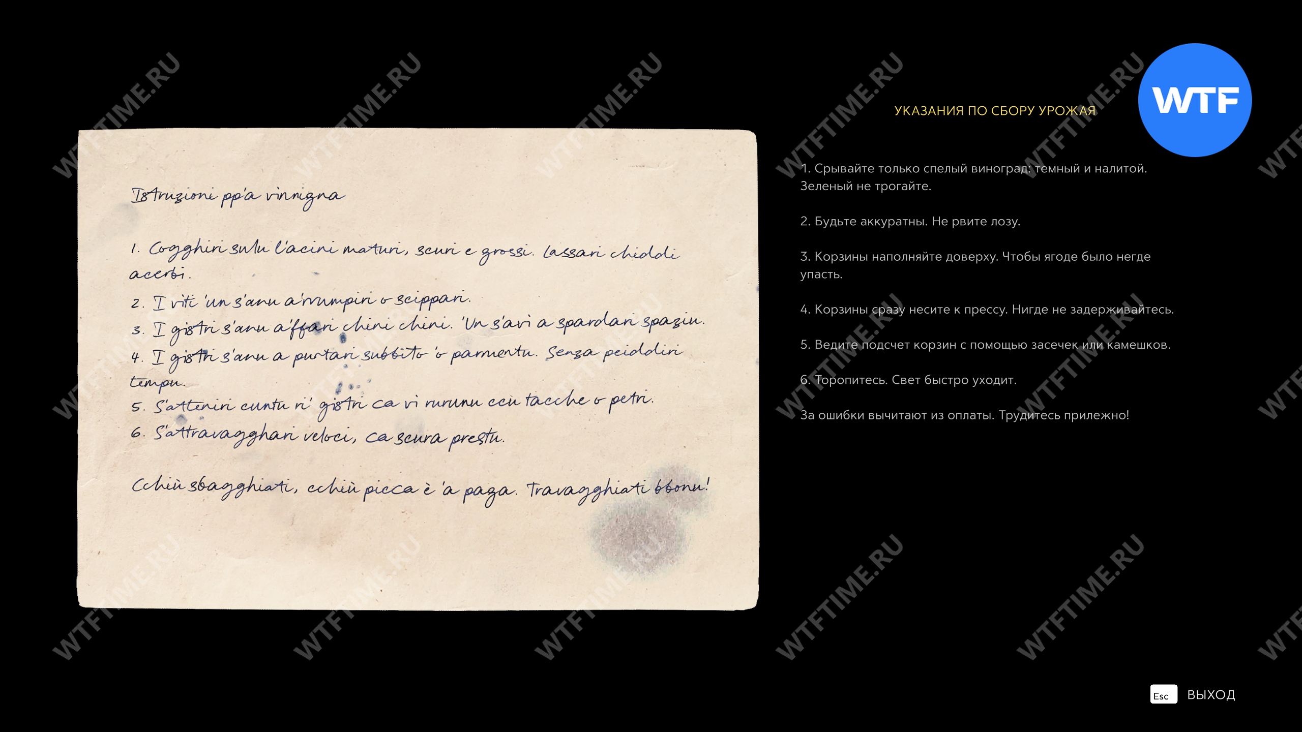 Утром вас разбудит Чезаре, которому поручили пригрузить вас работой. Подойдите к шкафу и оденьте костюм работника виноградника. На столах рядом вы можете подобрать записку «Указания по сбору урожая», а также бинты, чтобы подлечиться.