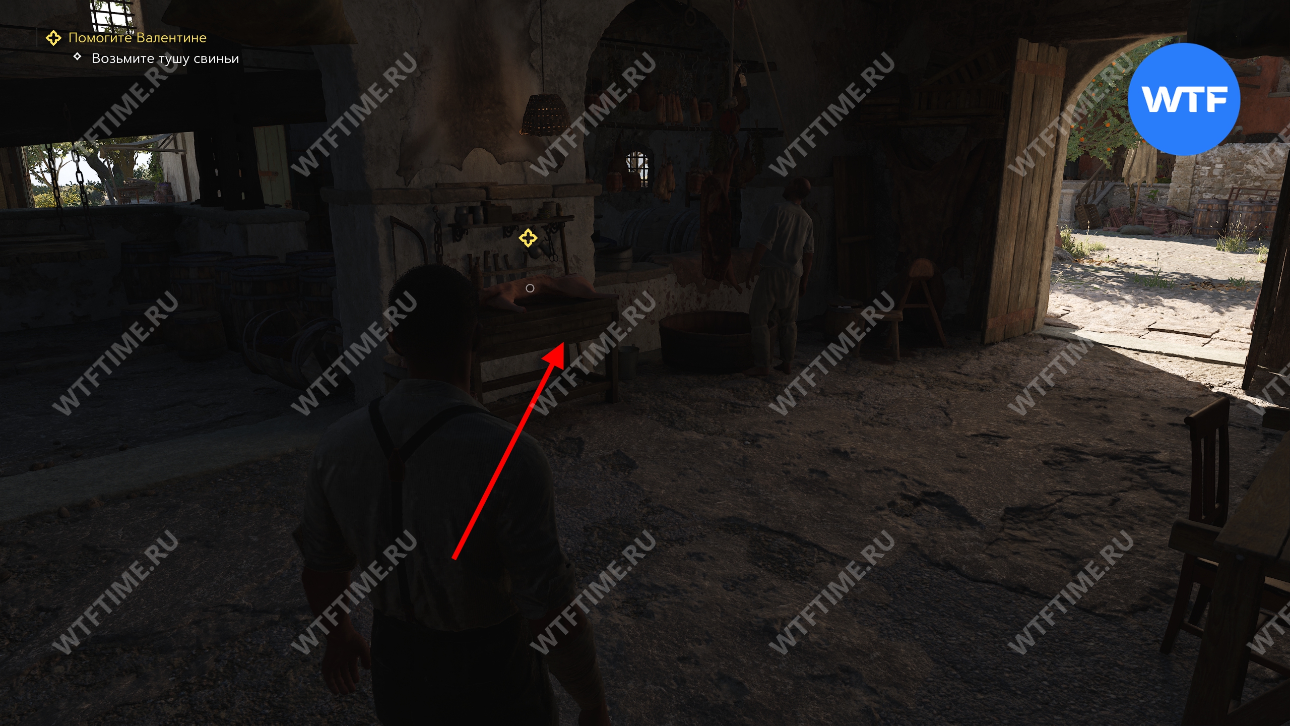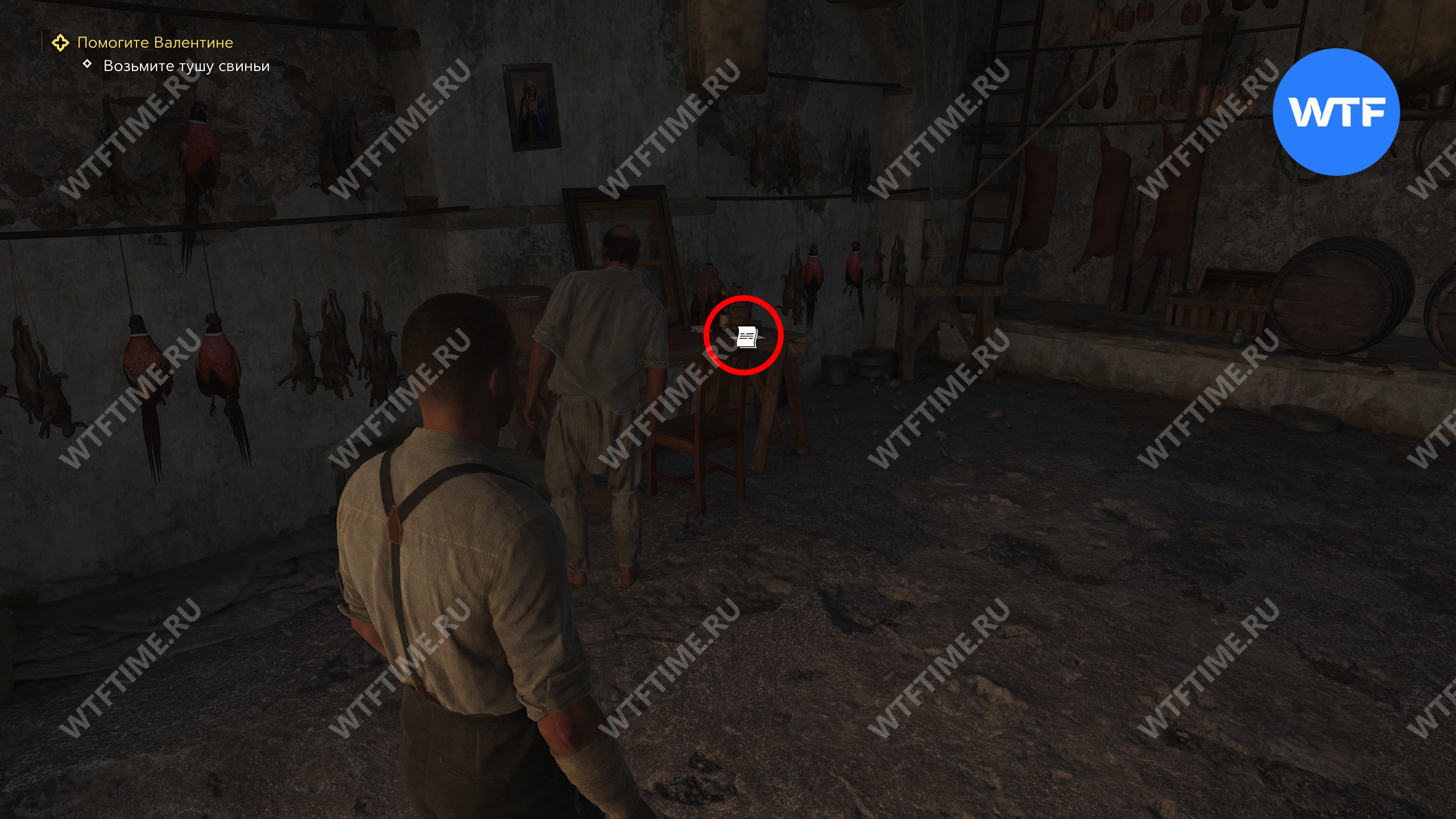 Войдя на кухню, подберите записку «Подарок от Гулотты» на столике слева, а затем тушу свиньи на столе справа.