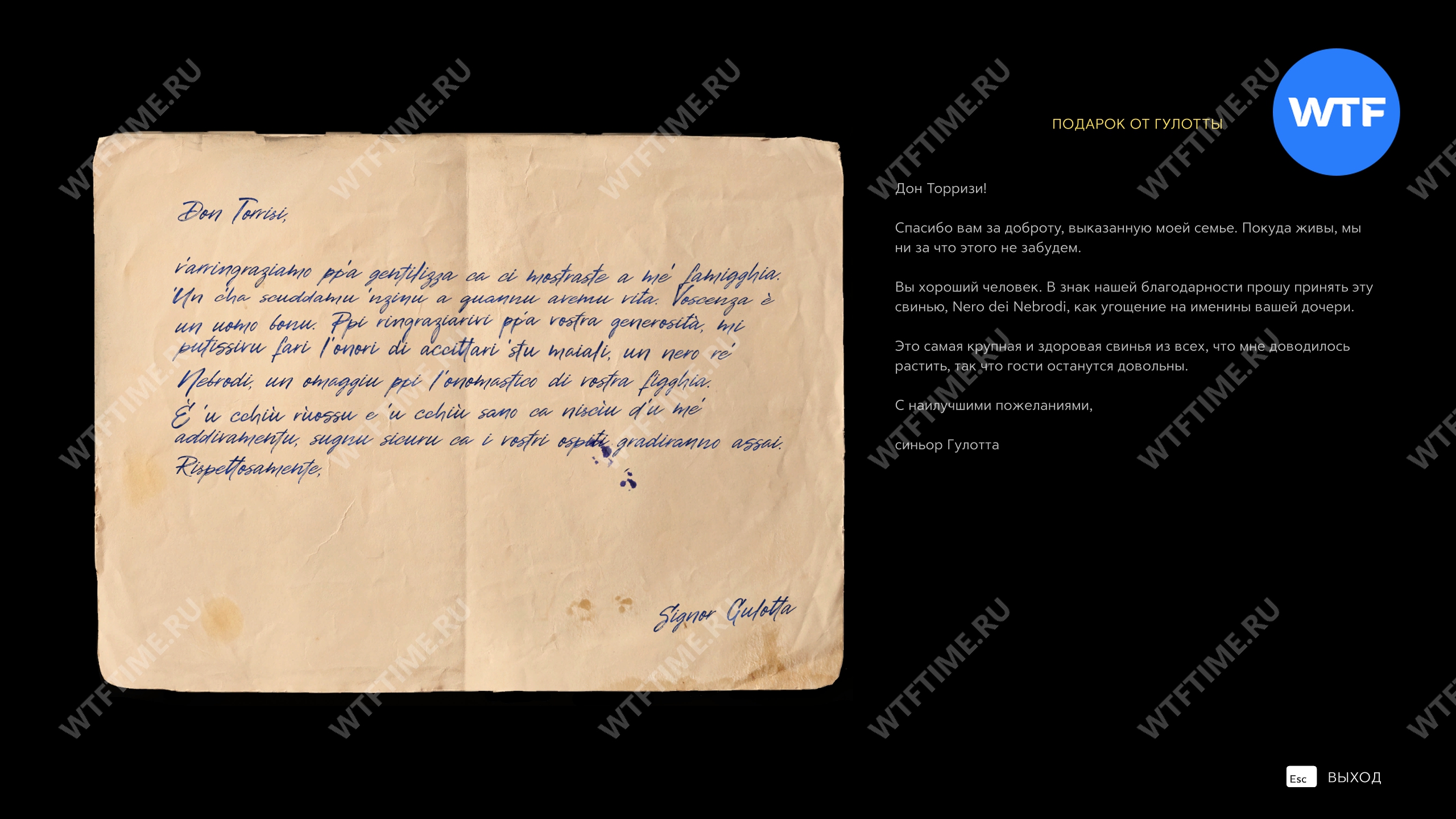 Затем примите ванну — это запустит кат сцену с пиром, во время которой Энцо узнает, что девушка, встреченная им ранее — дочь дона Торризи. На этом прохождение главы 1 «Famiglia» в Mafia The Old Country будет завершено и вы сможете перейти к главе «Palio».