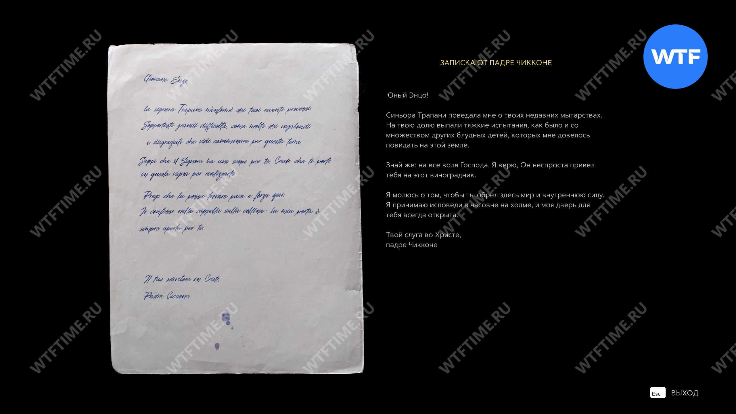 Следуйте за квестовым маркером и поговорите с падре Чикконе по пути. После этого зайдите в свою комнату и заберите со стола талисман «Святая агата» (дает неуязвимость на короткое время, когда вы близки к смерти), а также записку «Записка от падре Чикконе».