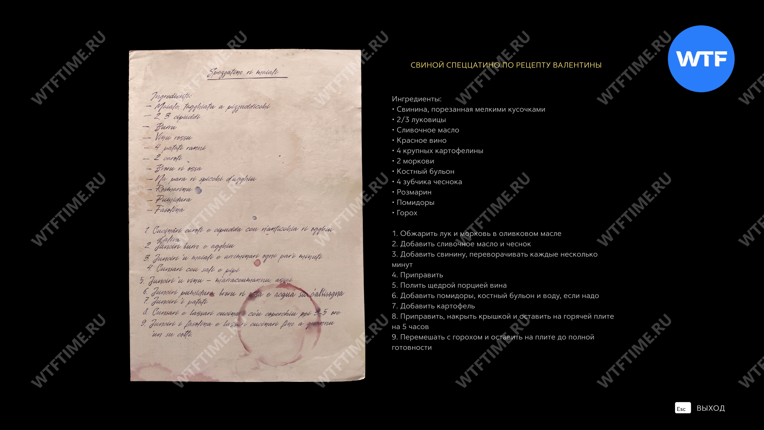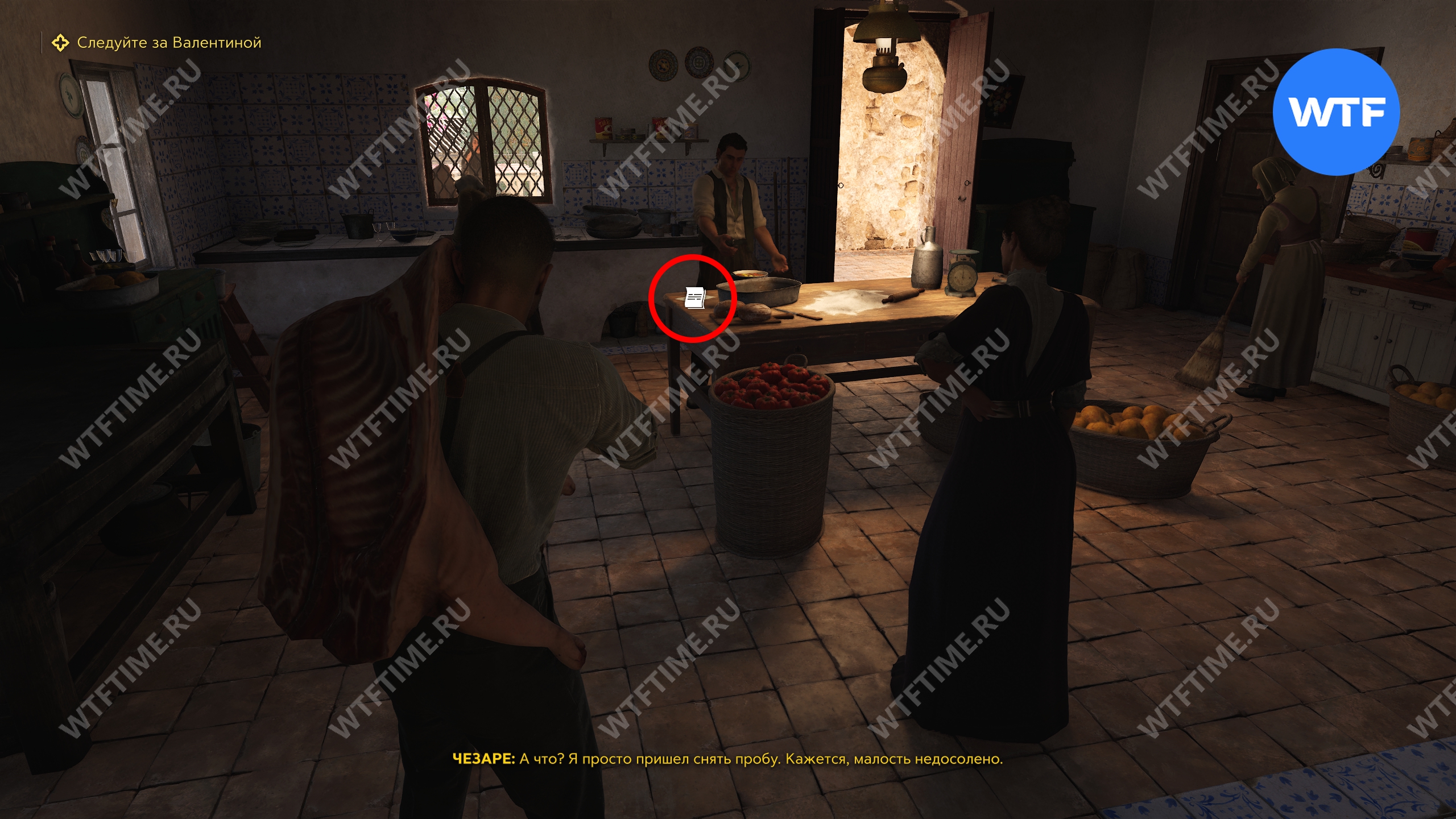 Продолжайте следовать за Валентиной, чтобы отнести свинью и большой дом. Когда вы доберетесь до места, на столе возле Чезаре будет лежать записка «Свиной спеццатино по рецепту Валентины».