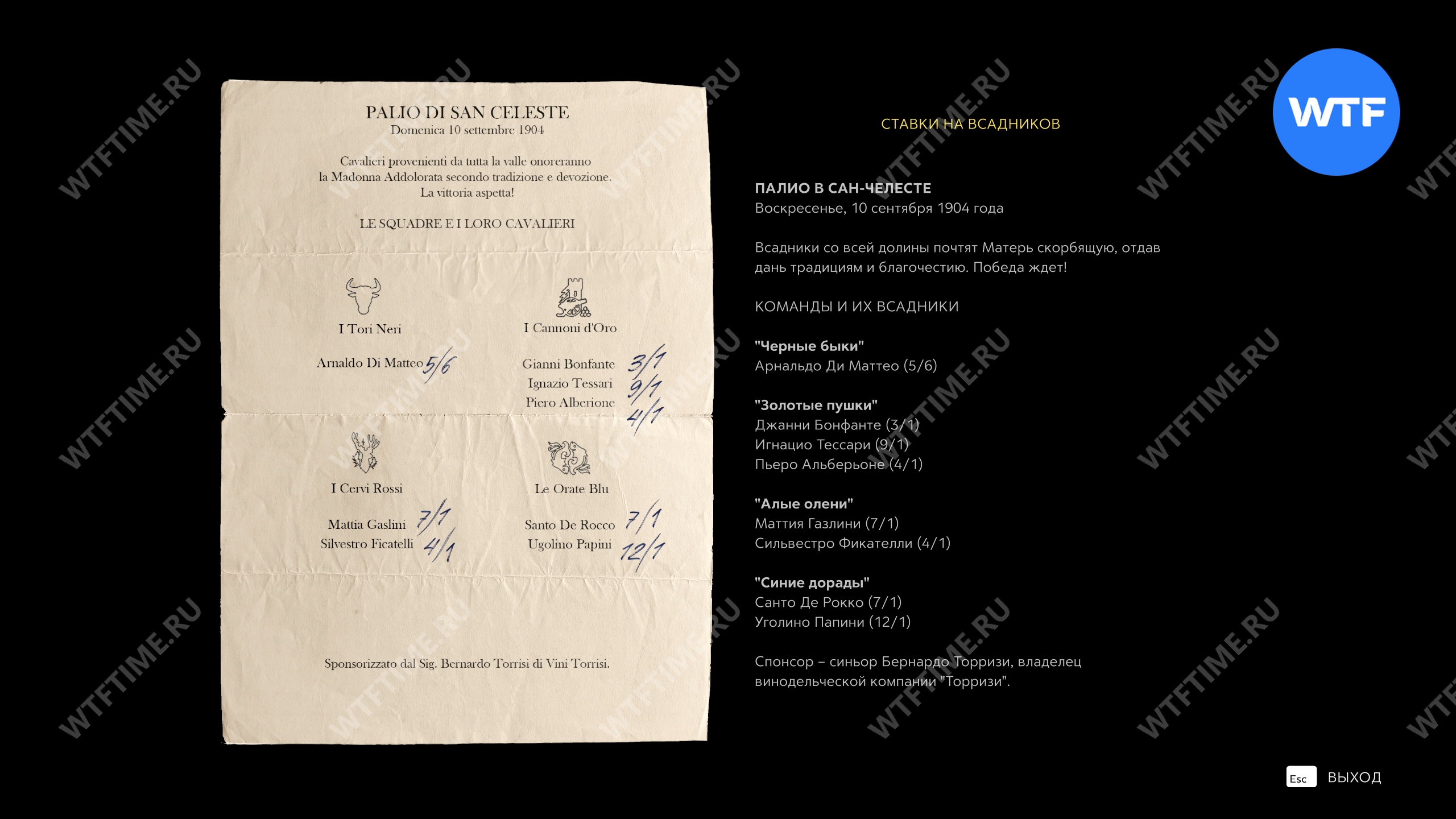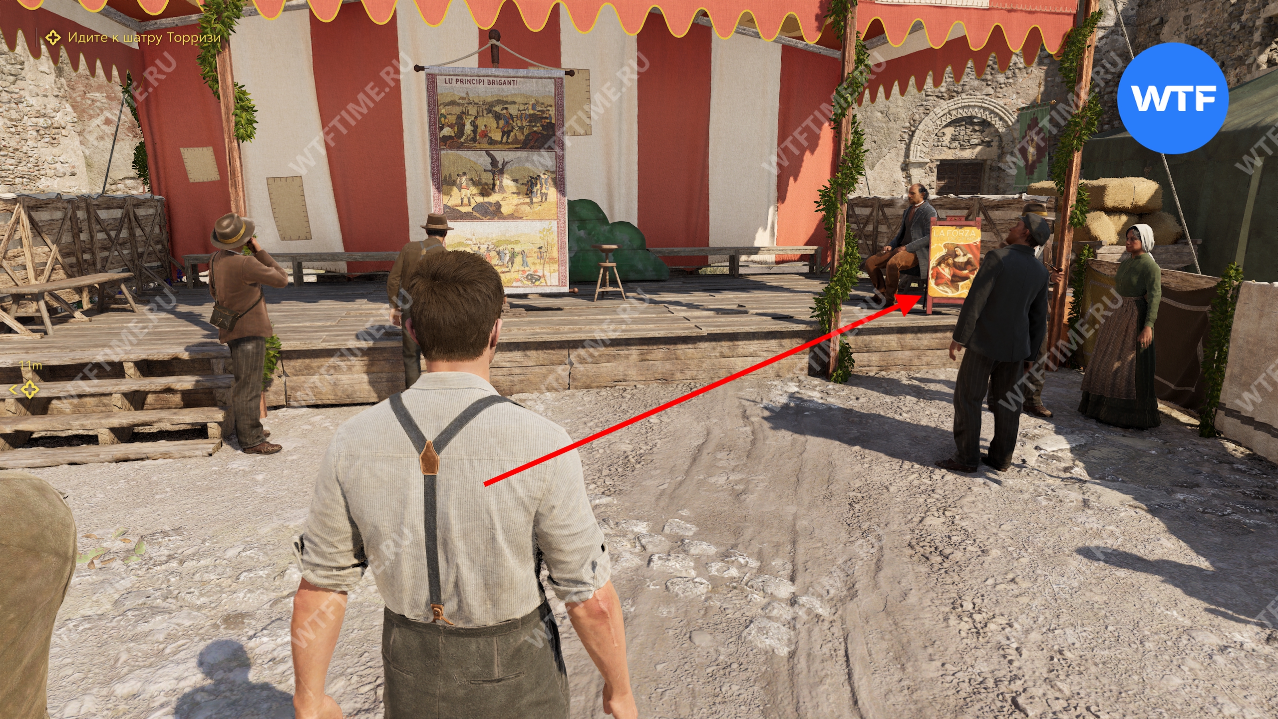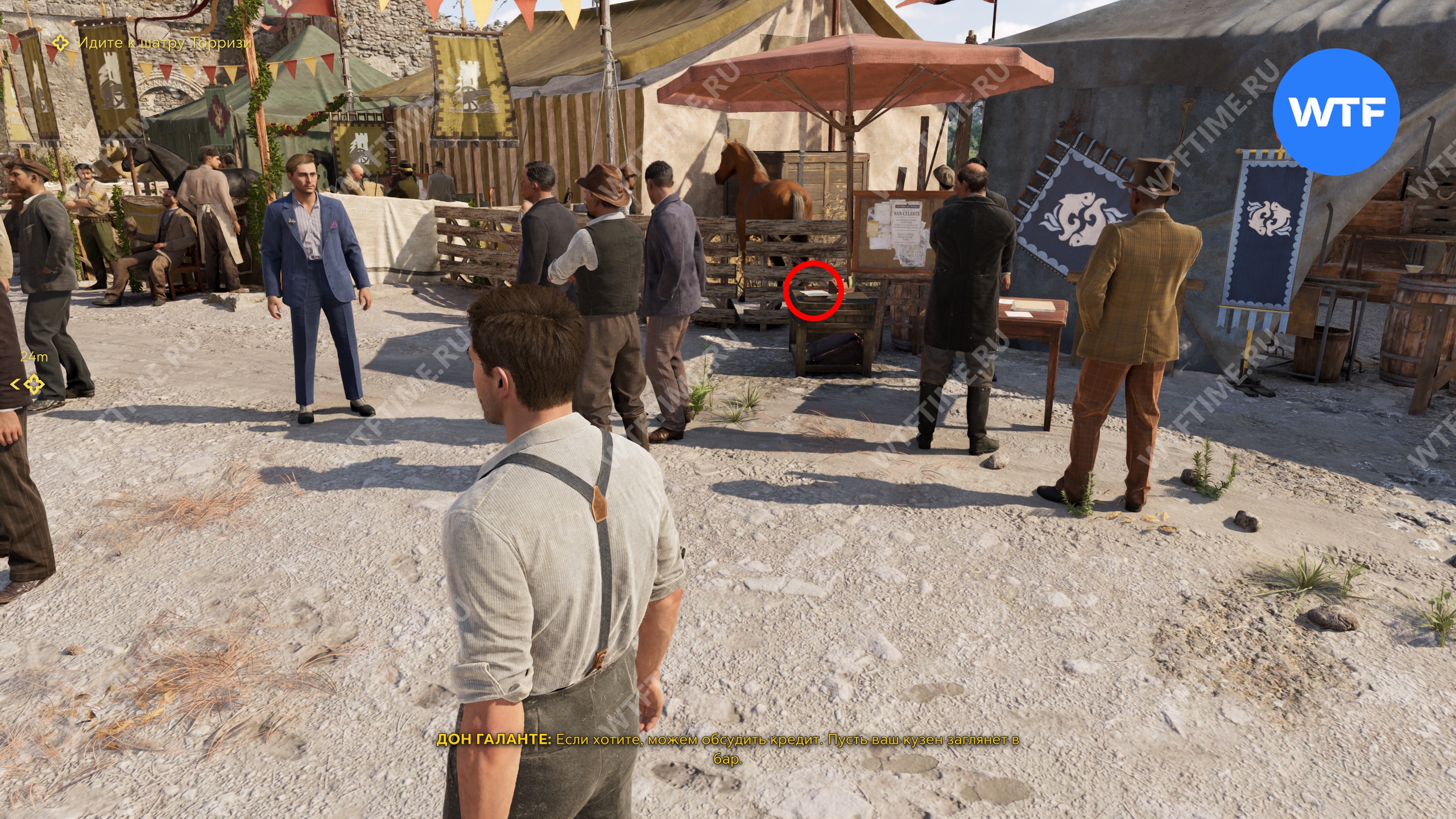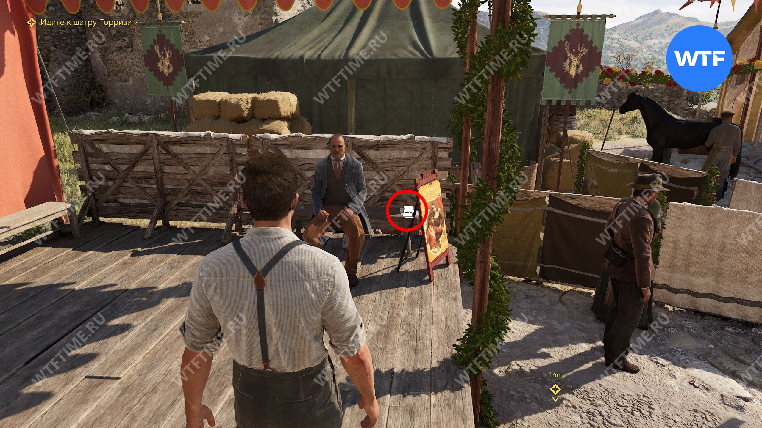 Добравшись до места, привяжите лошадь, после чего Лука разрешит вам прогуляться. Следуйте за квестовым маркером к шатру Торризи и по пути прихватите записку «Ставки на всадников» с ящика по правой стороне.