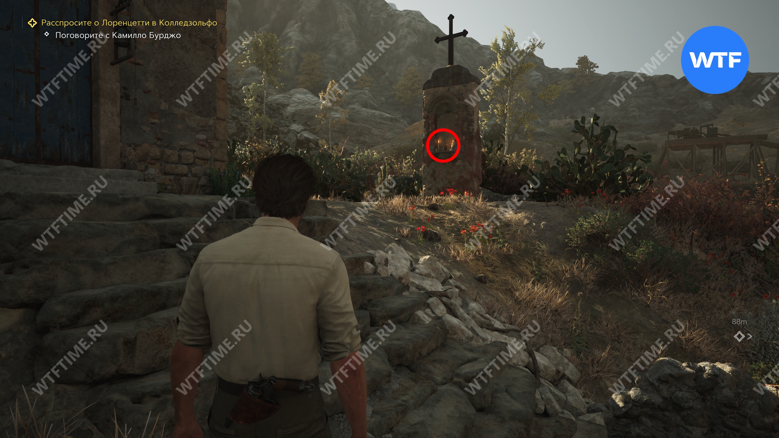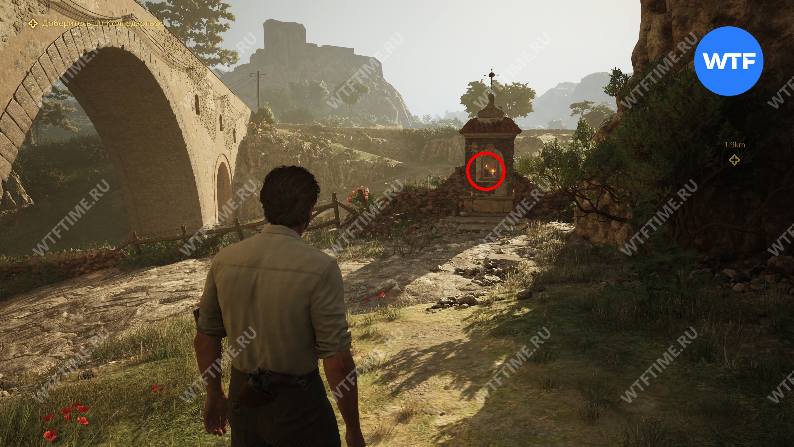 Проехав от лавки Паскуале чуть дальше по дороге, вы увидите каменный мост. Справа от въезда на него есть калитка, ведущая в небольшому алтарю, где лежит карта со святыми «Святой Элигий».