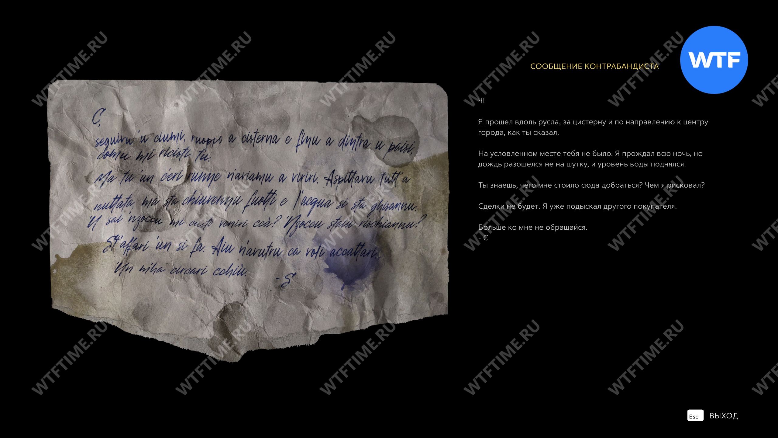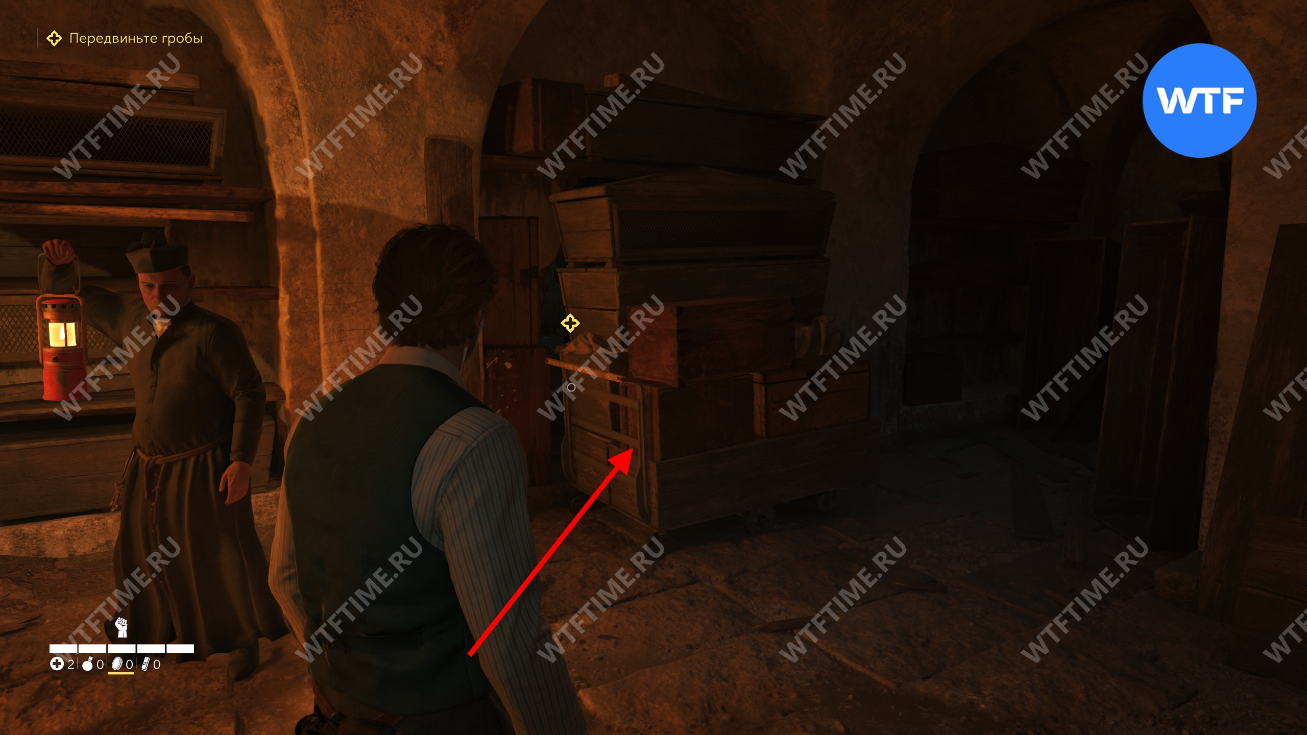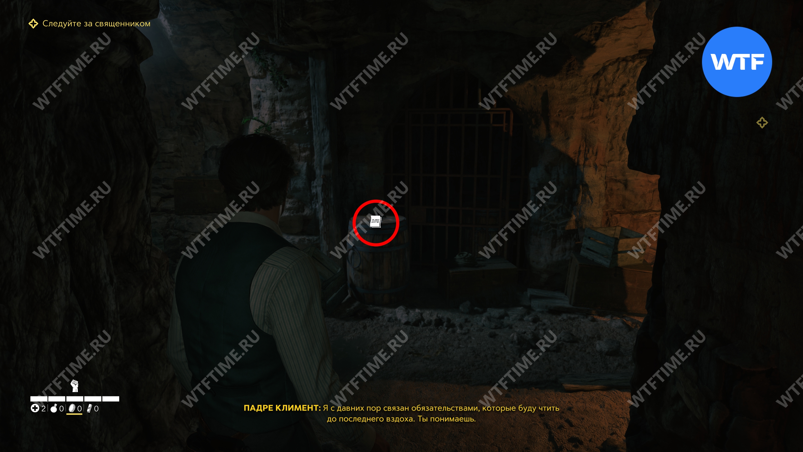 Следуйте за священником и спускайтесь в подвал. Продолжайте идти вперед, пока не передвинете тележку с гробами, блокирующую путь. После этого записка «Сообщение контрабандиста» будет на бочке прямо перед вами.