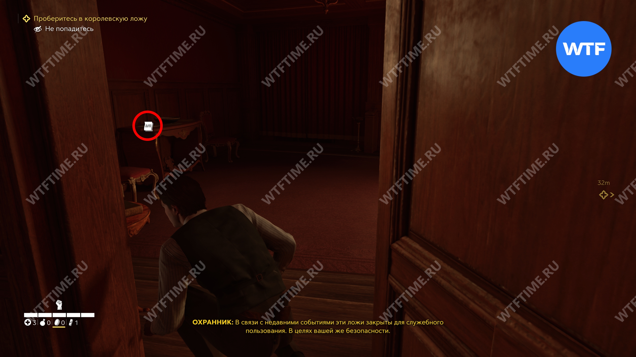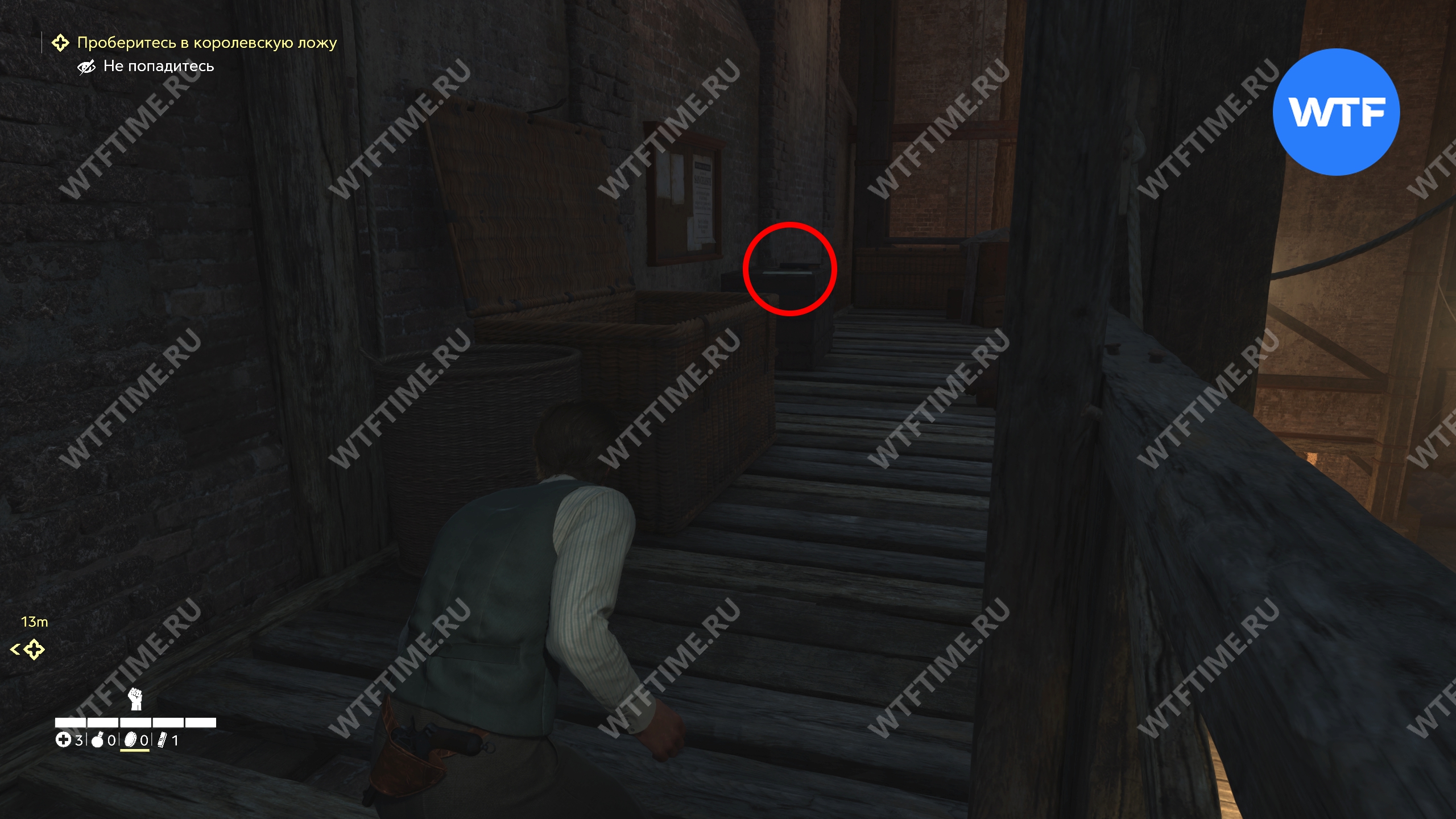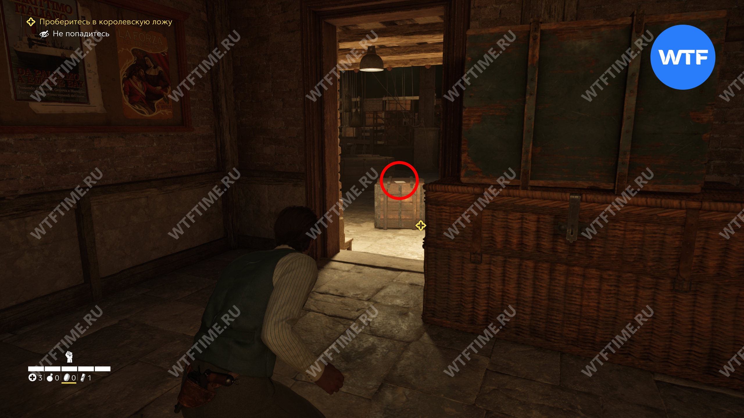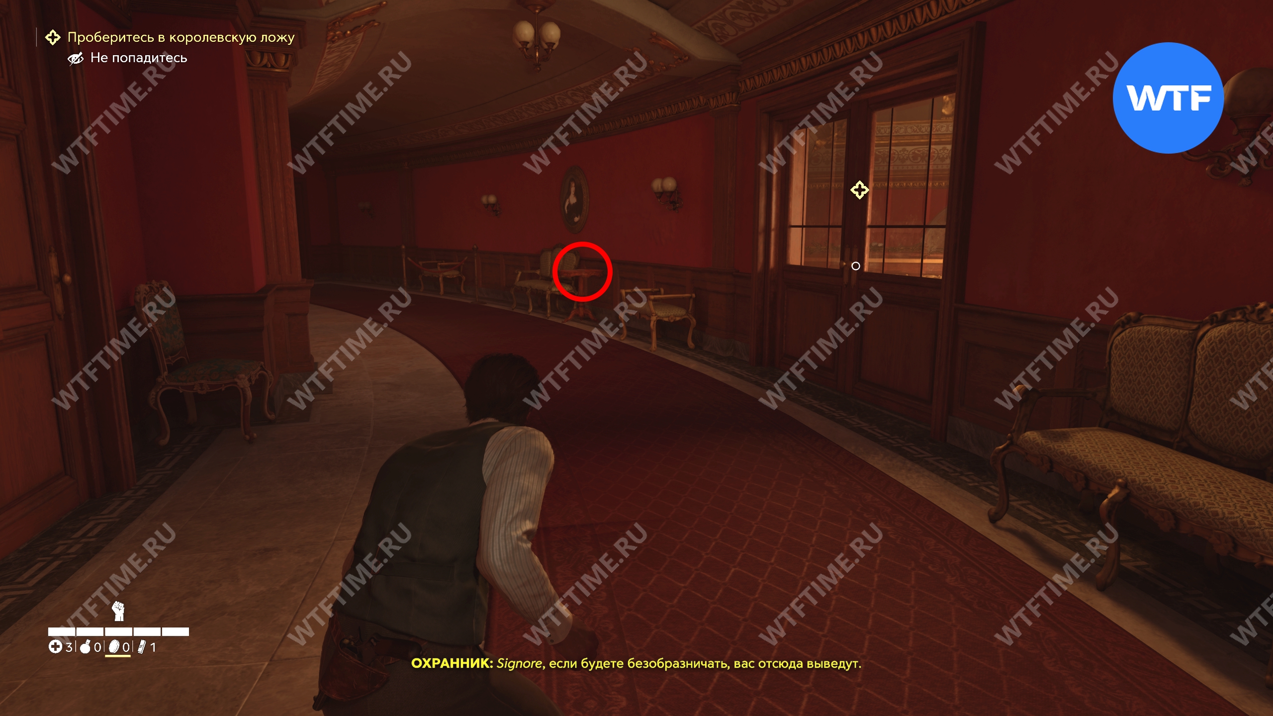Зачистив канализацию от охранников, поднимитесь по длинной лестнице в оперный театр. Затем вы должны будете подвинуть тележку, чтобы пройти дальше. Сразу после этого посмотрите направо и подберите бусину «Paziente», повышающую точность прицеливания.