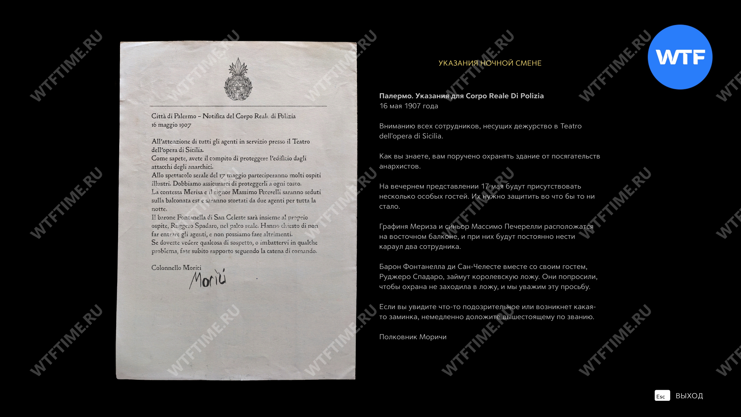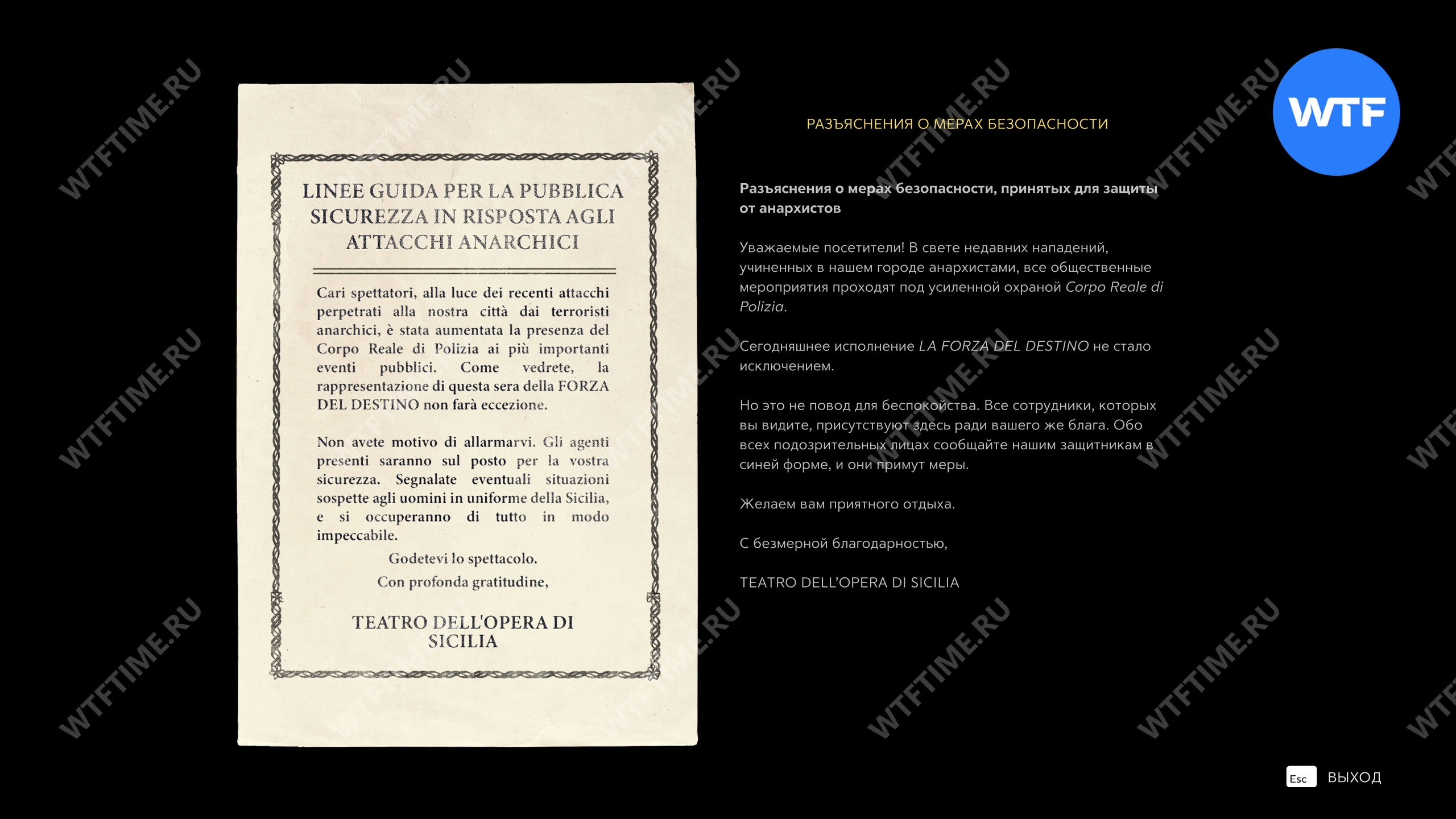 Пройдя через дверь, вы окажетесь в основных помещениях оперного театра. Из коридора сверните в первую дверь слева и заберите записку «Разъяснение о мерах безопасности» со столика слева от вас.