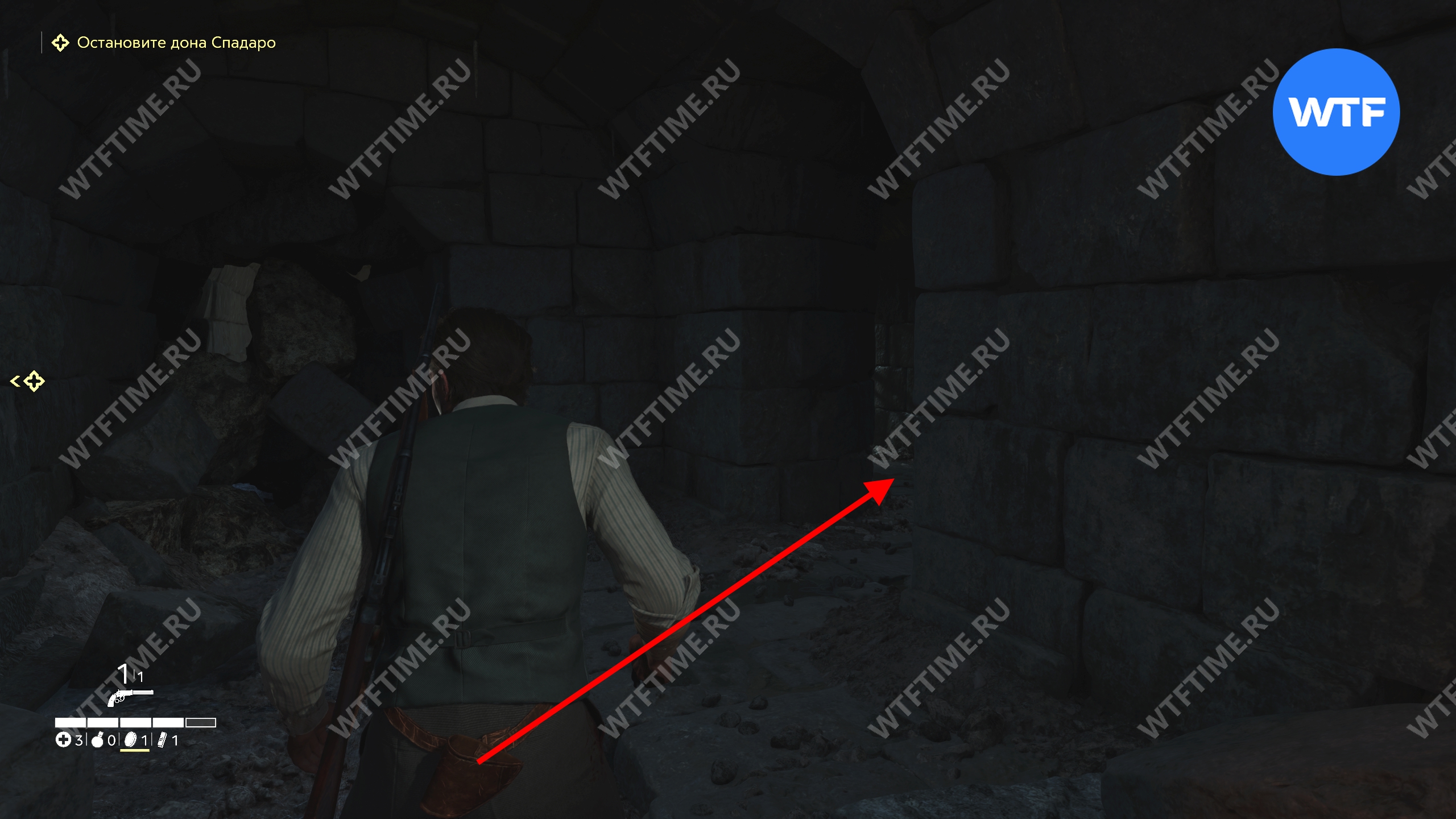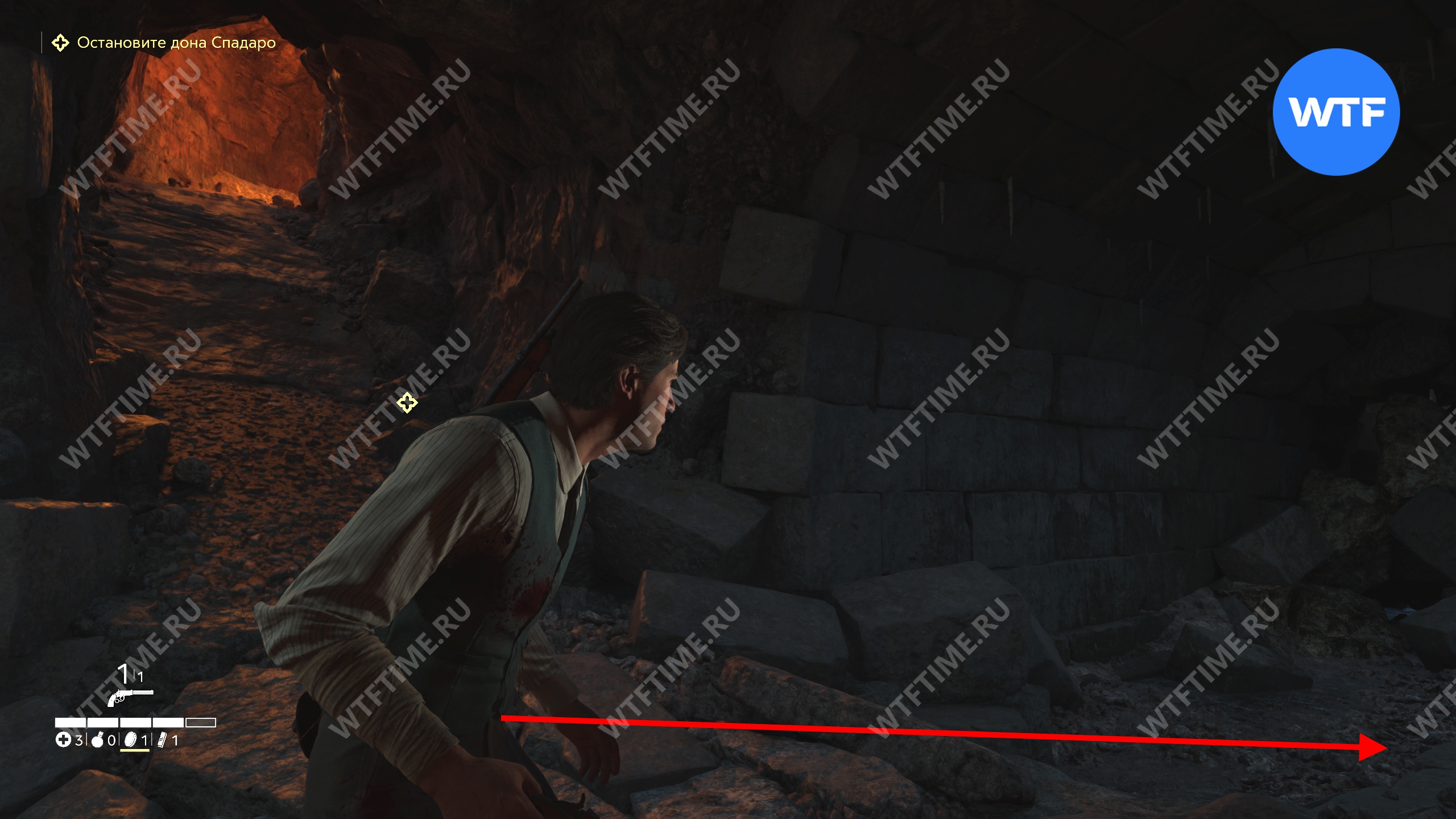 Преследуйте Спадаро по зданию оперы, отстреливаясь от врагов, пока снова не спуститесь в канализацию. Затем доберитесь до приметного каменного подъема, освещенного факелом, со скриншота ниже (это прямо перед областью, где вы должны двигаться в воде).